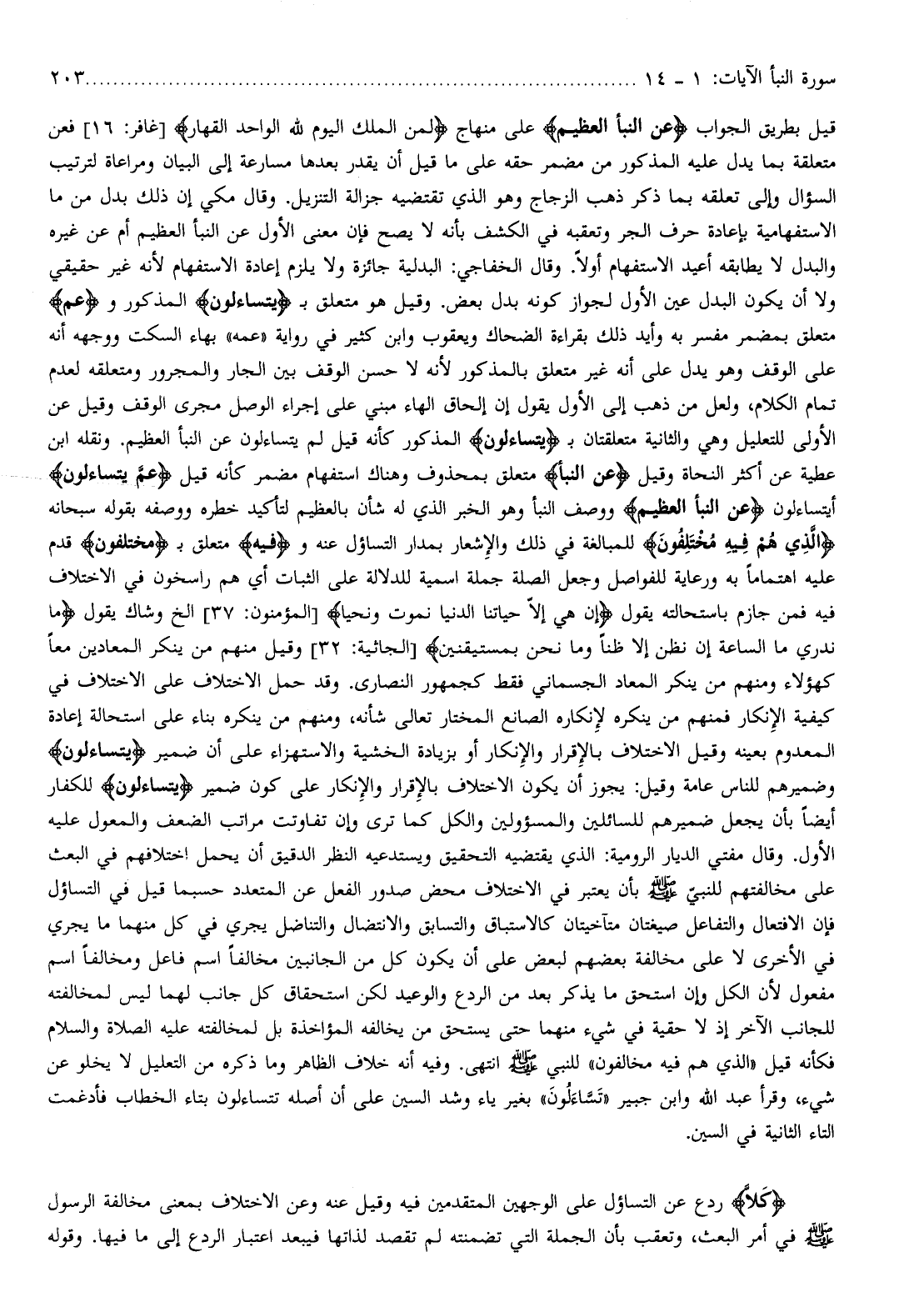 قيل بطريق الجواب عَنِ النَّبَإِ الْعَظِيمِ على منهاج لِمَنِ الْمُلْكُ الْيَوْمَ لِلَّهِ الْواحِدِ الْقَهَّارِ [غافر: 16] فعن متعلقة بما يدل عليه المذكور من مضمر حقه على ما قيل أن يقدر بعدها مسارعة إلى البيان ومراعاة لترتيب السؤال وإلى تعلقه بما ذكر ذهب الزجاج وهو الذي تقتضيه جزالة التنزيل. وقال مكي إن ذلك بدل من ما الاستفهامية بإعادة حرف الجر وتعقبه في الكشف بأنه لا يصح فإن معنى الأول عن النبأ العظيم أم عن غيره والبدل لا يطابقه أعيد الاستفهام أولا. وقال الخفاجي: البدلية جائزة ولا يلزم إعادة الاستفهام لأنه غير حقيقي ولا أن يكون البدل عين الأول لجواز كونه بدل بعض. وقيل هو متعلق ب يَتَساءَلُونَ المذكور وعَمَّ متعلق بمضمر مفسر به وأيد ذلك بقراءة الضحاك ويعقوب وابن كثير في رواية «عمه» بهاء السكت ووجهه أنه على الوقف وهو يدل على أنه غير متعلق بالمذكور لأنه لا حسن الوقف بين الجار والمجرور ومتعلقه لعدم تمام الكلام، ولعل من ذهب إلى الأول يقول إن إلحاق الهاء مبني على إجراء الوصل مجرى الوقف وقيل عن الأولى للتعليل وهي والثانية متعلقتان ب يَتَساءَلُونَ المذكور كأنه قيل لم يتساءلون عن النبأ العظيم. ونقله ابن عطية عن أكثر النحاة وقيل عَنِ النَّبَإِ متعلق بمحذوف وهناك استفهام مضمر كأنه قيل عَمَّ يَتَساءَلُونَ أيتساءلون عَنِ النَّبَإِ الْعَظِيمِ ووصف النبأ وهو الخبر الذي له شأن بالعظيم لتأكيد خطره ووصفه بقوله سبحانه الَّذِي هُمْ فِيهِ مُخْتَلِفُونَ للمبالغة في ذلك والإشعار بمدار التساؤل عنه وفِيهِ متعلق ب مُخْتَلِفُونَ قدم عليه اهتماما به ورعاية للفواصل وجعل الصلة جملة اسمية للدلالة على الثبات أي هم راسخون في الاختلاف فيه فمن جازم باستحالته يقول إِنْ هِيَ إِلَّا حَياتُنَا الدُّنْيا نَمُوتُ وَنَحْيا [المؤمنون: 37] إلخ وشاك يقول ما نَدْرِي مَا السَّاعَةُ إِنْ نَظُنُّ إِلَّا ظَنًّا وَما نَحْنُ بِمُسْتَيْقِنِينَ [الجاثية: 32] وقيل منهم من ينكر المعادين معا كهؤلاء ومنهم من ينكر المعاد الجسماني فقط كجمهور النصارى. وقد حمل الاختلاف على الاختلاف في كيفية الإنكار فمنهم من ينكره لإنكاره الصانع المختار تعالى شأنه، ومنهم من ينكره بناء على استحالة إعادة المعدوم بعينه وقيل الاختلاف بالإقرار والإنكار أو بزيادة الخشية والاستهزاء على أن ضمير يَتَساءَلُونَ وضميرهم للناس عامة وقيل: يجوز أن يكون الاختلاف بالإقرار والإنكار على كون ضمير يَتَساءَلُونَ للكفار أيضا بأن يجعل ضميرهم للسائلين والمسئولين والكل كما ترى وإن تفاوتت مراتب الضعف والمعول عليه الأول. وقال مفتي الديار الرومية: الذي يقتضيه التحقيق ويستدعيه النظر الدقيق أن يحمل اختلافهم في البعث على مخالفتهم للنبيّ صلّى الله عليه وسلم بأن يعتبر في الاختلاف محض صدور الفعل عن المتعدد حسبما قيل في التساؤل فإن الافتعال والتفاعل صيغتان متآخيتان كالاستباق