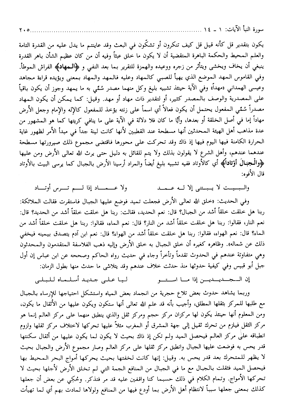 وربما يشاهد حدوث بعض تلاع حجرية من انجماد بعض المياه واستشكل احتياجها للإرساء بالجبال مع طلبها للمركز بثقلها المطلق، وأجيب بأنه قد علم الله تعالى أنها ستكون ويكون عليها من الأثقال ما يكون، ومن المعلوم أنها حينئذ يكون لها مركزان مركز حجم ومركز ثقل والذي ينطبق منهما على مركز العالم إنما هو مركز الثقل فيلزم من تحرك ثقيل إلى جهة المشرق أو المغرب مثلا عليها تحركها لاختلاف مركز ثقلها ولزوم انطباقه على مركز العالم فيحصل الميد ولم تكن إذ ذاك بحيث لا يكون لما يكون عليها من أثقال سكنتها قدر يحس به فوضعت عليها الجبال وانطبق مركز ثقلها على مركز العالم وصار مجموع الأرض والجبال بحيث لا يظهر للمتحرك بعد قدر يحس به. وقيل: إنها كانت لخفتها بحيث يحركها أمواج البحر المحيط بها فيحصل الميد فثقلت بالجبال مع ما في الجبال من المنافع الجمة التي لم تخلق الأرض لأجلها بحيث لا تحركها الأمواج. وتمام الكلام في ذلك حسبما كنا واقفين عليه قد مر فتذكر. وحكي عن بعض أن جعلها كذلك بمعنى جعلها سببا لانتظام أهل الأرض بما أودع فيها من المنافع ولولاها لمادت بهم أي لما تهيأت