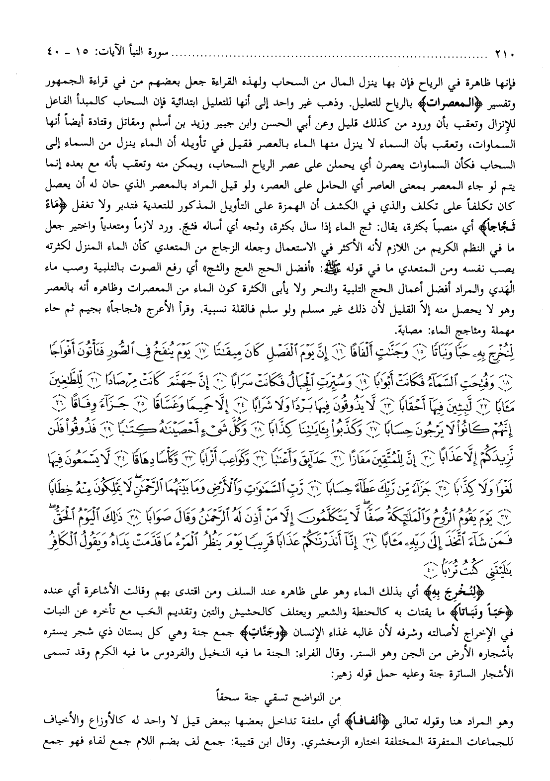 لِنُخْرِجَ بِهِ أي بذلك الماء وهو على ظاهره عند السلف ومن اقتدى بهم وقالت الأشاعرة أي عنده حَبًّا وَنَباتاً ما يقتات به كالحنطة والشعير ويعتلف كالحشيش والتبن وتقديم الحب مع تأخره عن النبات في الإخراج لأصالته وشرفه لأن غالبه غذاء الإنسان وَجَنَّاتٍ جمع جنة وهي كل بستان ذي شجر يستره بأشجاره الأرض من الجن وهو الستر. وقال الفراء: الجنة ما فيه النخيل والفردوس ما فيه الكرم وقد تسمى الأشجار الساترة جنة وعليه حمل قوله زهير: