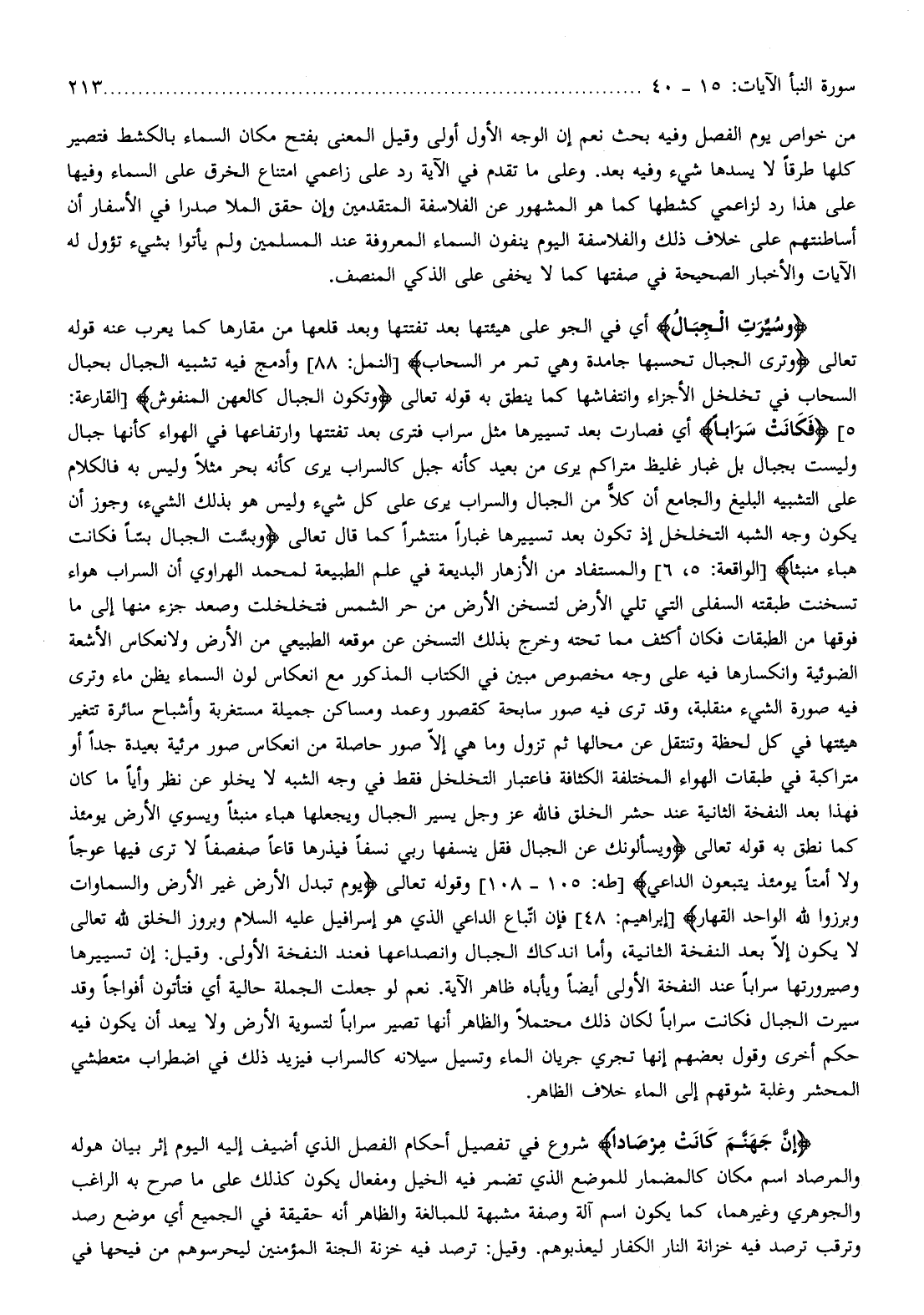 5] فَكانَتْ سَراباً أي فصارت بعد تسييرها مثل سراب فترى بعد تفتتها وارتفاعها في الهواء كأنها جبال وليست بجبال بل غبار غليظ متراكم يرى من بعيد كأنه جبل كالسراب يرى كأنه بحر مثلا وليس به فالكلام على التشبيه البليغ والجامع أن كلّا من الجبال والسراب يرى على كل شيء وليس هو بذلك الشيء، وجوز أن يكون وجه الشبه التخلخل إذ تكون بعد تسييرها غبارا منتشرا كما قال تعالى وَبُسَّتِ الْجِبالُ بَسًّا فَكانَتْ هَباءً مُنْبَثًّا [الواقعة: 5، 6] والمستفاد من الأزهار البديعة في علم الطبيعة لمحمد الهراوي أن السراب هواء تسخنت طبقته السفلى التي تلي الأرض لتسخن الأرض من حر الشمس فتخلخلت وصعد جزء منها إلى ما فوقها من الطبقات فكان أكثف مما تحته وخرج بذلك التسخن عن موقعه الطبيعي من الأرض ولانعكاس الأشعة الضوئية وانكسارها فيه على وجه مخصوص مبين في الكتاب المذكور مع انعكاس لون السماء يظن ماء وترى فيه صورة الشيء منقلبة، وقد ترى فيه صور سابحة كقصور وعمد ومساكن جميلة مستغربة وأشباح سائرة تتغير هيئتها في كل لحظة وتنتقل عن محالها ثم تزول وما هي إلّا صور حاصلة من انعكاس صور مرئية بعيدة جدا أو متراكبة في طبقات الهواء المختلفة الكثافة فاعتبار التخلخل فقط في وجه الشبه لا يخلو عن نظر وأيا ما كان فهذا بعد النفخة الثانية عند حشر الخلق فالله عز وجل يسير الجبال ويجعلها هباء منبثا ويسوي الأرض يومئذ كما نطق به قوله تعالى وَيَسْئَلُونَكَ عَنِ الْجِبالِ فَقُلْ يَنْسِفُها رَبِّي نَسْفاً فَيَذَرُها قاعاً صَفْصَفاً لا تَرى فِيها عِوَجاً وَلا أَمْتاً يَوْمَئِذٍ يَتَّبِعُونَ الدَّاعِيَ [طه: 105- 108] وقوله تعالى يَوْمَ تُبَدَّلُ الْأَرْضُ غَيْرَ الْأَرْضِ وَالسَّماواتُ وَبَرَزُوا لِلَّهِ الْواحِدِ الْقَهَّارِ [إبراهيم: 48] فإن اتّباع الداعي الذي هو إسرافيل عليه السلام وبروز الخلق لله تعالى لا يكون إلّا بعد النفخة الثانية، وأما اندكاك الجبال وانصداعها فعند النفخة الأولى. وقيل: إن تسييرها وصيرورتها سرابا عند النفخة الأولى أيضا ويأباه ظاهر الآية. نعم لو جعلت الجملة حالية أي فتأتون أفواجا وقد سيرت الجبال فكانت سرابا لكان ذلك محتملا والظاهر أنها تصير سرابا لتسوية الأرض ولا يبعد أن يكون فيه حكم أخرى وقول بعضهم إنها تجري جريان الماء وتسيل سيلانه كالسراب فيزيد ذلك في اضطراب متعطشي المحشر وغلبة شوقهم إلى الماء خلاف الظاهر.