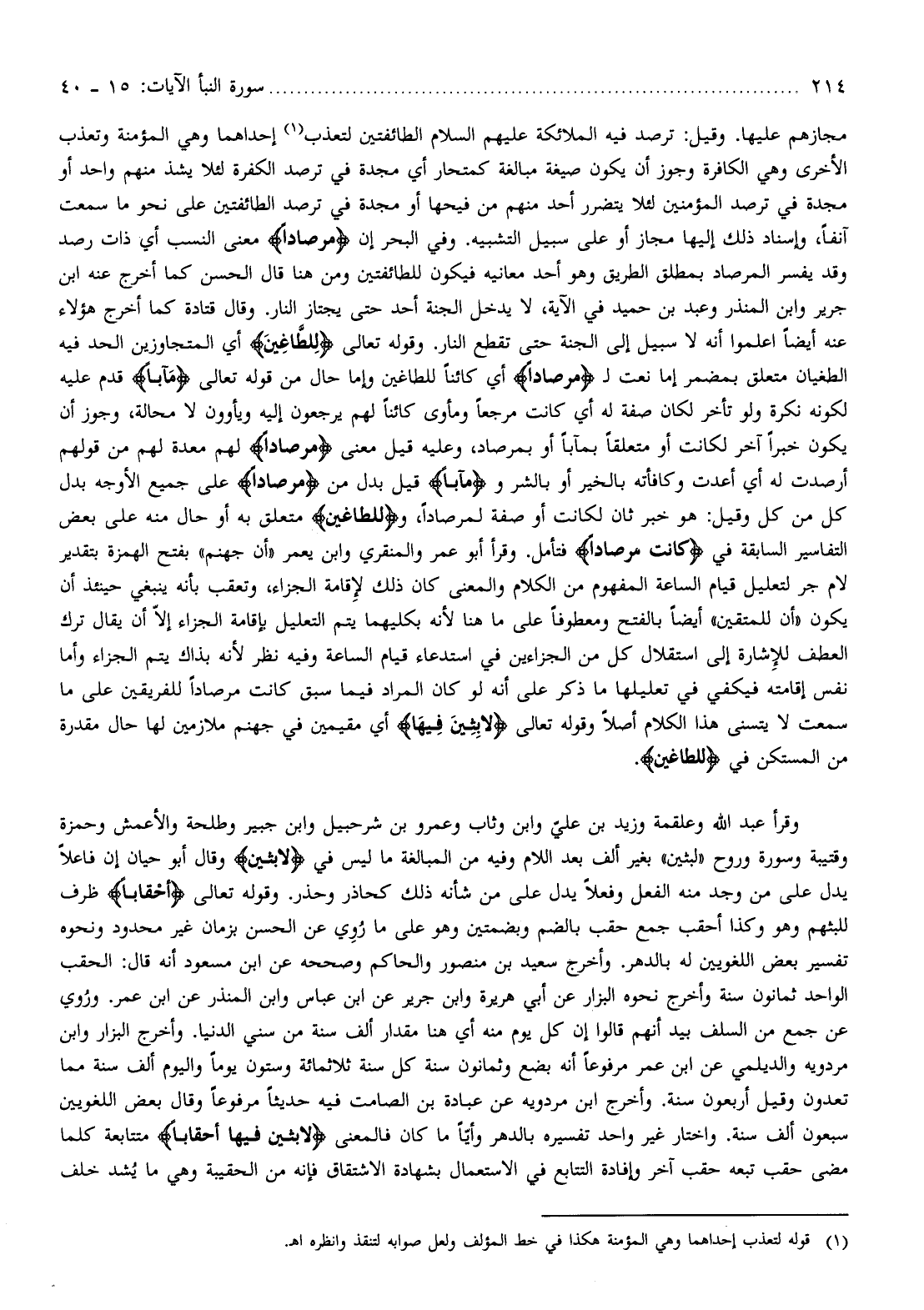 مجازهم عليها. وقيل: ترصد فيه الملائكة عليهم السلام الطائفتين لتعذب (¬1) إحداهما وهي المؤمنة وتعذب الأخرى وهي الكافرة وجوز أن يكون صيغة مبالغة كمتحار أي مجدة في ترصد الكفرة لئلا يشذ منهم واحد أو مجدة في ترصد المؤمنين لئلا يتضرر أحد منهم من فيحها أو مجدة في ترصد الطائفتين على نحو ما سمعت آنفا، وإسناد ذلك إليها مجاز أو على سبيل التشبيه. وفي البحر إن مِرْصاداً معنى النسب أي ذات رصد وقد يفسر المرصاد بمطلق الطريق وهو أحد معانيه فيكون للطائفتين ومن هنا قال الحسن كما أخرج عنه ابن جرير وابن المنذر وعبد بن حميد في الآية، لا يدخل الجنة أحد حتى يجتاز النار. وقال قتادة كما أخرج هؤلاء عنه أيضا اعلموا أنه لا سبيل إلى الجنة حتى تقطع النار. وقوله تعالى لِلطَّاغِينَ أي المتجاوزين الحد فيه الطغيان متعلق بمضمر إما نعت ل مِرْصاداً أي كائنا للطاغين وإما حال من قوله تعالى مَآباً قدم عليه لكونه نكرة ولو تأخر لكان صفة له أي كانت مرجعا ومأوى كائنا لهم يرجعون إليه ويأوون لا محالة، وجوز أن يكون خبرا آخر لكانت أو متعلقا بمآبا أو بمرصاد، وعليه قيل معنى مِرْصاداً لهم معدة لهم من قولهم أرصدت له أي أعدت وكافأته بالخير أو بالشر ومَآباً قيل بدل من مِرْصاداً على جميع الأوجه بدل كل من كل وقيل: هو خبر ثان لكانت أو صفة لمرصادا، ولِلطَّاغِينَ متعلق به أو حال منه على بعض التفاسير السابقة في كانَتْ مِرْصاداً فتأمل. وقرأ أبو عمر والمنقري وابن يعمر «أن جهنم» بفتح الهمزة بتقدير لام جر لتعليل قيام الساعة المفهوم من الكلام والمعنى كان ذلك لإقامة الجزاء، وتعقب بأنه ينبغي حينئذ أن يكون «أن للمتقين» أيضا بالفتح ومعطوفا على ما هنا لأنه بكليهما يتم التعليل بإقامة الجزاء إلّا أن يقال ترك العطف للإشارة إلى استقلال كل من الجزاءين في استدعاء قيام الساعة وفيه نظر لأنه بذاك يتم الجزاء وأما نفس إقامته فيكفي في تعليلها ما ذكر على أنه لو كان المراد فيما سبق كانت مرصادا للفريقين على ما سمعت لا يتسنى هذا الكلام أصلا وقوله تعالى لابِثِينَ فِيها أي مقيمين في جهنم ملازمين لها حال مقدرة من المستكن في لِلطَّاغِينَ.