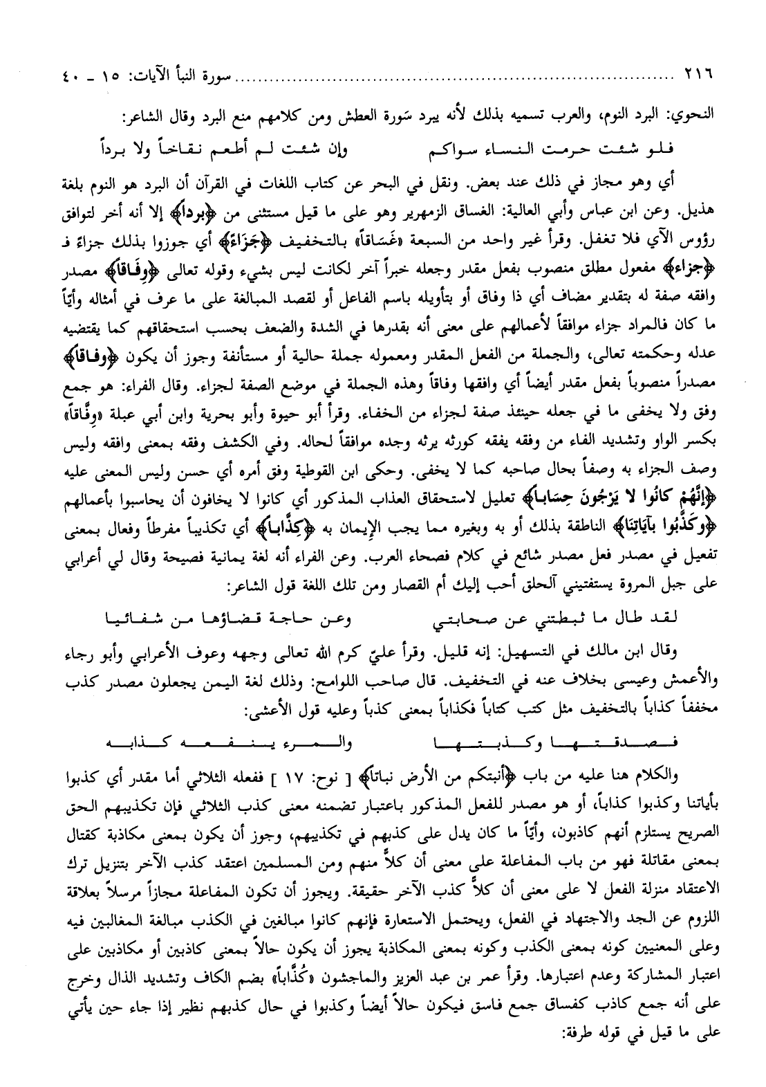 أي وهو مجاز في ذلك عند بعض. ونقل في البحر عن كتاب اللغات في القرآن أن البرد هو النوم بلغة هذيل. وعن ابن عباس وأبي العالية: الغساق الزمهرير وهو على ما قيل مستثنى من بَرْداً إلا أنه أخر لتوافق رؤوس الآي فلا تغفل. وقرأ غير واحد من السبعة «غساقا» بالتخفيف جَزاءً أي جوزوا بذلك جزاء ف جَزاءً مفعول مطلق منصوب بفعل مقدر وجعله خبرا آخر لكانت ليس بشيء وقوله تعالى وِفاقاً مصدر وافقه صفة له بتقدير مضاف أي ذا وفاق أو بتأويله باسم الفاعل أو لقصد المبالغة على ما عرف في أمثاله وأيّا ما كان فالمراد جزاء موافقا لأعمالهم على معنى أنه بقدرها في الشدة والضعف بحسب استحقاقهم كما يقتضيه عدله وحكمته تعالى، والجملة من الفعل المقدر ومعموله جملة حالية أو مستأنفة وجوز أن يكون وِفاقاً مصدرا منصوبا بفعل مقدر أيضا أي وافقها وفاقا وهذه الجملة في موضع الصفة لجزاء. وقال الفراء: هو جمع وفق ولا يخفى ما في جعله حينئذ صفة لجزاء من الخفاء. وقرأ أبو حيوة وأبو بحرية وابن أبي عبلة «وفّاقا» بكسر الواو وتشديد الفاء من وفقه يفقه كورثه يرثه وجده موافقا لحاله. وفي الكشف وفقه بمعنى وافقه وليس وصف الجزاء به وصفا بحال صاحبه كما لا يخفى. وحكى ابن القوطية وفق أمره أي حسن وليس المعنى عليه إِنَّهُمْ كانُوا لا يَرْجُونَ حِساباً تعليل لاستحقاق العذاب المذكور أي كانوا لا يخافون أن يحاسبوا بأعمالهم وَكَذَّبُوا بِآياتِنا الناطقة بذلك أو به وبغيره مما يجب الإيمان به كِذَّاباً أي تكذيبا مفرطا وفعال بمعنى تفعيل في مصدر فعل مصدر شائع في كلام فصحاء العرب. وعن الفراء أنه لغة يمانية فصيحة وقال لي أعرابي على جبل المروة يستفتيني آلحلق أحب إليك أم القصار ومن تلك اللغة قول الشاعر:
