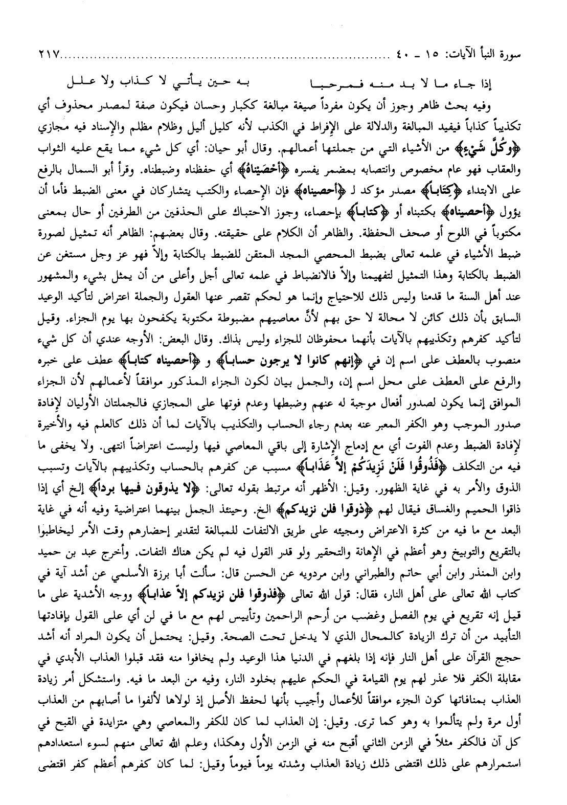 وفيه بحث ظاهر وجوز أن يكون مفردا صيغة مبالغة ككبار وحسان فيكون صفة لمصدر محذوف أي تكذيبا كذابا فيفيد المبالغة والدلالة على الإفراط في الكذب لأنه كليل أليل وظلام مظلم والإسناد فيه مجازي وَكُلَّ شَيْءٍ من الأشياء التي من جملتها أعمالهم. وقال أبو حيان: أي كل شيء مما يقع عليه الثواب والعقاب فهو عام مخصوص وانتصابه بمضمر يفسره أَحْصَيْناهُ أي حفظناه وضبطناه. وقرأ أبو السمال بالرفع على الابتداء كِتاباً مصدر مؤكد ل أَحْصَيْناهُ فإن الإحصاء والكتب يتشاركان في معنى الضبط فأما أن يؤول أَحْصَيْناهُ بكتبناه أو كِتاباً بإحصاء، وجوز الاحتباك على الحذفين من الطرفين أو حال بمعنى مكتوبا في اللوح أو صحف الحفظة. والظاهر أن الكلام على حقيقته. وقال بعضهم: الظاهر أنه تمثيل لصورة ضبط الأشياء في علمه تعالى بضبط المحصي المجد المتقن للضبط بالكتابة وإلّا فهو عز وجل مستغن عن الضبط بالكتابة وهذا التمثيل لتفهيمنا وإلّا فالانضباط في علمه تعالى أجل وأعلى من أن يمثل بشيء والمشهور عند أهل السنة ما قدمنا وليس ذلك للاحتياج وإنما هو لحكم تقصر عنها العقول والجملة اعتراض لتأكيد الوعيد السابق بأن ذلك كائن لا محالة لا حق بهم لأنّ معاصيهم مضبوطة مكتوبة يكفحون بها يوم الجزاء. وقيل لتأكيد كفرهم وتكذيبهم بالآيات بأنهما محفوظان للجزاء وليس بذاك. وقال البعض: الأوجه عندي أن كل شيء منصوب بالعطف على اسم إن في إِنَّهُمْ كانُوا لا يَرْجُونَ حِساباً وأَحْصَيْناهُ كِتاباً عطف على خبره والرفع على العطف على محل اسم إن، والجمل بيان لكون الجزاء المذكور موافقا لأعمالهم لأن الجزاء الموافق إنما يكون لصدور أفعال موجبة له عنهم وضبطها وعدم فوتها على المجازي فالجملتان الأوليان لإفادة صدور الموجب وهو الكفر المعبر عنه بعدم رجاء الحساب والتكذيب بالآيات لما أن ذلك كالعلم فيه والأخيرة لإفادة الضبط وعدم الفوت أي مع إدماج الإشارة إلى باقي المعاصي فيها وليست اعتراضا انتهى. ولا يخفى ما فيه من التكلف فَذُوقُوا فَلَنْ نَزِيدَكُمْ إِلَّا عَذاباً مسبب عن كفرهم بالحساب وتكذيبهم بالآيات وتسبب الذوق والأمر به في غاية الظهور. وقيل: الأظهر أنه مرتبط بقوله تعالى: لا يَذُوقُونَ فِيها بَرْداً إلخ أي إذا ذاقوا الحميم والغساق فيقال لهم فَذُوقُوا فَلَنْ نَزِيدَكُمْ إلخ. وحينئذ الجمل بينهما اعتراضية وفيه أنه في غاية البعد مع ما فيه من كثرة الاعتراض ومجيئه على طريق الالتفات للمبالغة لتقدير إحضارهم وقت الأمر ليخاطبوا بالتقريع والتوبيخ وهو أعظم في الإهانة والتحقير ولو قدر القول فيه لم يكن هناك التفات. وأخرج عبد بن حميد وابن المنذر وابن أبي حاتم والطبراني وابن مردويه عن الحسن قال: سألت أبا برزة الأسلمي عن أشد آية في كتاب الله تعالى على أهل النار، فقال: قول الله تعالى فَذُوقُوا فَلَنْ نَزِيدَكُمْ إِلَّا عَذاباً ووجه الأشدية على ما قيل إنه تقريع في يوم الفصل وغضب من أرحم الراحمين وتأييس لهم مع ما في لن أي على القول بإفادتها التأبيد من أن ترك الزيادة كالمحال الذي لا يدخل تحت الصحة. وقيل: يحتمل