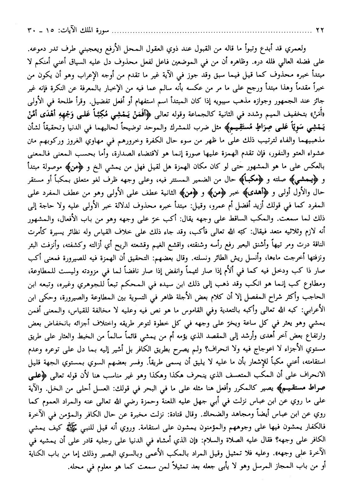 على فضله العالي فلله دره. وظاهره أن من في الموضعين فاعل لفعل محذوف دل عليه السياق أعني أمنكم لا مبتدأ خبره محذوف كما قيل فيما سبق وقد جوز في الآية غير ما تقدم من أوجه الإعراب وهو أن يكون من خبرا مقدما وهذا مبتدأ ورجح على ما مر من عكسه بأنه سالم عما فيه من الإخبار بالمعرفة عن النكرة فإنه غير جائز عند الجمهور وجوازه مذهب سيبويه إذا كان المبتدأ اسم استفهام أو أفعل تفضيل. وقرأ طلحة في الأولى «أمن» بتخفيف الميم وشدد في الثانية كالجماعة وقوله تعالى أَفَمَنْ يَمْشِي مُكِبًّا عَلى وَجْهِهِ أَهْدى أَمَّنْ يَمْشِي سَوِيًّا عَلى صِراطٍ مُسْتَقِيمٍ مثل ضرب للمشرك والموحد توضيحا لحاليهما في الدنيا وتحقيقا لشأن مذهبيهما والفاء لترتيب ذلك على ما ظهر من سوء حال الكفرة وخرورهم في مهاوي الغروز وركوبهم متن عشواء العتو والنفور، فإن تقدم الهمزة عليها صورة إنما هو لاقتضاء الصدارة، وأما بحسب المعنى فالمعنى بالعكس على ما هو المشهور حتى لو كان مكان الهمزة هل لقيل فهل من يمشي إلخ و (من) موصولة مبتدأ ويَمْشِي صلته ومُكِبًّا حال من الضمير المستتر فيه، وعلى وجهه ظرف لغو متعلق بمكبا أو مستقر حال والأول أولى وأَهْدى خبر (من) و (من) الثانية عطف على الأولى وهو من عطف المفرد على المفرد كما في قولك أزيد أفضل أم عمرو، وقيل: مبتدأ خبره محذوف لدلالة خبر الأولى عليه ولا حاجة إلى ذلك لما سمعت. والمكب الساقط على وجهه يقال: أكب خرّ على وجهه وهو من باب الأفعال، والمشهور أنه لازم وثلاثيه متعد فيقال: كبّه الله تعالى فأكب، وقد جاء ذلك على خلاف القياس وله نظائر يسيرة كأمرت الناقة درت ومر تيها وأشنق البعير رفع رأسه وشنقته، واقشع الغيم وقشعته الريح أي أزالته وكشفته، وأنزفت البئر ونزفتها أخرجت ماءها، وأنسل ريش الطائر ونسلته. وقال بعضهم: التحقيق أن الهمزة فيه للصيرورة فمعنى أكب صار ذا كب ودخل فيه كما في ألأم إذا صار لئيما وانفض إذا صار نافضا لما في مزودته وليست للمطاوعة، ومطاوع كب إنما هو انكب وقد ذهب إلى ذلك ابن سيده في المحكم تبعا للجوهري وغيره، وتبعه ابن الحاجب وأكثر شراح المفصل إلا أن كلام بعض الأجلة ظاهر في التسوية بين المطاوعة والصيرورة، وحكى ابن الأعرابي: كبه الله تعالى وأكبه بالتعدية وفي القاموس ما هو نص فيه وعليه لا مخالفة للقياس، والمعنى أفمن يمشي وهو يعثر في كل ساعة ويخرّ على وجهه في كل خطوة لتوعر طريقه واختلاف أجزائه بانخفاض بعض وارتفاع بعض آخر أهدى وأرشد إلى المقصد الذي يؤمه أم من يمشي قائما سالما من الخبط والعثار على طريق مستوي الأجزاء لا اعوجاج فيه ولا انحراف؟ ولم يصرح بطريق الكافر بل أشير إليه بما دل على توعره وعدم استقامته، أعني مكبا للإشعار بأن ما عليه لا يليق أن يسمى طريقا. وفسر بعضهم السوي بمستوي الجهة قليل الانحراف على أن المكب المتعسف الذي ينحرف هكذا وهكذا وهو غير مناسب هنا لأن قوله تعالى عَلى صِراطٍ مُسْتَقِيمٍ يصير كالمكرر وأفعل هنا مثله على ما في البحر في قولك: العسل أحلى من الخل. والآية على ما روي عن ابن عباس نزلت في أبي جهل عليه اللعنة وحمزة رضي الله تعالى عنه والمراد العموم كما روي عن ابن عباس أيضا ومجاهد والضحاك. وقال قتادة: نزلت مخبرة عن حال الكافر والمؤمن في الآخرة فالكفار يمشون فيها على وجوههم والمؤمنون يمشون على استقامة.
