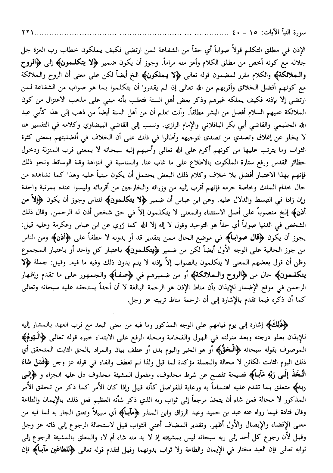 الإذن في مطلق التكلم قولا صوابا أي حقا من الشفاعة لمن ارتضى فكيف يملكون خطاب رب العزة جل جلاله مع كونه أخص من مطلق الكلام وأعز منه مراما. وجوز أن يكون ضمير لا يَتَكَلَّمُونَ إلى الرُّوحُ وَالْمَلائِكَةُ والكلام مقرر لمضمون قوله تعالى لا يَمْلِكُونَ إلخ أيضا لكن على معنى أن الروح والملائكة مع كونهم أفضل الخلائق وأقربهم من الله تعالى إذا لم يقدروا أن يتكلموا بما هو صواب من الشفاعة لمن ارتضى إلا بإذنه فكيف يملكه غيرهم وذكر بعض أهل السنة فتعقب بأنه مبني على مذهب الاعتزال من كون الملائكة عليهم السلام أفضل من البشر مطلقا. وأنت تعلم أن من أهل السنة أيضا من ذهب إلى هذا كأبي عبد الله الحليمي والقاضي أبي بكر الباقلاني والإمام الرازي. ونسب إلى القاضي البيضاوي وكلامه في التفسير هنا لا يخلو عن إغلاق وتصدي من تصدى لتوجيهه وأطالوا في ذلك على أن الخلاف في أفضليتهم بمعنى كثرة الثواب وما يترتب عليها من كونهم أكرم على الله تعالى وأحبهم إليه سبحانه لا بمعنى قرب المنزلة ودخول حظائر القدس ورفع ستارة الملكوت بالاطلاع على ما غاب عنا. والمناسبة في النزاهة وقلة الوسائط ونحو ذلك فإنهم بهذا الاعتبار أفضل بلا خلاف وكلام ذلك البعض يحتمل أن يكون مبنيا عليه وهذا كما نشاهده من حال خدام الملك وخاصة حرمه فإنهم أقرب إليه من وزرائه والخارجين من أقربائه وليسوا عنده بمرتبة واحدة وإن زادا في التبسط والدلال عليه. وعن ابن عباس أن ضمير لا يَتَكَلَّمُونَ للناس وجوز أن يكون إِلَّا مَنْ أَذِنَ إلخ منصوبا على أصل الاستثناء والمعنى لا يتكلمون إلّا في حق شخص أذن له الرحمن. وقال ذلك الشخص في الدنيا صوابا أي حقا هو التوحيد وقول لا إله إلا الله كما روي عن ابن عباس وعكرمة وعليه قيل: