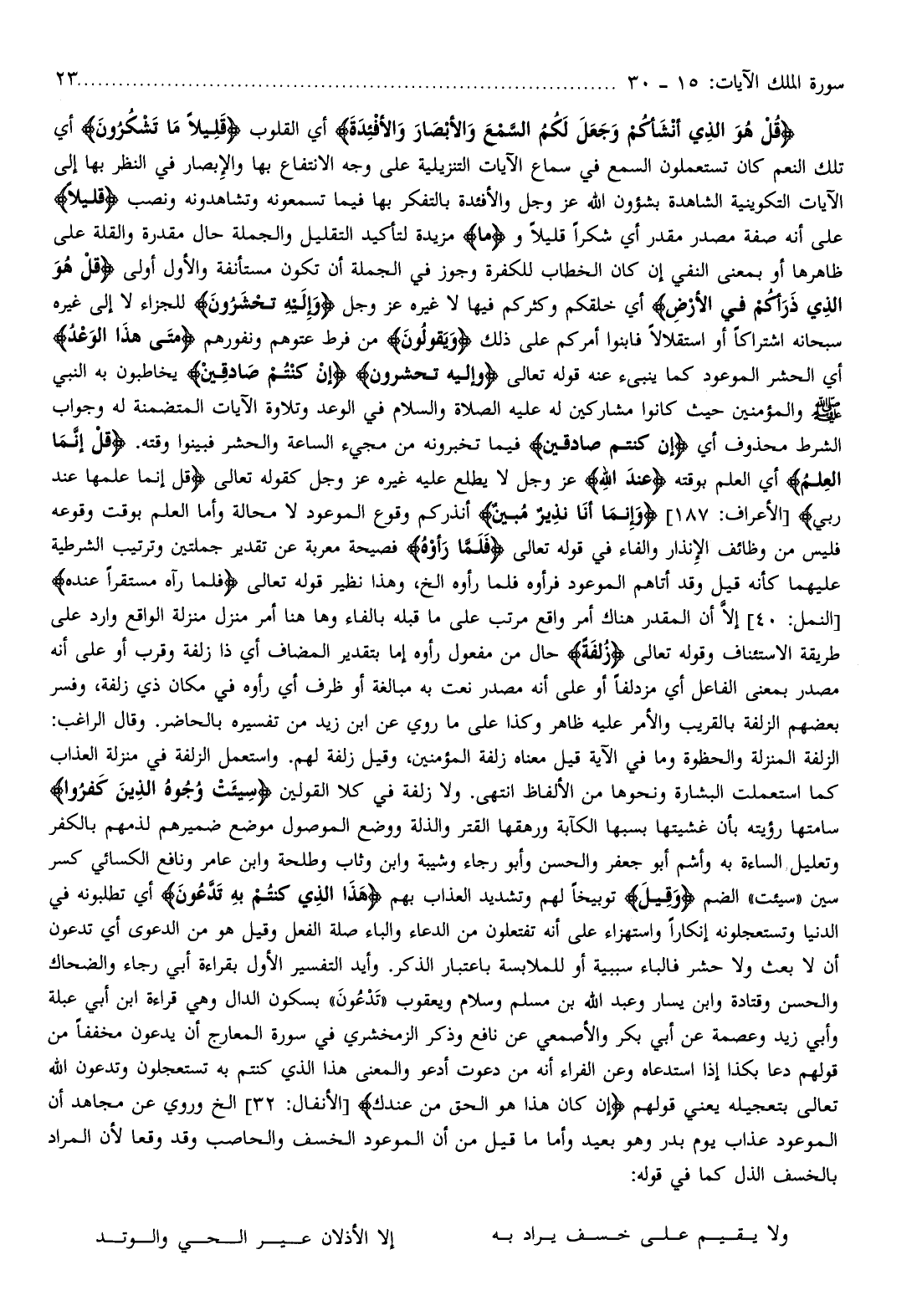 قُلْ هُوَ الَّذِي أَنْشَأَكُمْ وَجَعَلَ لَكُمُ السَّمْعَ وَالْأَبْصارَ وَالْأَفْئِدَةَ أي القلوب قَلِيلًا ما تَشْكُرُونَ أي تلك النعم كان تستعملون السمع في سماع الآيات التنزيلية على وجه الانتفاع بها والإبصار في النظر بها إلى الآيات التكوينية الشاهدة بشؤون الله عز وجل والأفئدة بالتفكر بها فيما تسمعونه وتشاهدونه ونصب قَلِيلًا على أنه صفة مصدر مقدر أي شكرا قليلا وما مزيدة لتأكيد التقليل والجملة حال مقدرة والقلة على ظاهرها أو بمعنى النفي إن كان الخطاب للكفرة وجوز في الجملة أن تكون مستأنفة والأول أولى قُلْ هُوَ الَّذِي ذَرَأَكُمْ فِي الْأَرْضِ أي خلقكم وكثركم فيها لا غيره عز وجل وَإِلَيْهِ تُحْشَرُونَ للجزاء لا إلى غيره سبحانه اشتراكا أو استقلالا فابنوا أمركم على ذلك وَيَقُولُونَ من فرط عتوهم ونفورهم مَتى هذَا الْوَعْدُ أي الحشر الموعود كما ينبىء عنه قوله تعالى وَإِلَيْهِ تُحْشَرُونَ إِنْ كُنْتُمْ صادِقِينَ يخاطبون به النبي صلّى الله عليه وسلم والمؤمنين حيث كانوا مشاركين له عليه الصلاة والسلام في الوعد وتلاوة الآيات المتضمنة له وجواب الشرط محذوف أي إِنْ كُنْتُمْ صادِقِينَ فيما تخبرونه من مجيء الساعة والحشر فبينوا وقته. قُلْ إِنَّمَا الْعِلْمُ أي العلم بوقته عِنْدَ اللَّهِ عز وجل لا يطلع عليه غيره عز وجل كقوله تعالى قُلْ إِنَّما عِلْمُها عِنْدَ رَبِّي [الأعراف: 187] وَإِنَّما أَنَا نَذِيرٌ مُبِينٌ أنذركم وقوع الموعود لا محالة وأما العلم بوقت وقوعه فليس من وظائف الإنذار والفاء في قوله تعالى فَلَمَّا رَأَوْهُ فصيحة معربة عن تقدير جملتين وترتيب الشرطية عليهما كأنه قيل وقد أتاهم الموعود فرأوه فلما رأوه إلخ، وهذا نظير قوله تعالى فَلَمَّا رَآهُ مُسْتَقِرًّا عِنْدَهُ [النمل: 40] إلّا أن المقدر هناك أمر واقع مرتب على ما قبله بالفاء وهاهنا أمر منزل منزلة الواقع وارد على طريقة الاستئناف وقوله تعالى زُلْفَةً حال من مفعول رأوه إما بتقدير المضاف أي ذا زلفة وقرب أو على أنه مصدر بمعنى الفاعل أي مزدلفا أو على أنه مصدر نعت به مبالغة أو ظرف أي رأوه في مكان ذي زلفة، وفسر بعضهم الزلفة بالقريب والأمر عليه ظاهر وكذا على ما روي عن ابن زيد من تفسيره بالحاضر. وقال الراغب: