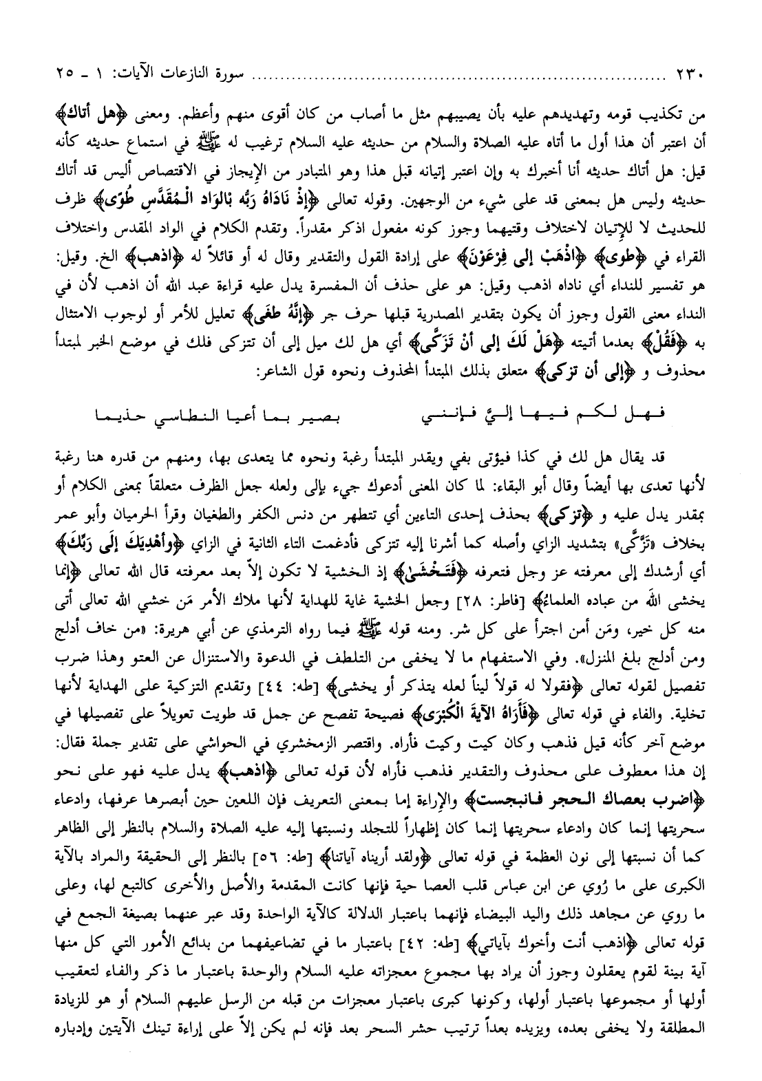 هو تفسير للنداء أي ناداه اذهب وقيل: هو على حذف أن المفسرة يدل عليه قراءة عبد الله أن اذهب لأن في النداء معنى القول وجوز أن يكون بتقدير المصدرية قبلها حرف جر إِنَّهُ طَغى تعليل للأمر أو لوجوب الامتثال به فَقُلْ بعد ما أتيته هَلْ لَكَ إِلى أَنْ تَزَكَّى أي هل لك ميل إلى أن تتزكى فلك في موضع الخبر لمبتدأ محذوف وإِلى أَنْ تَزَكَّى متعلق بذلك المبتدأ المحذوف ونحوه قول الشاعر: