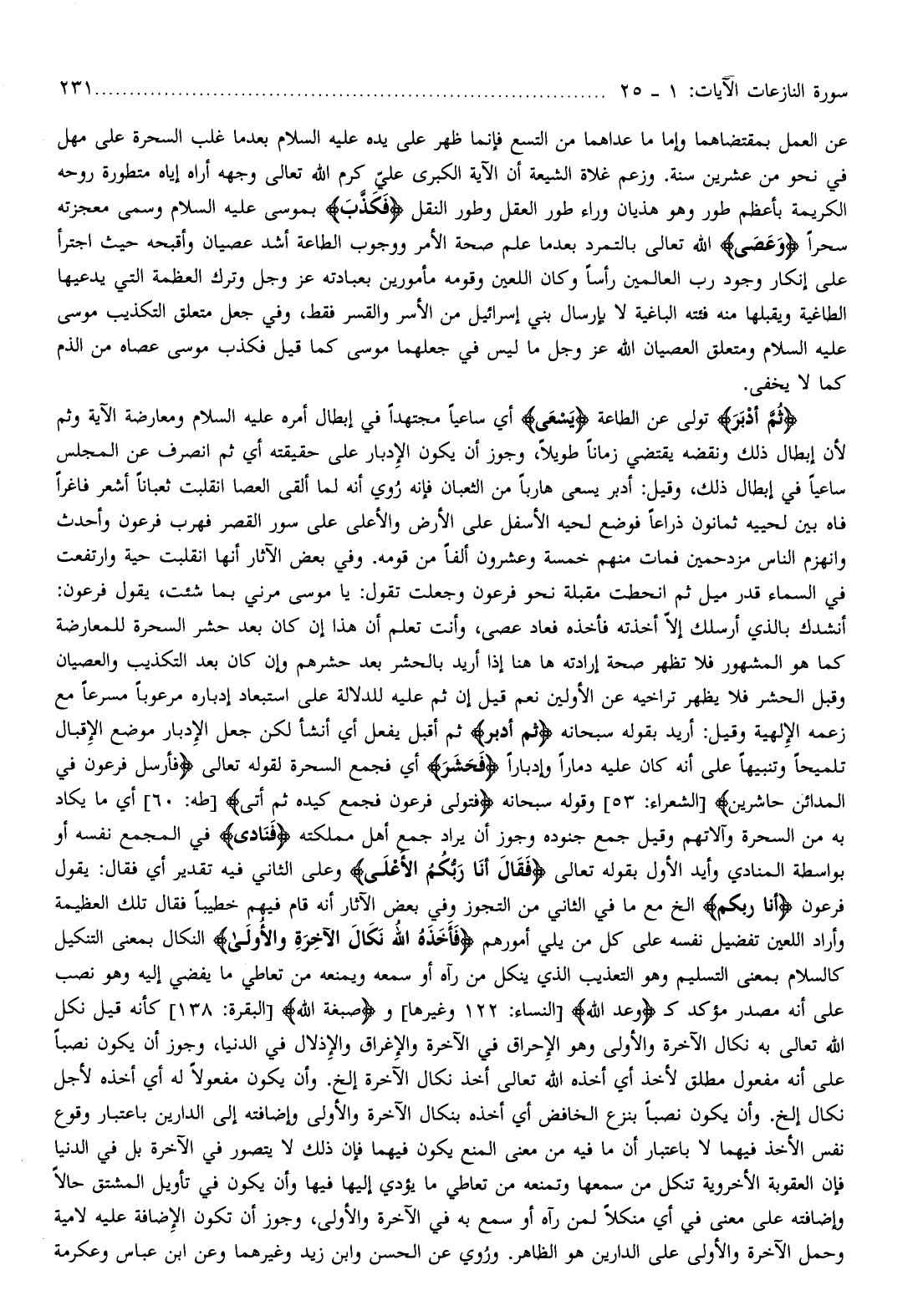 أنشدك بالذي أرسلك إلّا أخذته فأخذه فعاد عصى، وأنت تعلم أن هذا إن كان بعد حشر السحرة للمعارضة كما هو المشهور فلا تظهر صحة إرادته هاهنا إذا أريد بالحشر بعد حشرهم وإن كان بعد التكذيب والعصيان وقبل الحشر فلا يظهر تراخيه عن الأولين نعم قيل إن ثم عليه للدلالة على استبعاد إدباره مرعوبا مسرعا مع زعمه الإلهية وقيل: أريد بقوله سبحانه ثُمَّ أَدْبَرَ ثم أقبل يفعل أي أنشأ لكن جعل الإدبار موضع الإقبال تلميحا وتنبيها على أنه كان عليه دمارا وإدبارا فَحَشَرَ أي فجمع السحرة لقوله تعالى فَأَرْسَلَ فِرْعَوْنُ فِي الْمَدائِنِ حاشِرِينَ [الشعراء: 53] وقوله سبحانه فَتَوَلَّى فِرْعَوْنُ فَجَمَعَ كَيْدَهُ ثُمَّ أَتى [طه: 60] أي ما يكاد به من السحرة وآلاتهم وقيل جمع جنوده وجوز أن يراد جمع أهل مملكته فَنادى في المجمع نفسه أو بواسطة المنادي وأيد الأول بقوله تعالى فَقالَ أَنَا رَبُّكُمُ الْأَعْلى وعلى الثاني فيه تقدير أي فقال: يقول فرعون أَنَا رَبُّكُمُ إلخ مع ما في الثاني من التجوز وفي بعض الآثار أنه قام فيهم خطيبا فقال تلك العظيمة وأراد اللعين تفضيل نفسه على كل من يلي أمورهم فَأَخَذَهُ اللَّهُ نَكالَ الْآخِرَةِ وَالْأُولى النكال بمعنى التنكيل كالسلام بمعنى التسليم وهو التعذيب الذي ينكل من رآه أو سمعه ويمنعه من تعاطي ما يفضي إليه وهو نصب على أنه مصدر مؤكد ك وَعْدَ اللَّهِ [النساء: 122 وغيرها] وصِبْغَةَ اللَّهِ [البقرة: 138] كأنه قيل نكل الله تعالى به نكال الآخرة والأولى وهو الإحراق في الآخرة والإغراق والإذلال في الدنيا، وجوز أن يكون نصبا على أنه مفعول مطلق لأخذ أي أخذه الله تعالى أخذ نكال الآخرة إلخ. وأن يكون مفعولا له أي أخذه لأجل نكال إلخ. وأن يكون نصبا بنزع الخافض أي أخذه بنكال الآخرة والأولى وإضافته إلى الدارين باعتبار وقوع نفس الأخذ فيهما لا باعتبار أن ما فيه من معنى المنع يكون فيهما فإن ذلك لا يتصور في الآخرة بل في الدنيا فإن العقوبة الأخروية تنكل من سمعها وتمنعه من تعاطي ما يؤدي إليها فيها وأن يكون في تأويل المشتق حالا وإضافته على معنى في أي منكلا لمن رآه أو سمع به في الآخرة والأولى، وجوز أن تكون الإضافة عليه لامية وحمل الآخرة والأولى على الدارين هو الظاهر. وروي عن الحسن وابن زيد وغيرهما وعن ابن عباس وعكرمة