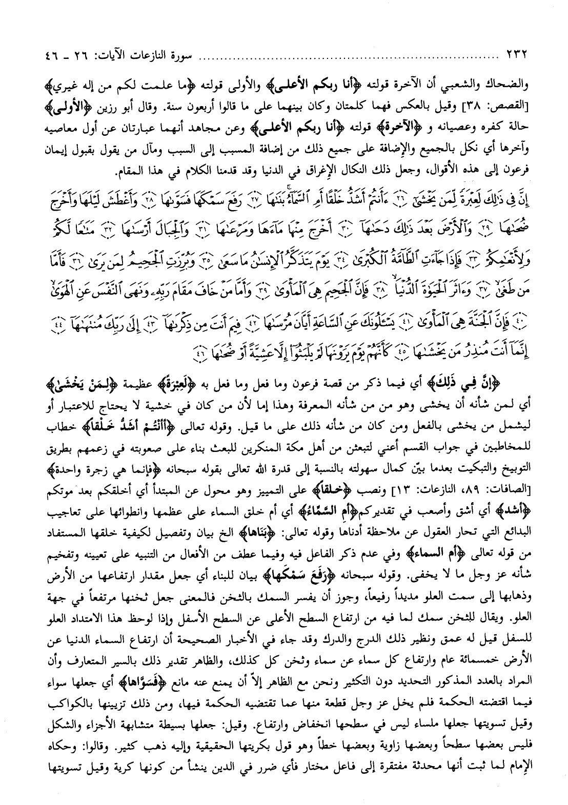 إِنَّ فِي ذلِكَ أي فيما ذكر من قصة فرعون وما فعل وما فعل به لَعِبْرَةً عظيمة لِمَنْ يَخْشى أي لمن شأنه أن يخشى وهو من من شأنه المعرفة وهذا إما لأن من كان في خشية لا يحتاج للاعتبار أو ليشمل من يخشى بالفعل ومن كان من شأنه ذلك على ما قيل. وقوله تعالى أَأَنْتُمْ أَشَدُّ خَلْقاً خطاب للمخاطبين في جواب القسم أعني لتبعثن من أهل مكة المنكرين للبعث بناء على صعوبته في زعمهم بطريق التوبيخ والتبكيت بعد ما بيّن كمال سهولته بالنسبة إلى قدرة الله تعالى بقوله سبحانه فَإِنَّما هِيَ زَجْرَةٌ واحِدَةٌ [الصافات: 89، النازعات: 13] ونصب خَلْقاً على التمييز وهو محول عن المبتدأ أي أخلقكم بعد موتكم أَشَدُّ أي أشق وأصعب في تقديركم أَمِ السَّماءُ أي أم خلق السماء على عظمها وانطوائها على تعاجيب البدائع التي تحار العقول عن ملاحظة أدناها وقوله تعالى: بَناها إلخ بيان وتفصيل لكيفية خلقها المستفاد من قوله تعالى أَمِ السَّماءُ