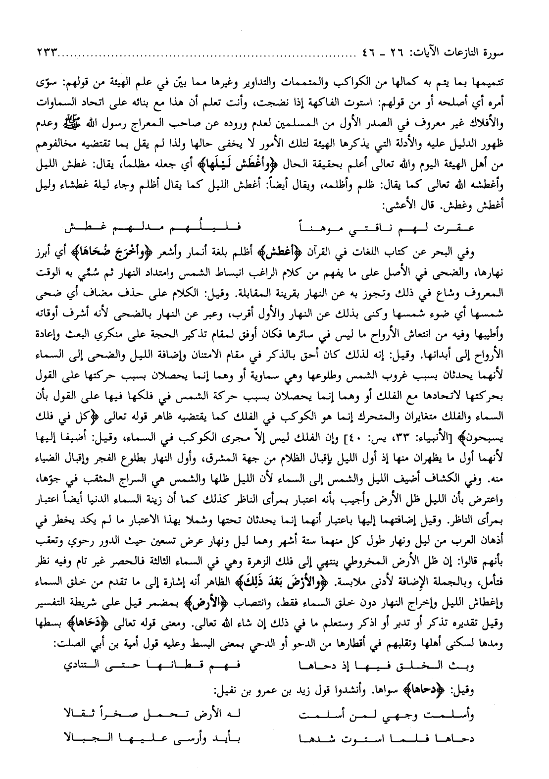 وفي البحر عن كتاب اللغات في القرآن أَغْطَشَ أظلم بلغة أنمار وأشعر وَأَخْرَجَ ضُحاها أي أبرز نهارها، والضحى في الأصل على ما يفهم من كلام الراغب انبساط الشمس وامتداد النهار ثم سمّي به الوقت المعروف وشاع في ذلك وتجوز به عن النهار بقرينة المقابلة. وقيل: الكلام على حذف مضاف أي ضحى شمسها أي ضوء شمسها وكنى بذلك عن النهار والأول أقرب، وعبر عن النهار بالضحى لأنه أشرف أوقاته وأطيبها وفيه من انتعاش الأرواح ما ليس في سائرها فكان أوفق لمقام تذكير الحجة على منكري البعث وإعادة الأرواح إلى أبدانها. وقيل: إنه لذلك كان أحق بالذكر في مقام الامتنان وإضافة الليل والضحى إلى السماء لأنهما يحدثان بسبب غروب الشمس وطلوعها وهي سماوية أو وهما إنما يحصلان بسبب حركتها على القول بحركتها لاتحادها مع الفلك أو وهما إنما يحصلان بسبب حركة الشمس في فلكها فيها على القول بأن السماء والفلك متغايران والمتحرك إنما هو الكوكب في الفلك كما يقتضيه ظاهر قوله تعالى كُلٌّ فِي فَلَكٍ يَسْبَحُونَ [الأنبياء: 33، يس: 40] وإن الفلك ليس إلّا مجرى الكوكب في السماء، وقيل: أضيفا إليها لأنهما أول ما يظهران منها إذ أول الليل بإقبال الظلام من جهة المشرق، وأول النهار بطلوع الفجر وإقبال الضياء منه. وفي الكشاف أضيف الليل والشمس إلى السماء لأن الليل ظلها والشمس هي السراج المثقب في جوّها، واعترض بأن الليل ظل الأرض وأجيب بأنه اعتبار بمرأى الناظر كذلك كما أن زينة السماء الدنيا أيضا اعتبار بمرأى الناظر. وقيل إضافتهما إليها باعتبار أنهما إنما يحدثان تحتها وشملا بهذا الاعتبار ما لم يكد يخطر في أذهان العرب من ليل ونهار طول كل منهما ستة أشهر وهما ليل ونهار عرض تسعين حيث الدور رحوي وتعقب بأنهم قالوا: إن ظل الأرض المخروطي ينتهي إلى فلك الزهرة وهي في السماء الثالثة فالحصر غير تام وفيه نظر فتأمل، وبالجملة الإضافة لأدنى ملابسة. وَالْأَرْضَ بَعْدَ ذلِكَ الظاهر أنه إشارة إلى ما تقدم من خلق السماء وإغطاش الليل وإخراج النهار دون خلق السماء فقط، وانتصاب الْأَرْضَ بمضمر قيل على شريطة التفسير وقيل تقديره تذكر أو تدبر أو اذكر وستعلم ما في ذلك إن شاء الله تعالى. ومعنى قوله تعالى دَحاها بسطها ومدها لسكنى أهلها وتقلبهم في أقطارها من الدحو أو الدحي بمعنى البسط وعليه قول أمية بن أبي الصلت: