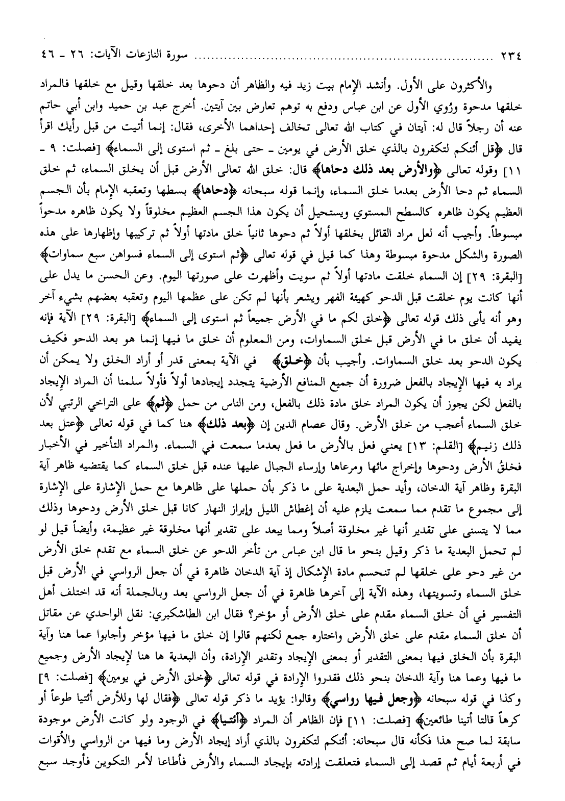 والأكثرون على الأول. وأنشد الإمام بيت زيد فيه والظاهر أن دحوها بعد خلقها وقيل مع خلقها فالمراد خلقها مدحوة وروي الأول عن ابن عباس ودفع به توهم تعارض بين آيتين. أخرج عبد بن حميد وابن أبي حاتم عنه أن رجلا قال له: آيتان في كتاب الله تعالى تخالف إحداهما الأخرى، فقال: إنما أتيت من قبل رأيك اقرأ قال قُلْ أَإِنَّكُمْ لَتَكْفُرُونَ بِالَّذِي خَلَقَ الْأَرْضَ فِي يَوْمَيْنِ- حتى بلغ- ثُمَّ اسْتَوى إِلَى السَّماءِ [فصلت: 9- 11] وقوله تعالى وَالْأَرْضَ بَعْدَ ذلِكَ دَحاها قال: خلق الله تعالى الأرض قبل أن يخلق السماء، ثم خلق السماء ثم دحا الأرض بعد ما خلق السماء، وإنما قوله سبحانه دَحاها بسطها وتعقبه الإمام بأن الجسم العظيم يكون ظاهره كالسطح المستوي ويستحيل أن يكون هذا الجسم العظيم مخلوقا ولا يكون ظاهره مدحوا مبسوطا. وأجيب أنه لعل مراد القائل بخلقها أولا ثم دحوها ثانيا خلق مادتها أولا ثم تركيبها وإظهارها على هذه الصورة والشكل مدحوة مبسوطة وهذا كما قيل في قوله تعالى ثُمَّ اسْتَوى إِلَى السَّماءِ فَسَوَّاهُنَّ سَبْعَ سَماواتٍ [البقرة: 29] إن السماء خلقت مادتها أولا ثم سويت وأظهرت على صورتها اليوم. وعن الحسن ما يدل على أنها كانت يوم خلقت قبل الدحو كهيئة الفهر ويشعر بأنها لم تكن على عظمها اليوم وتعقبه بعضهم بشيء آخر وهو أنه يأبى ذلك قوله تعالى خَلَقَ لَكُمْ ما فِي الْأَرْضِ جَمِيعاً ثُمَّ اسْتَوى إِلَى السَّماءِ [البقرة: 29] الآية فإنه يفيد أن خلق ما في الأرض قبل خلق السماوات، ومن المعلوم أن خلق ما فيها إنما هو بعد الدحو فكيف يكون الدحو بعد خلق السماوات. وأجيب بأن خَلَقَ في الآية بمعنى قدر أو أراد الخلق ولا يمكن أن يراد به فيها الإيجاد بالفعل ضرورة أن جميع المنافع الأرضية يتجدد إيجادها أولا فأولا سلمنا أن المراد الإيجاد بالفعل لكن يجوز أن يكون المراد خلق مادة ذلك بالفعل، ومن الناس من حمل ثُمَّ على التراخي الرتبي لأن خلق السماء أعجب من خلق الأرض. وقال عصام الدين إن بَعْدَ ذلِكَ هنا كما في قوله تعالى عُتُلٍّ بَعْدَ ذلِكَ زَنِيمٍ [القلم: 13] يعني فعل بالأرض ما فعل بعد ما سمعت في السماء. والمراد التأخير في الأخبار فخلق الأرض ودحوها وإخراج مائها ومرعاها وإرساء الجبال عليها عنده قبل خلق السماء كما يقتضيه ظاهر آية البقرة وظاهر آية الدخان، وأيد حمل البعدية على ما ذكر بأن حملها على ظاهرها مع حمل الإشارة على الإشارة إلى مجموع ما تقدم مما سمعت يلزم عليه أن إغطاش الليل وإبراز النهار كانا قبل خلق الأرض ودحوها وذلك مما لا يتسنى على تقدير أنها غير مخلوقة أصلا ومما يبعد على تقدير أنها مخلوقة غير عظيمة، وأيضا قيل لو لم تحمل البعدية ما ذكر وقيل بنحو ما قال ابن عباس من تأخر الدحو عن خلق السماء مع تقدم خلق الأرض من غير دحو على خلقها لم تنحسم مادة الإشكال إذ آية الدخان ظاهرة في أن جعل الرواسي في الأرض قبل خلق السماء وتسويتها، وهذه الآية إلى آخرها ظاهرة في أن جعل الرواسي بعد وبالجملة أنه قد اختلف أهل التفسير في أن خلق السماء مقدم على خلق الأرض أو مؤخر؟ فقال ابن الطاشكبري: نقل الواحدي عن مقاتل أن خلق السماء مقدم على خلق الأرض واختاره جمع لكنهم قالوا إن خلق ما فيها مؤخر وأجابوا عما هنا وآية البقرة بأن الخلق فيها بمعنى التقدير أو بمعنى الإيجاد وتقدير الإرادة، وأن البعدية هاهنا لإيجاد الأرض وجميع ما فيها وعما هنا وآية الدخان بنحو ذلك فقدروا الإرادة في قوله تعالى خَلَقَ الْأَرْضَ فِي يَوْمَيْنِ [فصلت: 9] وكذا في قوله سبحانه وَجَعَلَ فِيها رَواسِيَ وقالوا: يؤيد ما ذكر قوله تعالى فَقالَ لَها وَلِلْأَرْضِ ائْتِيا طَوْعاً أَوْ كَرْهاً قالَتا أَتَيْنا طائِعِينَ [فصلت: 11] فإن الظاهر أن المراد ائْتِيا في الوجود ولو كانت الأرض موجودة سابقة لما صح هذا فكأنه قال سبحانه: أئنكم لتكفرون بالذي أراد إيجاد الأرض وما فيها من الرواسي والأقوات في أربعة أيام ثم قصد إلى السماء فتعلقت إرادته بإيجاد السماء والأرض فأطاعا لأمر التك