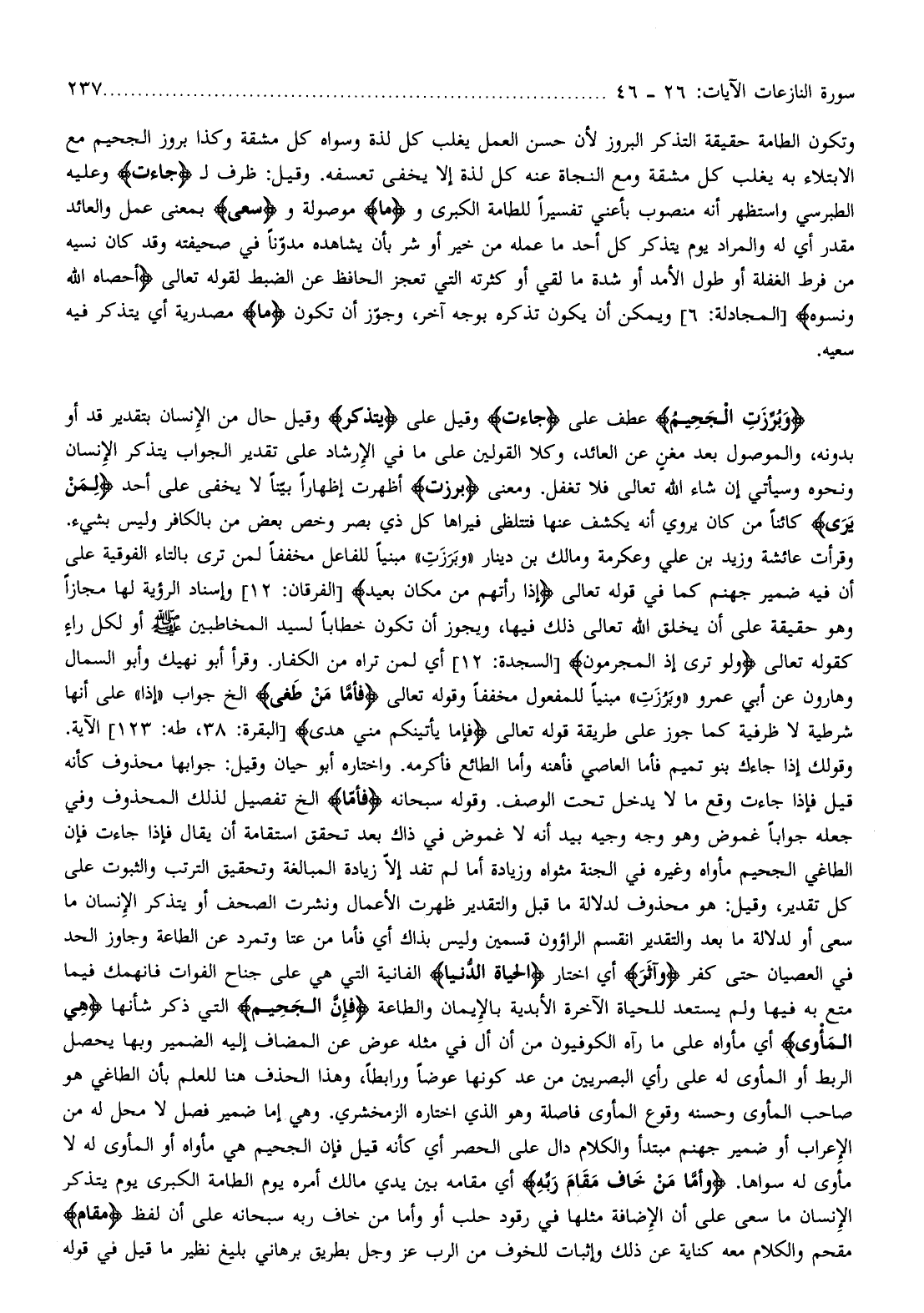وقولك إذا جاءك بنو تميم فأما العاصي فأهنه وأما الطائع فأكرمه. واختاره أبو حيان وقيل: جوابها محذوف كأنه قيل فإذا جاءت وقع ما لا يدخل تحت الوصف. وقوله سبحانه فَأَمَّا إلخ تفصيل لذلك المحذوف وفي جعله جوابا غموض وهو وجه وجيه بيد أنه لا غموض في ذاك بعد تحقق استقامة أن يقال فإذا جاءت فإن الطاغي الجحيم مأواه وغيره في الجنة مثواه وزيادة أما لم تفد إلّا زيادة المبالغة وتحقيق الترتب والثبوت على كل تقدير، وقيل: هو محذوف لدلالة ما قبل والتقدير ظهرت الأعمال ونشرت الصحف أو يتذكر الإنسان ما سعى أو لدلالة ما بعد والتقدير انقسم الراؤون قسمين وليس بذاك أي فأما من عتا وتمرد عن الطاعة وجاوز الحد في العصيان حتى كفر وَآثَرَ أي اختار الْحَياةَ الدُّنْيا الفانية التي هي على جناح الفوات فانهمك فيما متع به فيها ولم يستعد للحياة الآخرة الأبدية بالإيمان والطاعة فَإِنَّ الْجَحِيمَ التي ذكر شأنها هِيَ الْمَأْوى أي مأواه على ما رآه الكوفيون من أن أل في مثله عوض عن المضاف إليه الضمير وبها يحصل الربط أو المأوى له على رأي البصريين من عد كونها عوضا ورابطا، وهذا الحذف هنا للعلم بأن الطاغي هو صاحب المأوى وحسنه وقوع المأوى فاصلة وهو الذي اختاره الزمخشري. وهي إما ضمير فصل لا محل له من الإعراب أو ضمير جهنم مبتدأ والكلام دال على الحصر أي كأنه قيل فإن الجحيم هي مأواه أو المأوى له لا مأوى له سواها. وَأَمَّا مَنْ خافَ مَقامَ رَبِّهِ أي مقامه بين يدي مالك أمره يوم الطامة الكبرى يوم يتذكر الإنسان ما سعى على أن الإضافة مثلها في رقود حلب أو وأما من خاف ربه سبحانه على أن لفظ مَقامَ مقحم والكلام معه كناية عن ذلك وإثبات للخوف من الرب عز وجل بطريق برهاني بليغ نظير ما قيل في قوله