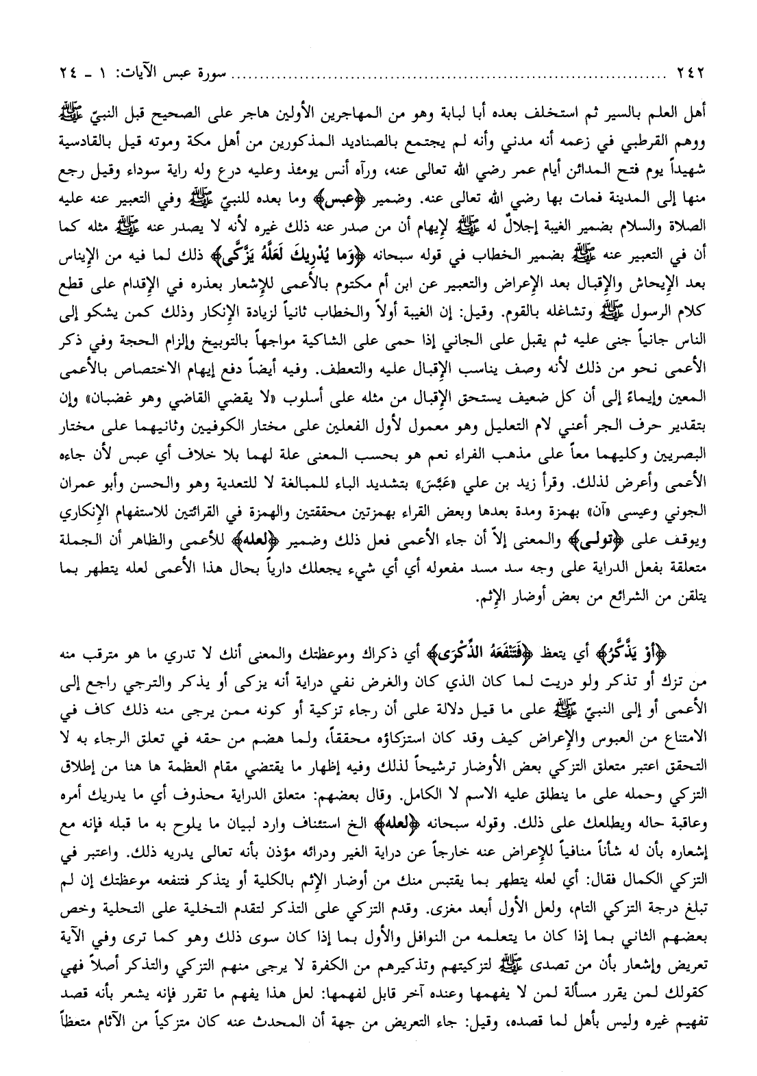 أهل العلم بالسير ثم استخلف بعده أبا لبابة وهو من المهاجرين الأولين هاجر على الصحيح قبل النبيّ صلّى الله عليه وسلم ووهم القرطبي في زعمه أنه مدني وأنه لم يجتمع بالصناديد المذكورين من أهل مكة وموته قيل بالقادسية شهيدا يوم فتح المدائن أيام عمر رضي الله تعالى عنه، ورآه أنس يومئذ وعليه درع وله راية سوداء وقيل رجع منها إلى المدينة فمات بها رضي الله تعالى عنه. وضمير عَبَسَ وما بعده للنبيّ صلّى الله عليه وسلم وفي التعبير عنه عليه الصلاة والسلام بضمير الغيبة إجلال له صلّى الله عليه وسلم لإيهام أن من صدر عنه ذلك غيره لأنه لا يصدر عنه صلّى الله عليه وسلم مثله كما أن في التعبير عنه صلّى الله عليه وسلم بضمير الخطاب في قوله سبحانه وَما يُدْرِيكَ لَعَلَّهُ يَزَّكَّى ذلك لما فيه من الإيناس بعد الإيحاش والإقبال بعد الإعراض والتعبير عن ابن أم مكتوم بالأعمى للإشعار بعذره في الإقدام على قطع كلام الرسول صلّى الله عليه وسلم وتشاغله بالقوم. وقيل: إن الغيبة أولا والخطاب ثانيا لزيادة الإنكار وذلك كمن يشكو إلى الناس جانيا جنى عليه ثم يقبل على الجاني إذا حمى على الشاكية مواجها بالتوبيخ وإلزام الحجة وفي ذكر الأعمى نحو من ذلك لأنه وصف يناسب الإقبال عليه والتعطف. وفيه أيضا دفع إيهام الاختصاص بالأعمى المعين وإيماء إلى أن كل ضعيف يستحق الإقبال من مثله على أسلوب «لا يقضي القاضي وهو غضبان» وإن بتقدير حرف الجر أعني لام التعليل وهو معمول لأول الفعلين على مختار الكوفيين وثانيهما على مختار البصريين وكليهما معا على مذهب الفراء نعم هو بحسب المعنى علة لهما بلا خلاف أي عبس لأن جاءه الأعمى وأعرض لذلك. وقرأ زيد بن علي «عبّس» بتشديد الباء للمبالغة لا للتعدية وهو والحسن وأبو عمران الجوني وعيسى «آن» بهمزة ومدة بعدها وبعض القراء بهمزتين محققتين والهمزة في القرائتين للاستفهام الإنكاري ويوقف على تَوَلَّى والمعنى إلّا أن جاء الأعمى فعل ذلك وضمير لَعَلَّهُ للأعمى والظاهر أن الجملة متعلقة بفعل الدراية على وجه سد مسد مفعوله أي أي شيء يجعلك داريا بحال هذا الأعمى لعله يتطهر بما يتلقن من الشرائع من بعض أوضار الإثم.