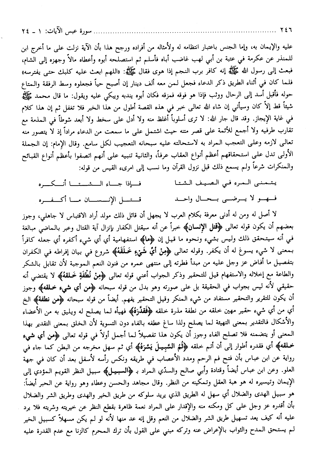 لا أصل له ومن له أدنى معرفة بكلام العرب لا يجهل أن قائل ذلك مولد أراد الاقتباس لا جاهلي، وجوز بعضهم أن يكون قوله تعالى قُتِلَ الْإِنْسانُ خبرا عن أنه سيقتل الكفار بإنزال آية القتال وعبر بالماضي مبالغة في أنه سيتحقق ذلك وليس بشيء ونحوه ما قيل إن ما استفهامية أي أي شيء أكفره أي جعله كافرا بمعنى لا شيء يسوغ له أن يكفر. وقوله تعالى مِنْ أَيِّ شَيْءٍ خَلَقَهُ شروع في بيان إفراطه في الكفران بتفصيل ما أفاض عز وجل عليه من مبدأ فطرته إلى منتهى عمره من فنون النعم الموجبة لأن تقابل بالشكر والطاعة مع إخلاله والاستفهام قيل للتحقير وذكر الجواب أعني قوله تعالى مِنْ نُطْفَةٍ خَلَقَهُ لا يقتضي أنه حقيقي لأنه ليس بجواب في الحقيقة بل على صورته وهو بدل من قوله سبحانه مِنْ أَيِّ شَيْءٍ خَلَقَهُ وجوز أن يكون للتقرير والتحقير مستفاد من شيء المنكر وقيل التحقير يفهم. أيضا من قوله سبحانه مِنْ نُطْفَةٍ إلخ أي من أي شيء حقير مهين خلقه من نطفة مذرة خلقه فَقَدَّرَهُ فهيأه لما يصلح له ويليق به من الأعضاء والأشكال فالتقدير بمعنى التهيئة لما يصلح ولذا ساغ عطفه بالفاء دون التسوية لأن الخلق بمعنى التقدير بهذا المعنى أو يتضمنه فلا تصلح الفاء وجوز أن يكون هذا تفصيلا لما أجمل أولا في قوله تعالى مِنْ أَيِّ شَيْءٍ خَلَقَهُ أي فقدره أطوار إلى أن أتم خلقه ثُمَّ السَّبِيلَ يَسَّرَهُ أي ثم سهل مخرجه من البطن كما جاء في رواية عن ابن عباس بأن فتح فم الرحم ومدد الأعصاب في طريقه ونكس رأسه لأسفل بعد أن كان في جهة العلو. وعن ابن عباس أيضا وقتادة وأبي صالح والسدّي المراد ب السَّبِيلَ سبيل النظر القويم المؤدي إلى الإيمان وتيسيره له هو هبة العقل وتمكينه من النظر. وقال مجاهد والحسن وعطاء وهو رواية عن الحبر أيضا: