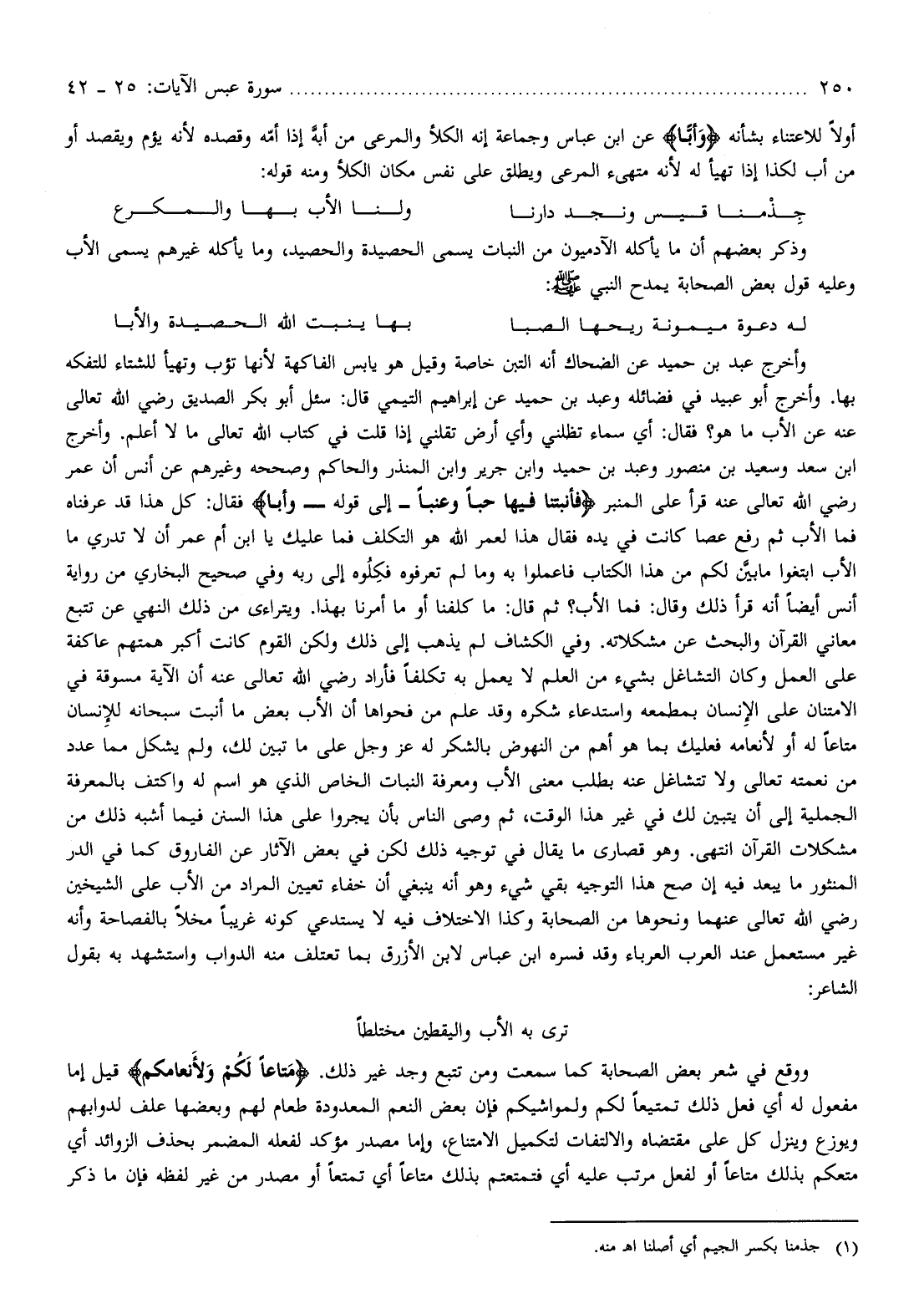 وأخرج عبد بن حميد عن الضحاك أنه التبن خاصة وقيل هو يابس الفاكهة لأنها تؤب وتهيأ للشتاء للتفكه بها. وأخرج أبو عبيد في فضائله وعبد بن حميد عن إبراهيم التيمي قال: سئل أبو بكر الصديق رضي الله تعالى عنه عن الأب ما هو؟ فقال: أي سماء تظلني وأي أرض تقلني إذا قلت في كتاب الله تعالى ما لا أعلم. وأخرج ابن سعد وسعيد بن منصور وعبد بن حميد وابن جرير وابن المنذر والحاكم وصححه وغيرهم عن أنس أن عمر رضي الله تعالى عنه قرأ على المنبر فَأَنْبَتْنا فِيها حَبًّا وَعِنَباً- إلى قوله- وَأَبًّا فقال: كل هذا قد عرفناه فما الأب ثم رفع عصا كانت في يده فقال هذا لعمر الله هو التكلف فما عليك يا ابن أم عمر أن لا تدري ما الأب ابتغوا ما بيّن لكم من هذا الكتاب فاعملوا به وما لم تعرفوه فكلوه إلى ربه وفي صحيح البخاري من رواية أنس أيضا أنه قرأ ذلك وقال: فما الأب؟ ثم قال: ما كلفنا أو ما أمرنا بهذا. ويتراءى من ذلك النهي عن تتبع معاني القرآن والبحث عن مشكلاته. وفي الكشاف لم يذهب إلى ذلك ولكن القوم كانت أكبر همتهم عاكفة على العمل وكان التشاغل بشيء من العلم لا يعمل به تكلفا فأراد رضي الله تعالى عنه أن الآية مسوقة في الامتنان على الإنسان بمطمعه واستدعاء شكره وقد علم من فحواها أن الأب بعض ما أنبت سبحانه للإنسان متاعا له أو لأنعامه فعليك بما هو أهم من النهوض بالشكر له عز وجل على ما تبين لك، ولم يشكل مما عدد من نعمته تعالى ولا تتشاغل عنه بطلب معنى الأب ومعرفة النبات الخاص الذي هو اسم له واكتف بالمعرفة الجملية إلى أن يتبين لك في غير هذا الوقت، ثم وصى الناس بأن يجروا على هذا السنن فيما أشبه ذلك من مشكلات القرآن انتهى. وهو قصارى ما يقال في توجيه ذلك لكن في بعض الآثار عن الفاروق كما في الدر المنثور ما يبعد فيه إن صح هذا التوجيه بقي شيء وهو أنه ينبغي أن خفاء تعيين المراد من الأب على الشيخين رضي الله تعالى عنهما ونحوها من الصحابة وكذا الاختلاف فيه لا يستدعي كونه غريبا مخلا بالفصاحة وأنه غير مستعمل عند العرب العرباء وقد فسره ابن عباس لابن الأزرق بما تعتلف منه الدواب واستشهد به بقول الشاعر: