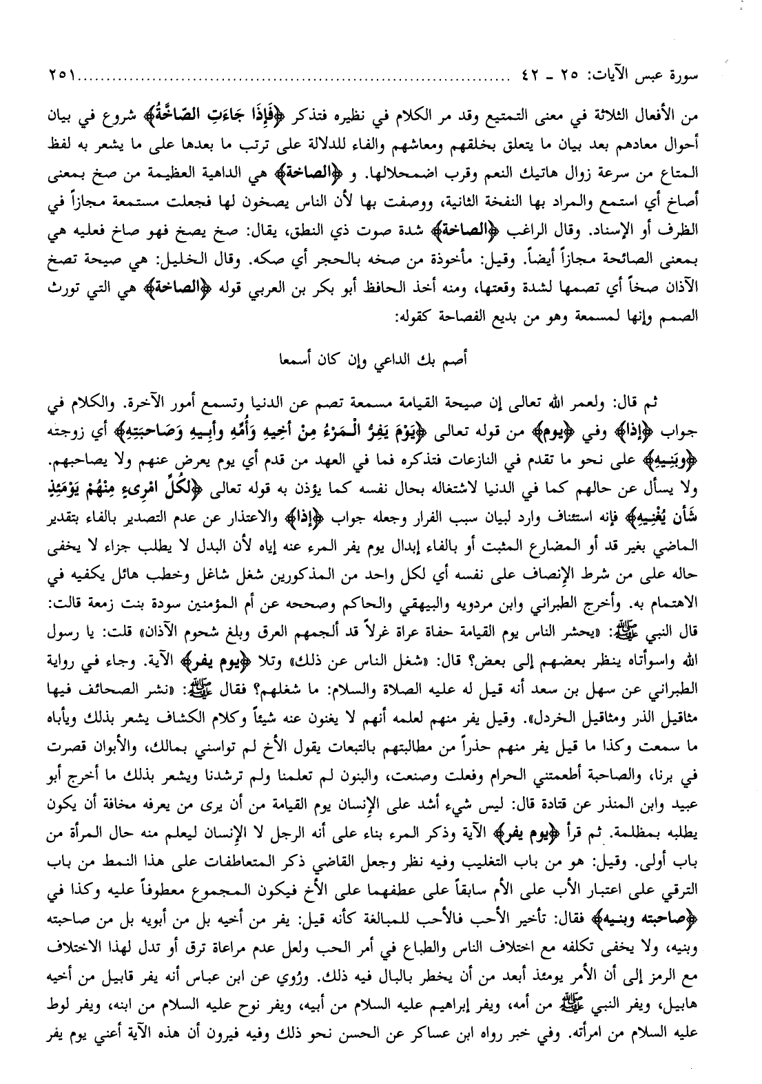 أصم بك الداعي وإن كان أسمعا ثم قال: ولعمر الله تعالى إن صيحة القيامة مسمعة تصم عن الدنيا وتسمع أمور الآخرة. والكلام في جواب (إذا) وفي يَوْمَ من قوله تعالى يَوْمَ يَفِرُّ الْمَرْءُ مِنْ أَخِيهِ وَأُمِّهِ وَأَبِيهِ وَصاحِبَتِهِ أي زوجته وَبَنِيهِ على نحو ما تقدم في النازعات فتذكره فما في العهد من قدم أي يوم يعرض عنهم ولا يصاحبهم.