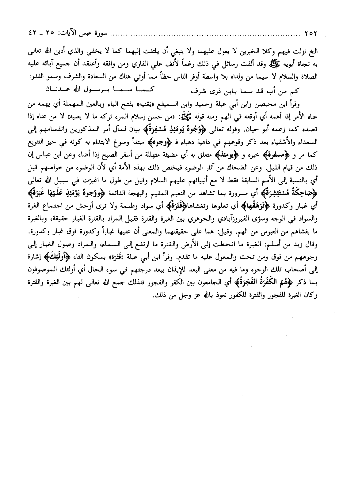 لا من عناه إذا قصده كما زعمه أبو حيان. وقوله تعالى وُجُوهٌ يَوْمَئِذٍ مُسْفِرَةٌ بيان لمآل أمر المذكورين وانقسامهم إلى السعداء والأشقياء بعد ذكر وقوعهم في داهية دهياء ف وُجُوهٌ مبتدأ وسوغ الابتداء به كونه في حيز التنويع كما مر ومُسْفِرَةٌ خبره ويَوْمَئِذٍ متعلق به أي مضيئة متهللة من أسفر الصبح إذا أضاء وعن ابن عباس إن ذلك من قيام الليل. وعن الضحاك من آثار الوضوء فيختص ذلك بهذه الأمة أي لأن الوضوء من خواصهم قيل أي بالنسبة إلى الأمم السابقة فقط لا مع أنبيائهم عليهم السلام وقيل من طول ما اغبرّت في سبيل الله تعالى ضاحِكَةٌ مُسْتَبْشِرَةٌ أي مسرورة بما تشاهد من النعيم المقيم والبهجة الدائمة وَوُجُوهٌ يَوْمَئِذٍ عَلَيْها غَبَرَةٌ أي غبار وكدورة تَرْهَقُها أي تعلوها وتغشاها قَتَرَةٌ أي سواد وظلمة ولا ترى أوحش من اجتماع الغرة والسواد في الوجه وسوّى الفيروزآبادي والجوهري بين الغبرة والقترة فقيل المراد بالقترة الغبار حقيقة، وبالغبرة ما يغشاهم من العبوس من الهم. وقيل: هما على حقيقتهما والمعنى أن عليها غبارا وكدورة فوق غبار وكدورة.