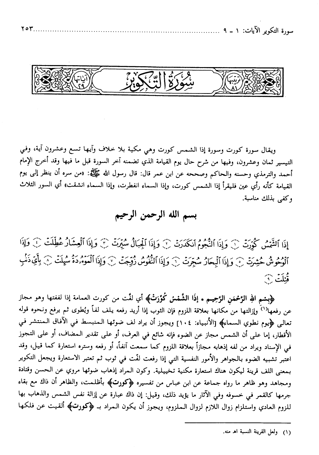 بِسْمِ اللَّهِ الرَّحْمنِ الرَّحِيمِ إِذَا الشَّمْسُ كُوِّرَتْ أي لفّت من كورت العمامة إذا لففتها وهو مجاز عن رفعها (¬1) وإزالتها من مكانها بعلاقة اللزوم فإن الثوب إذا أريد رفعه يلف لفا ويطوى ثم يرفع ونحوه قوله تعالى يَوْمَ نَطْوِي السَّماءَ [الأنبياء: 104] ويجوز أن يراد لف ضوئها المنبسط في الآفاق المنتشر في الأقطار، إما على أن الشمس مجاز عن الضوء فإنه شائع في العرف، أو على تقدير المضاف، أو على التجوز في الإسناد ويراد من لفه إذهابه مجازا بعلاقة اللزوم كما سمعت آنفا، أو رفعه وستره استعارة كما قيل، وقد اعتبر تشبيه الضوء بالجواهر والأمور النفسية التي إذا رفعت لفّت في ثوب ثم تعتبر الاستعارة ويجعل التكوير بمعنى اللف قرينة ليكون هناك استعارة مكنية تخييلية. وكون المراد إذهاب ضوئها مروي عن الحسن وقتادة ومجاهد وهو ظاهر ما رواه جماعة عن ابن عباس من تفسيره كُوِّرَتْ بأظلمت، والظاهر أن ذاك مع بقاء جرمها كالقمر في خسوفه وفي الآثار ما يؤيد ذلك، وقيل: إن ذاك عبارة عن إزالة نفس الشمس والذهاب بها للزوم العادي واستلزام زوال اللازم لزوال الملزوم، ويجوز أن يكون المراد ب كُوِّرَتْ ألقيت عن فلكها