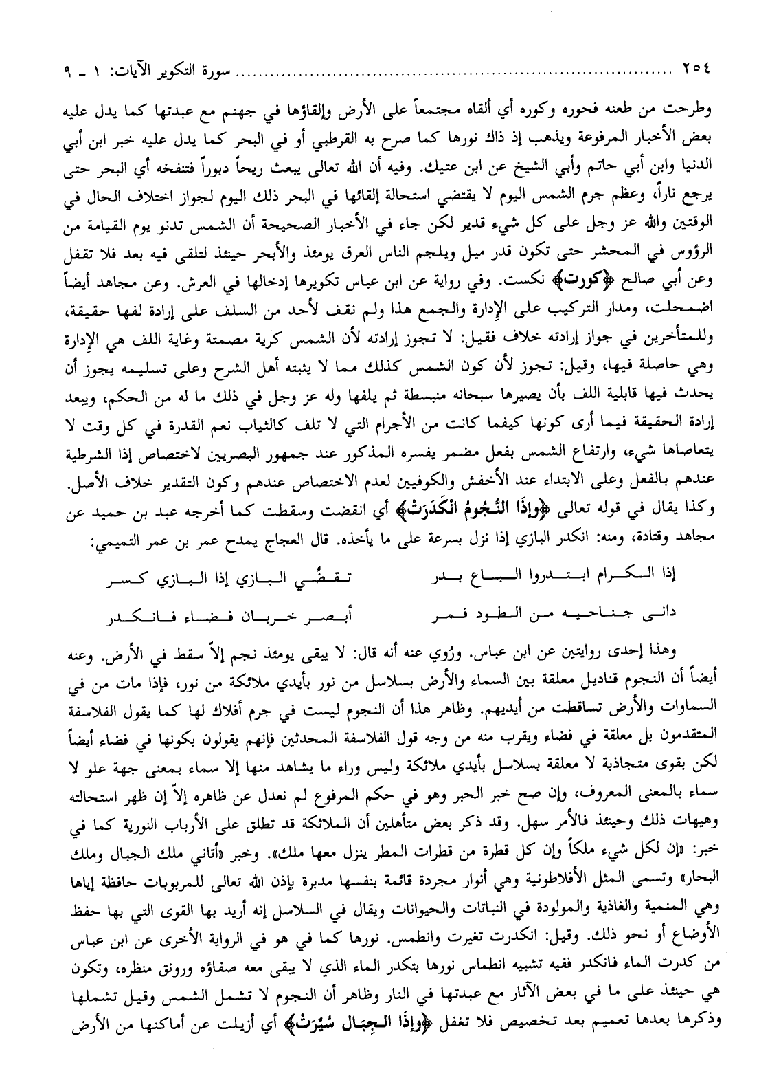وتسمى المثل الأفلاطونية وهي أنوار مجردة قائمة بنفسها مدبرة بإذن الله تعالى للمربوبات حافظة إياها وهي المنمية والغاذية والمولودة في النباتات والحيوانات ويقال في السلاسل إنه أريد بها القوى التي بها حفظ الأوضاع أو نحو ذلك. وقيل: انكدرت تغيرت وانطمس. نورها كما في هو في الرواية الأخرى عن ابن عباس من كدرت الماء فانكدر ففيه تشبيه انطماس نورها بتكدر الماء الذي لا يبقى معه صفاؤه ورونق منظره، وتكون هي حينئذ على ما في بعض الآثار مع عبدتها في النار وظاهر أن النجوم لا تشمل الشمس وقيل تشملها وذكرها بعدها تعميم بعد تخصيص فلا تغفل وَإِذَا الْجِبالُ سُيِّرَتْ أي أزيلت عن أماكنها من الأرض