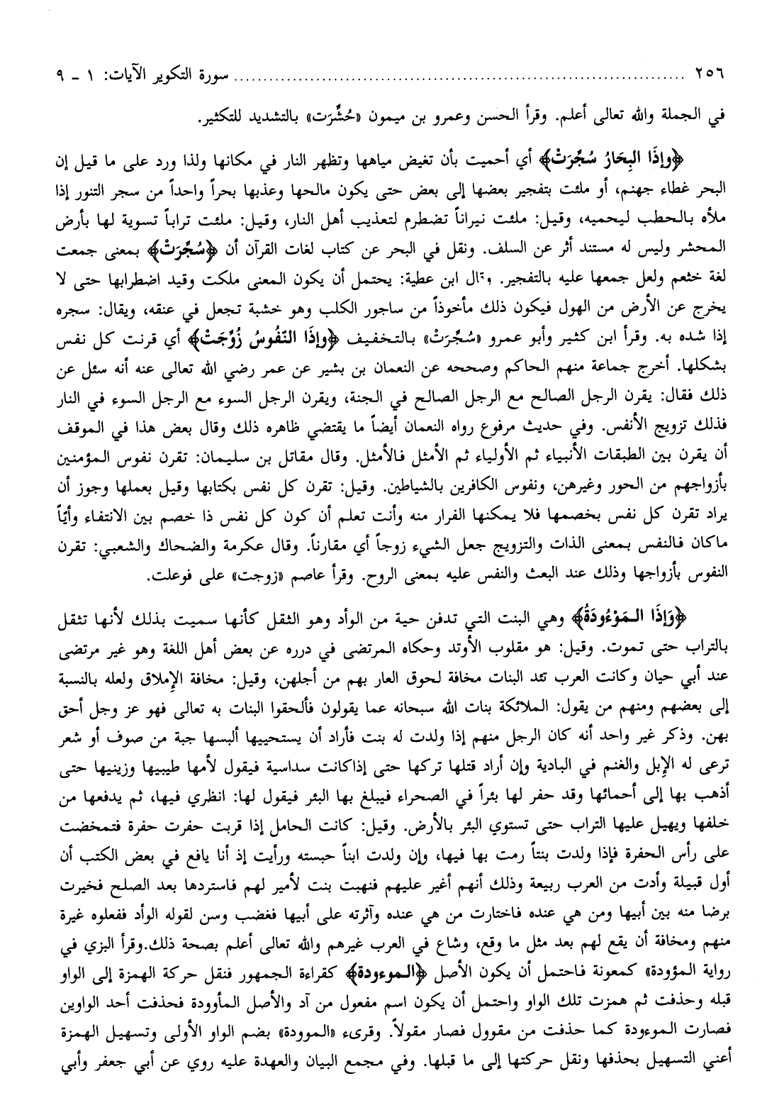وَإِذَا الْبِحارُ سُجِّرَتْ أي أحميت بأن تغيض مياهها وتظهر النار في مكانها ولذا ورد على ما قيل إن البحر غطاء جهنم، أو ملئت بتفجير بعضها إلى بعض حتى يكون مالحها وعذبها بحرا واحدا من سجر التنور إذا ملأه بالحطب ليحميه، وقيل: ملئت نيرانا تضطرم لتعذيب أهل النار، وقيل: ملئت ترابا تسوية لها بأرض المحشر وليس له مستند أثر عن السلف. ونقل في البحر عن كتاب لغات القرآن أن سُجِّرَتْ بمعنى جمعت لغة خثعم ولعل جمعها عليه بالتفجير. وقال ابن عطية: يحتمل أن يكون المعنى ملكت وقيد اضطرابها حتى لا يخرج عن الأرض من الهول فيكون ذلك مأخوذا من ساجور الكلب وهو خشبة تجعل في عنقه، ويقال: سجره إذا شده به. وقرأ ابن كثير وأبو عمرو «سجّرت» بالتخفيف وَإِذَا النُّفُوسُ زُوِّجَتْ أي قرنت كل نفس بشكلها. أخرج جماعة منهم الحاكم وصححه عن النعمان بن بشير عن عمر رضي الله تعالى عنه أنه سئل عن ذلك فقال: يقرن الرجل الصالح مع الرجل الصالح في الجنة، ويقرن الرجل السوء مع الرجل السوء في النار فذلك تزويج الأنفس. وفي حديث مرفوع رواه النعمان أيضا ما يقتضي ظاهره ذلك وقال بعض هذا في الموقف أن يقرن بين الطبقات الأنبياء ثم الأولياء ثم الأمثل فالأمثل. وقال مقاتل بن سليمان: تقرن نفوس المؤمنين بأزواجهم من الحور وغيرهن، ونفوس الكافرين بالشياطين. وقيل: تقرن كل نفس بكتابها وقيل بعملها وجوز أن يراد تقرن كل نفس بخصمها فلا يمكنها الفرار منه وأنت تعلم أن كون كل نفس ذا خصم بين الانتفاء وأيّا ما كان فالنفس بمعنى الذات والتزويج جعل الشيء زوجا أي مقارنا. وقال عكرمة والضحاك والشعبي: تقرن النفوس بأزواجها وذلك عند البعث والنفس عليه بمعنى الروح. وقرأ عاصم «زوجت» على فوعلت.