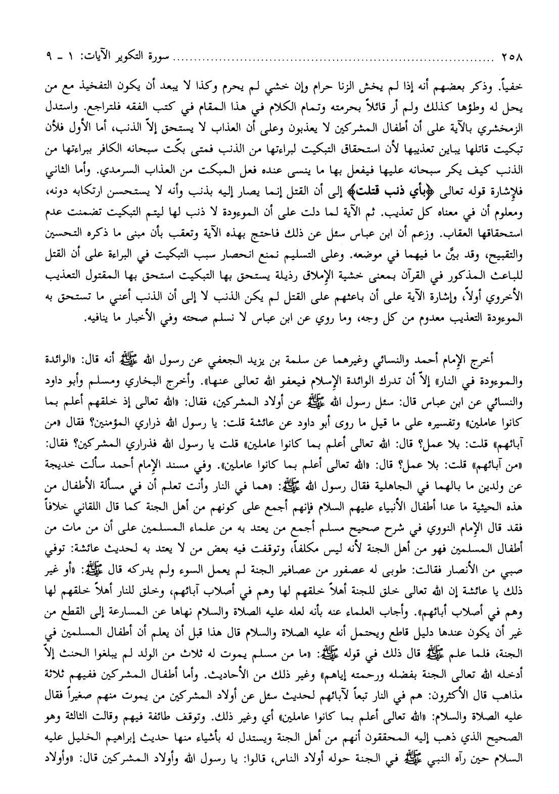 خفيا. وذكر بعضهم أنه إذا لم يخش الزنا حرام وإن خشي لم يحرم وكذا لا يبعد أن يكون التفخيذ مع من يحل له وطؤها كذلك ولم أر قائلا بحرمته وتمام الكلام في هذا المقام في كتب الفقه فلتراجع. واستدل الزمخشري بالآية على أن أطفال المشركين لا يعذبون وعلى أن العذاب لا يستحق إلّا الذنب، أما الأول فلأن تبكيت قاتلها يباين تعذيبها لأن استحقاق التبكيت لبراءتها من الذنب فمتى بكّت سبحانه الكافر ببراءتها من الذنب كيف يكر سبحانه عليها فيفعل بها ما ينسى عنده فعل المبكت من العذاب السرمدي. وأما الثاني فلإشارة قوله تعالى بِأَيِّ ذَنْبٍ قُتِلَتْ إلى أن القتل إنما يصار إليه بذنب وأنه لا يستحسن ارتكابه دونه، ومعلوم أن في معناه كل تعذيب. ثم الآية لما دلت على أن الموءودة لا ذنب لها ليتم التبكيت تضمنت عدم استحقاقها العقاب. وزعم أن ابن عباس سئل عن ذلك فاحتج بهذه الآية وتعقب بأن مبنى ما ذكره التحسين والتقبيح، وقد بيّن ما فيهما في موضعه. وعلى التسليم نمنع انحصار سبب التبكيت في البراءة على أن القتل للباعث المذكور في القرآن بمعنى خشية الإملاق رذيلة يستحق بها التبكيت استحق بها المقتول التعذيب الأخروي أولا، وإشارة الآية على أن باعثهم على القتل لم يكن الذنب لا إلى أن الذنب أعني ما تستحق به الموءودة التعذيب معدوم من كل وجه، وما روي عن ابن عباس لا نسلم صحته وفي الأخبار ما ينافيه.