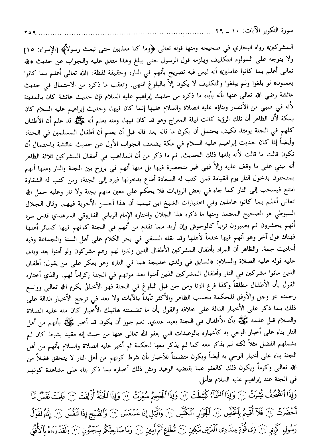 وهو يعكر على من يقول: أطفال الذين ماتوا مشركين في النار وأطفال المشركين الذين آمنوا بعد موتهم في الجنة إكراما لهم. والذي أختاره القول بأن الأطفال مطلقا وكذا فرخ الزنا ومن جن قبل البلوغ في الجنة فهو الأخلق بكرم الله تعالى وواسع رحمته عز وجل والأوفق للحكمة بحسب الظاهر والأكثر تأيدا بالآيات ولا بعد في ترجح الأخبار الدالة على ذلك بما ذكر على الأخبار الدالة على خلافه والقول بأن ما تضمنته هاتيك الأخبار كان منه عليه الصلاة والسلام قبل علمه صلّى الله عليه وسلم بأن الأطفال في الجنة بعيد عندي. نعم جوز أن يكون قد أخبر صلّى الله عليه وسلم بأنهم من أهل النار بناء على أخبار الوحي به كأخباره بالوعيدات التي يعفو الله تعالى عنها من حيث إنه مقيد بشرط كان لم يشملهم الفضل مثلا لكنه لم يذكر معه كما لم يذكر معها لحكمة ثم أخبر عليه الصلاة والسلام بأنهم من أهل الجنة بناء على أخبار الوحي به أيضا ويكون متضمنا للأخبار بأن شرط كونهم من أهل النار لا يتحقق فضلا من الله تعالى وكرما ويكون ذلك كالعفو عما يقتضيه الوعيد ومثل ذلك أخباره بما ذكر بناء على مشاهدة كونهم في الجنة عند إبراهيم عليه السلام فتأمل.