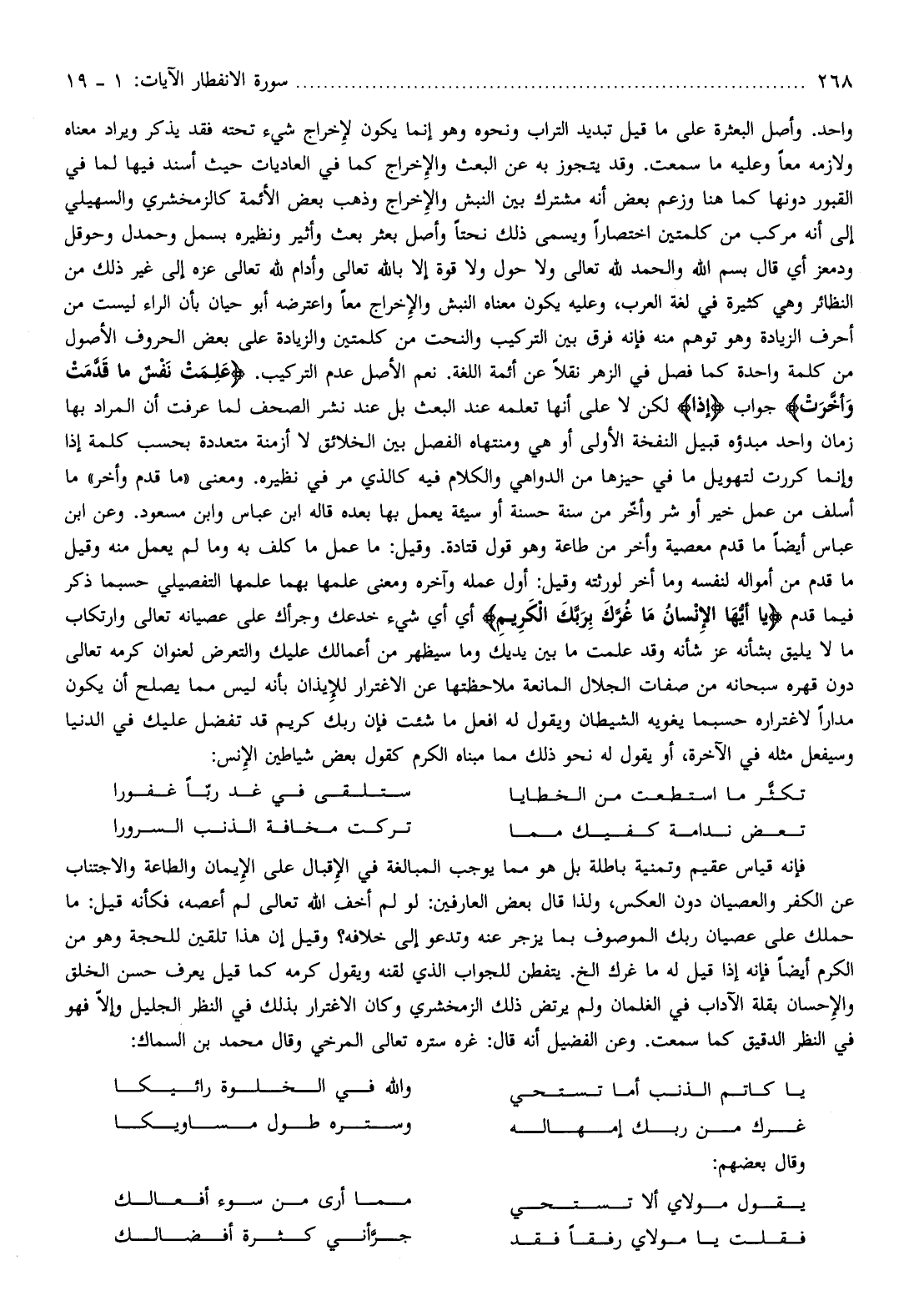 واحد. وأصل البعثرة على ما قيل تبديد التراب ونحوه وهو إنما يكون لإخراج شيء تحته فقد يذكر ويراد معناه ولازمه معا وعليه ما سمعت. وقد يتجوز به عن البعث والإخراج كما في العاديات حيث أسند فيها لما في القبور دونها كما هنا وزعم بعض أنه مشترك بين النبش والإخراج وذهب بعض الأئمة كالزمخشري والسهيلي إلى أنه مركب من كلمتين اختصارا ويسمى ذلك نحتا وأصل بعثر بعث وأثير ونظيره بسمل وحمدل وحوقل ودمعز أي قال بسم الله والحمد لله تعالى ولا حول ولا قوة إلا بالله تعالى وأدام لله تعالى عزه إلى غير ذلك من النظائر وهي كثيرة في لغة العرب، وعليه يكون معناه النبش والإخراج معا واعترضه أبو حيان بأن الراء ليست من أحرف الزيادة وهو توهم منه فإنه فرق بين التركيب والنحت من كلمتين والزيادة على بعض الحروف الأصول من كلمة واحدة كما فصل في الزهر نقلا عن أئمة اللغة. نعم الأصل عدم التركيب. عَلِمَتْ نَفْسٌ ما قَدَّمَتْ وَأَخَّرَتْ جواب إِذَا لكن لا على أنها تعلمه عند البعث بل عند نشر الصحف لما عرفت أن المراد بها زمان واحد مبدؤه قبيل النفخة الأولى أو هي ومنتهاه الفصل بين الخلائق لا أزمنة متعددة بحسب كلمة إذا وإنما كررت لتهويل ما في حيزها من الدواهي والكلام فيه كالذي مر في نظيره. ومعنى «ما قدم وأخر» ما أسلف من عمل خير أو شر وأخّر من سنة حسنة أو سيئة يعمل بها بعده قاله ابن عباس وابن مسعود. وعن ابن عباس أيضا ما قدم معصية وأخر من طاعة وهو قول قتادة. وقيل: ما عمل ما كلف به وما لم يعمل منه وقيل ما قدم من أمواله لنفسه وما أخر لورثته وقيل: أول عمله وآخره ومعنى علمها بهما علمها التفصيلي حسبما ذكر فيما قدم يا أَيُّهَا الْإِنْسانُ ما غَرَّكَ بِرَبِّكَ الْكَرِيمِ أي أي شيء خدعك وجرأك على عصيانه تعالى وارتكاب ما لا يليق بشأنه عز شأنه وقد علمت ما بين يديك وما سيظهر من أعمالك عليك والتعرض لعنوان كرمه تعالى دون قهره سبحانه من صفات الجلال المانعة ملاحظتها عن الاغترار للإيذان بأنه ليس مما يصلح أن يكون مدارا لاغتراره حسبما يغويه الشيطان ويقول له افعل ما شئت فإن ربك كريم قد تفضل عليك في الدنيا وسيفعل مثله في الآخرة، أو يقول له نحو ذلك مما مبناه الكرم كقول بعض شياطين الإنس: