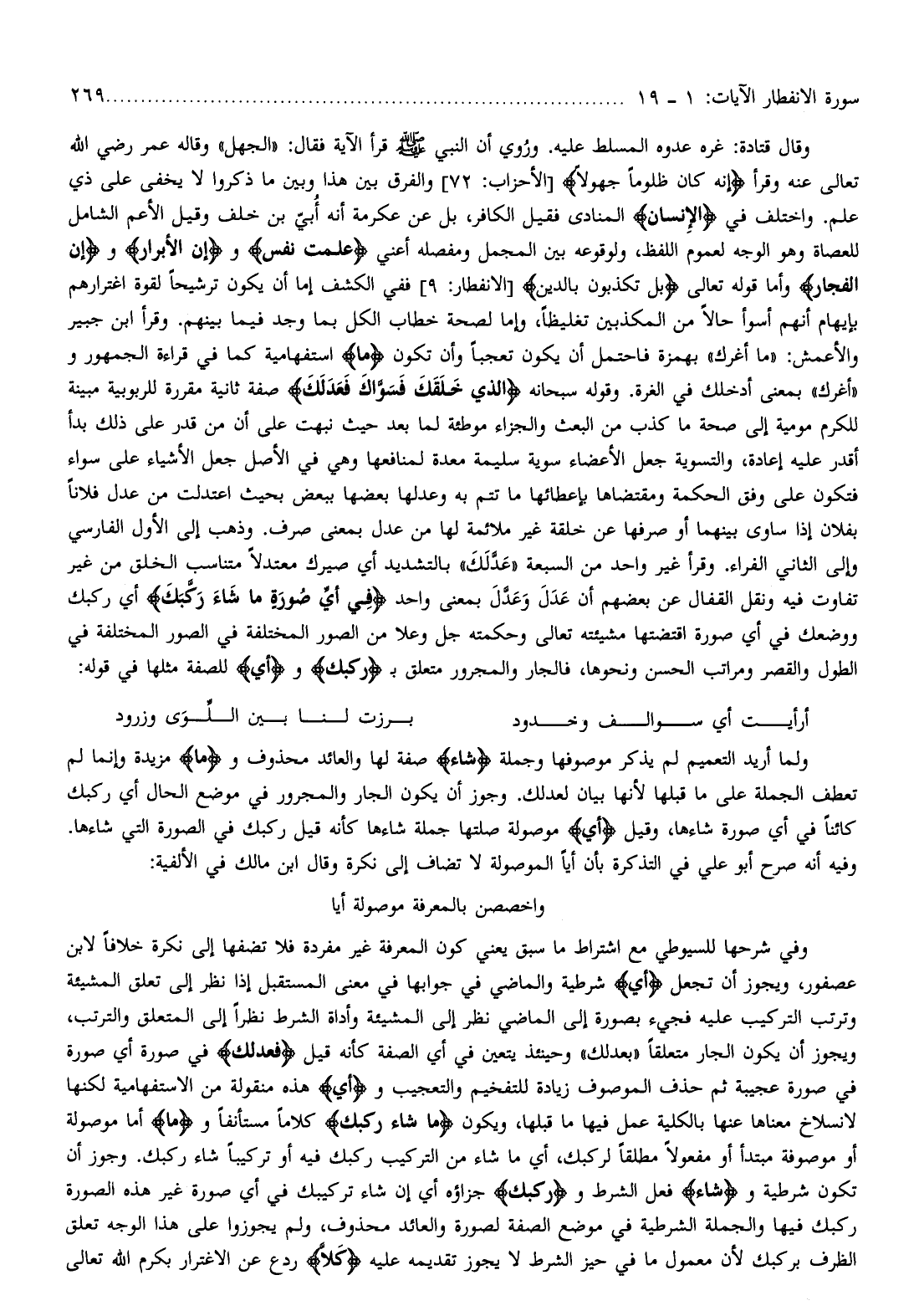 واخصصن بالمعرفة موصولة أيا وفي شرحها للسيوطي مع اشتراط ما سبق يعني كون المعرفة غير مفردة فلا تضفها إلى نكرة خلافا لابن عصفور، ويجوز أن تجعل أَيِّ شرطية والماضي في جوابها في معنى المستقبل إذا نظر إلى تعلق المشيئة وترتب التركيب عليه فجيء بصورة إلى الماضي نظر إلى المشيئة وأداة الشرط نظرا إلى المتعلق والترتب، ويجوز أن يكون الجار متعلقا «بعدلك» وحينئذ يتعين في أي الصفة كأنه قيل فَعَدَلَكَ في صورة أي صورة في صورة عجيبة ثم حذف الموصوف زيادة للتفخيم والتعجيب وأَيِّ هذه منقولة من الاستفهامية لكنها لانسلاخ معناها عنها بالكلية عمل فيها ما قبلها، ويكون ما شاءَ رَكَّبَكَ كلاما مستأنفا وما أما موصولة أو موصوفة مبتدأ أو مفعولا مطلقا لركبك، أي ما شاء من التركيب ركبك فيه أو تركيبا شاء ركبك. وجوز أن تكون شرطية وشاءَ فعل الشرط ورَكَّبَكَ جزاؤه أي إن شاء تركيبك في أي صورة غير هذه الصورة ركبك فيها والجملة الشرطية في موضع الصفة لصورة والعائد محذوف، ولم يجوزوا على هذا الوجه تعلق الظرف بركبك لأن معمول ما في حيز الشرط لا يجوز تقديمه عليه كَلَّا ردع عن الاغترار بكرم الله تعالى