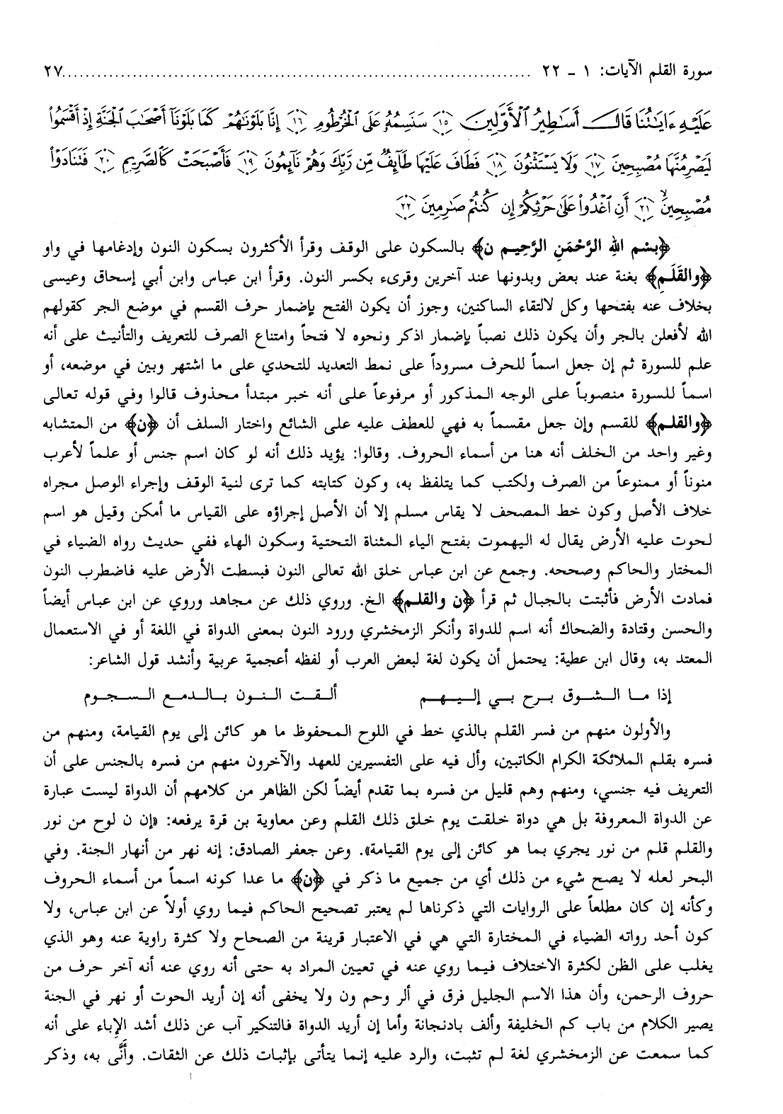 بِسْمِ اللَّهِ الرَّحْمنِ الرَّحِيمِ ن بالسكون على الوقف وقرأ الأكثرون بسكون النون وإدغامها في واو وَالْقَلَمِ بغنة عند بعض وبدونها عند آخرين وقرىء بكسر النون. وقرأ ابن عباس وابن أبي إسحاق وعيسى بخلاف عنه بفتحها وكل لالتقاء الساكنين، وجوز أن يكون الفتح بإضمار حرف القسم في موضع الجر كقولهم الله لأفعلن بالجر وأن يكون ذلك نصبا بإضمار اذكر ونحوه لا فتحا وامتناع الصرف للتعريف والتأنيث على أنه علم للسورة ثم إن جعل اسما للحرف مسرودا على نمط التعديد للتحدي على ما اشتهر وبين في موضعه، أو اسما للسورة منصوبا على الوجه المذكور أو مرفوعا على أنه خبر مبتدأ محذوف قالوا وفي قوله تعالى وَالْقَلَمِ للقسم وإن جعل مقسما به فهي للعطف عليه على الشائع واختار السلف أن ن من المتشابه وغير واحد من الخلف أنه هنا من أسماء الحروف. وقالوا: يؤيد ذلك أنه لو كان اسم جنس أو علما لأعرب منونا أو ممنوعا من الصرف ولكتب كما يتلفظ به، وكون كتابته كما ترى لنية الوقف وإجراء الوصل مجراه خلاف الأصل وكون خط المصحف لا يقاس مسلم إلا أن الأصل إجراؤه على القياس ما أمكن وقيل هو اسم لحوت عليه الأرض يقال له اليهموت بفتح الياء المثناة التحتية وسكون الهاء ففي حديث رواه الضياء في المختار والحاكم وصححه. وجمع عن ابن عباس خلق الله تعالى النون فبسطت الأرض عليه فاضطرب النون فمادت الأرض فأثبتت بالجبال ثم قرأ ن وَالْقَلَمِ إلخ. وروي ذلك عن مجاهد وروي عن ابن عباس أيضا والحسن وقتادة والضحاك أنه اسم للدواة وأنكر الزمخشري ورود النون بمعنى الدواة في اللغة أو في الاستعمال المعتد به، وقال ابن عطية: يحتمل أن يكون لغة لبعض العرب أو لفظه أعجمية عربية وأنشد قول الشاعر: