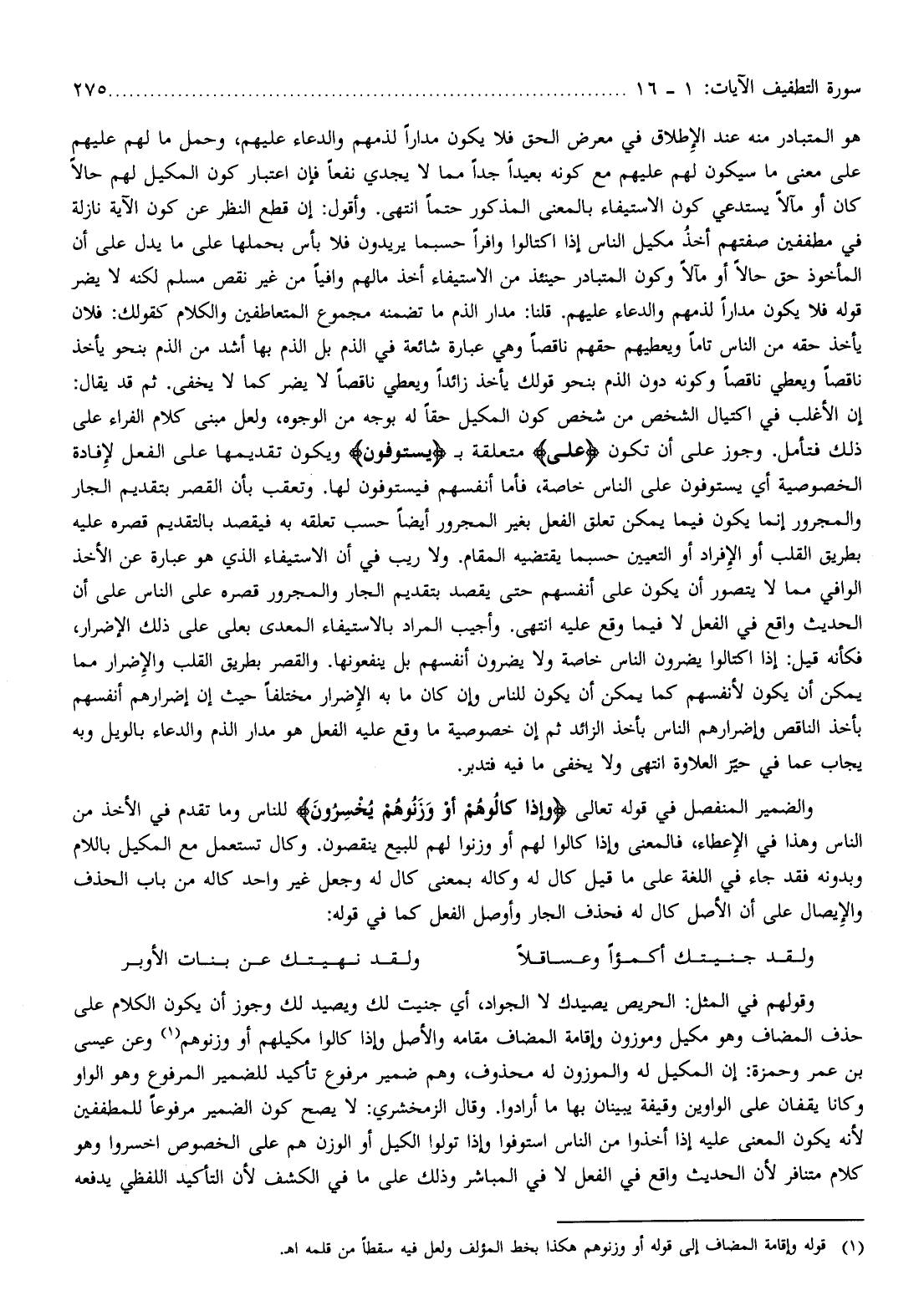 والضمير المنفصل في قوله تعالى وَإِذا كالُوهُمْ أَوْ وَزَنُوهُمْ يُخْسِرُونَ للناس وما تقدم في الأخذ من الناس وهذا في الإعطاء، فالمعنى وإذا كالوا لهم أو وزنوا لهم للبيع ينقصون. وكال تستعمل مع المكيل باللام وبدونه فقد جاء في اللغة على ما قيل كال له وكاله بمعنى كال له وجعل غير واحد كاله من باب الحذف والإيصال على أن الأصل كال له فحذف الجار وأوصل الفعل كما في قوله: