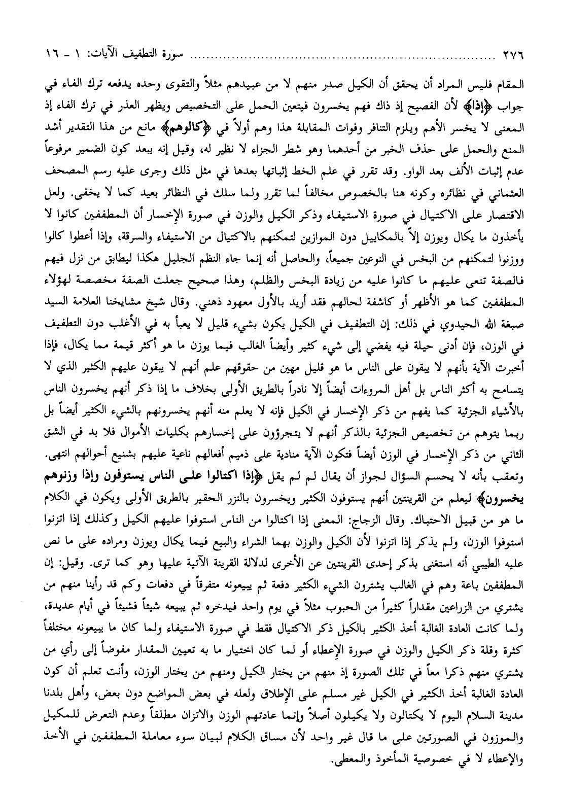 المقام فليس المراد أن يحقق أن الكيل صدر منهم لا من عبيدهم مثلا والتقوى وحده يدفعه ترك الفاء في جواب إِذا لأن الفصيح إذ ذاك فهم يخسرون فيتعين الحمل على التخصيص ويظهر العذر في ترك الفاء إذ المعنى لا يخسر الأهم ويلزم التنافر وفوات المقابلة هذا وهم أولا في كالُوهُمْ مانع من هذا التقدير أشد المنع والحمل على حذف الخبر من أحدهما وهو شطر الجزاء لا نظير له، وقيل إنه يبعد كون الضمير مرفوعا عدم إثبات الألف بعد الواو. وقد تقرر في علم الخط إثباتها بعدها في مثل ذلك وجرى عليه رسم المصحف العثماني في نظائره وكونه هنا بالخصوص مخالفا لما تقرر ولما سلك في النظائر بعيد كما لا يخفى. ولعل الاقتصار على الاكتيال في صورة الاستيفاء وذكر الكيل والوزن في صورة الإخسار أن المطففين كانوا لا يأخذون ما يكال ويوزن إلّا بالمكاييل دون الموازين لتمكنهم بالاكتيال من الاستيفاء والسرقة، وإذا أعطوا كالوا ووزنوا لتمكنهم من البخس في النوعين جميعا، والحاصل أنه إنما جاء النظم الجليل هكذا ليطابق من نزل فيهم فالصفة تنعى عليهم ما كانوا عليه من زيادة البخس والظلم، وهذا صحيح جعلت الصفة مخصصة لهؤلاء المطففين كما هو الأظهر أو كاشفة لحالهم فقد أريد بالأول معهود ذهني. وقال شيخ مشايخنا العلامة السيد صبغة الله الحيدري في ذلك: إن التطفيف في الكيل يكون بشيء قليل لا يعبأ به في الأغلب دون التطفيف في الوزن، فإن أدنى حيلة فيه يفضي إلى شيء كثير وأيضا الغالب فيما يوزن ما هو أكثر قيمة مما يكال، فإذا أخبرت الآية بأنهم لا يبقون على الناس ما هو قليل مهين من حقوقهم علم أنهم لا يبقون عليهم الكثير الذي لا يتسامح به أكثر الناس بل أهل المروءات أيضا إلا نادرا بالطريق الأولى بخلاف ما إذا ذكر أنهم يخسرون الناس بالأشياء الجزئية كما يفهم من ذكر الإخسار في الكيل فإنه لا يعلم منه أنهم يخسرونهم بالشيء الكثير أيضا بل ربما يتوهم من تخصيص الجزئية بالذكر أنهم لا يتجرؤون على إخسارهم بكليات الأموال فلا بد في الشق الثاني من ذكر الإخسار في الوزن أيضا فتكون الآية منادية على ذميم أفعالهم ناعية عليهم بشنيع أحوالهم انتهى.