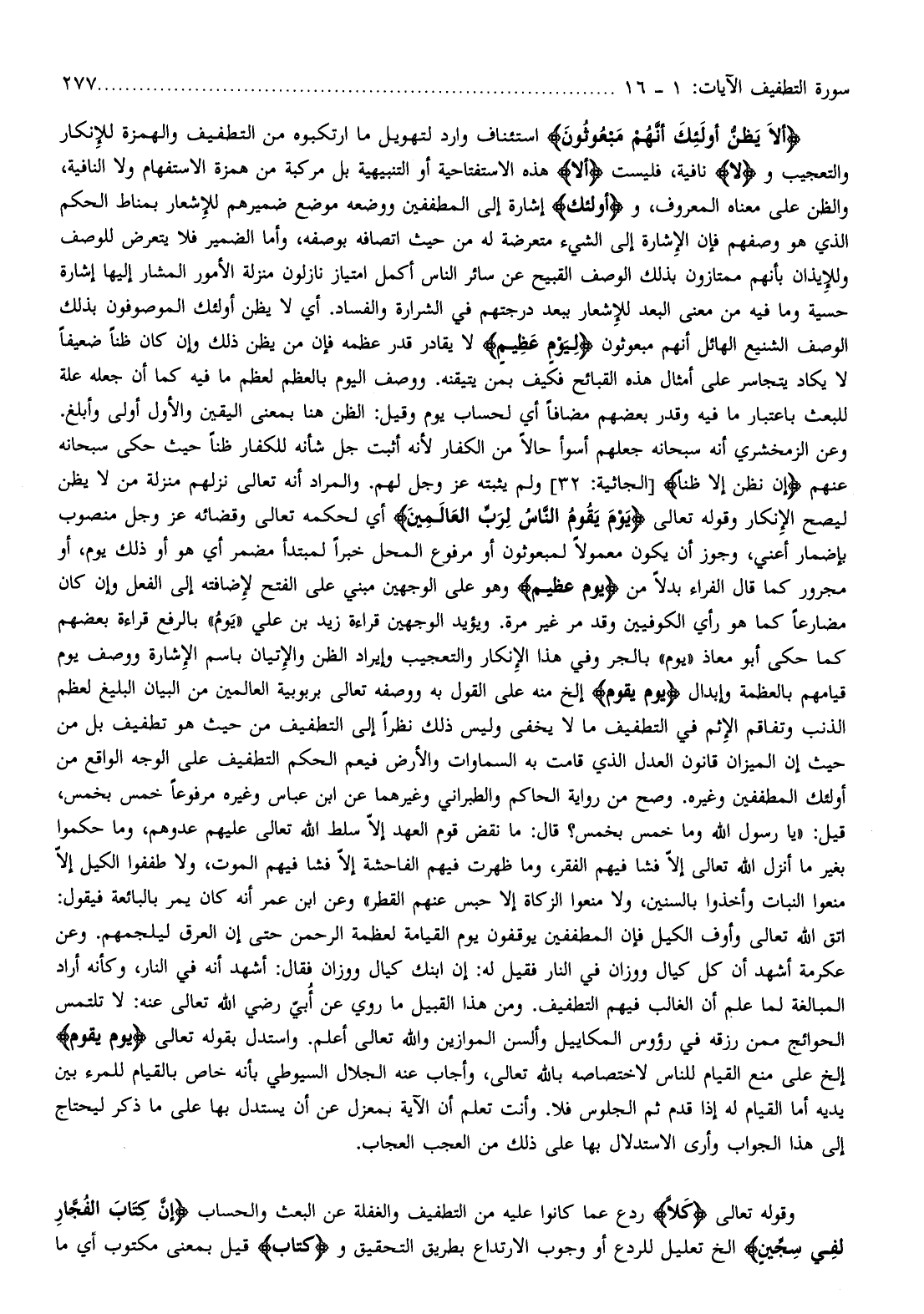 وعن الزمخشري أنه سبحانه جعلهم أسوأ حالا من الكفار لأنه أثبت جل شأنه للكفار ظنا حيث حكى سبحانه عنهم إِنْ نَظُنُّ إِلَّا ظَنًّا [الجاثية: 32] ولم يثبته عز وجل لهم. والمراد أنه تعالى نزلهم منزلة من لا يظن ليصح الإنكار وقوله تعالى يَوْمَ يَقُومُ النَّاسُ لِرَبِّ الْعالَمِينَ أي لحكمه تعالى وقضائه عز وجل منصوب بإضمار أعني، وجوز أن يكون معمولا لمبعوثون أو مرفوع المحل خبرا لمبتدأ مضمر أي هو أو ذلك يوم، أو مجرور كما قال الفراء بدلا من يوم عَظِيمٍ وهو على الوجهين مبني على الفتح لإضافته إلى الفعل وإن كان مضارعا كما هو رأي الكوفيين وقد مر غير مرة. ويؤيد الوجهين قراءة زيد بن علي «يوم» بالرفع قراءة بعضهم كما حكى أبو معاذ «يوم» بالجر وفي هذا الإنكار والتعجيب وإيراد الظن والإتيان باسم الإشارة ووصف يوم قيامهم بالعظمة وإبدال يَوْمَ يَقُومُ إلخ منه على القول به ووصفه تعالى بربوبية العالمين من البيان البليغ لعظم الذنب وتفاقم الإثم في التطفيف ما لا يخفى وليس ذلك نظرا إلى التطفيف من حيث هو تطفيف بل من حيث إن الميزان قانون العدل الذي قامت به السماوات والأرض فيعم الحكم التطفيف على الوجه الواقع من أولئك المطففين وغيره.