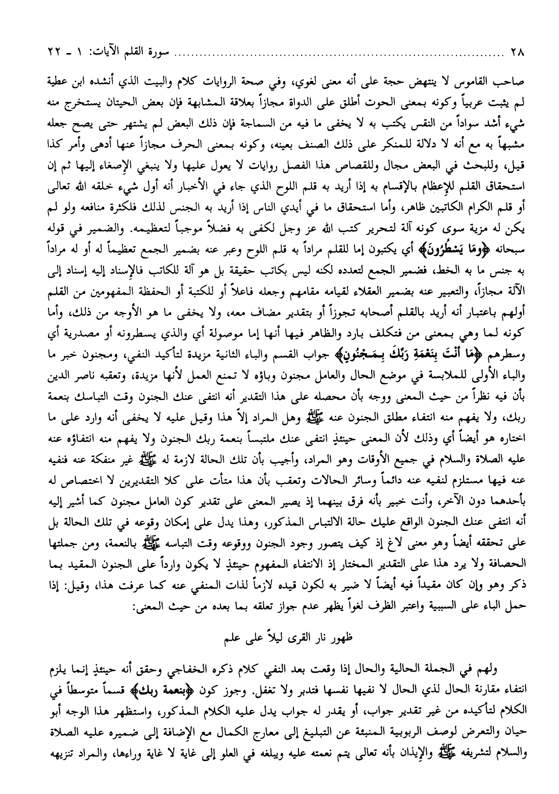 صاحب القاموس لا ينتهض حجة على أنه معنى لغوي، وفي صحة الروايات كلام والبيت الذي أنشده ابن عطية لم يثبت عربيا وكونه بمعنى الحوت أطلق على الدواة مجازا بعلاقة المشابهة فإن بعض الحيتان يستخرج منه شيء أشد سوادا من النقس يكتب به لا يخفى ما فيه من السماجة فإن ذلك البعض لم يشتهر حتى يصح جعله مشبها به مع أنه لا دلالة للمنكر على ذلك الصنف بعينه، وكونه بمعنى الحرف مجازا عنها أدهى وأمر كذا قيل، وللبحث في البعض مجال وللقصاص هذا الفصل روايات لا يعول عليها ولا ينبغي الإصغاء إليها ثم إن استحقاق القلم للإعظام بالإقسام به إذا أريد به قلم اللوح الذي جاء في الأخبار أنه أول شيء خلقه الله تعالى أو قلم الكرام الكاتبين ظاهر، وأما استحقاق ما في أيدي الناس إذا أريد به الجنس لذلك فلكثرة منافعه ولو لم يكن له مزية سوى كونه آلة لتحرير كتب الله عز وجل لكفى به فضلا موجبا لتعظيمه. والضمير في قوله سبحانه وَما يَسْطُرُونَ أي يكتبون إما للقلم مرادا به قلم اللوح وعبر عنه بضمير الجمع تعظيما له أو له مرادا به جنس ما به الخط، فضمير الجمع لتعدده لكنه ليس بكاتب حقيقة بل هو آلة للكاتب فالإسناد إليه إسناد إلى الآلة مجازا، والتعبير عنه بضمير العقلاء لقيامه مقامهم وجعله فاعلا أو للكتبة أو الحفظة المفهومين من القلم أولهم باعتبار أنه أريد بالقلم أصحابه تجوزا أو بتقدير مضاف معه، ولا يخفى ما هو الأوجه من ذلك، وأما كونه لما وهي بمعنى من فتكلف بارد والظاهر فيها أنها إما موصولة أي والذي يسطرونه أو مصدرية أي وسطرهم ما أَنْتَ بِنِعْمَةِ رَبِّكَ بِمَجْنُونٍ جواب القسم والباء الثانية مزيدة لتأكيد النفي، ومجنون خبر ما والباء الأولى للملابسة في موضع الحال والعامل مجنون وباؤه لا تمنع العمل لأنها مزيدة، وتعقبه ناصر الدين بأن فيه نظرا من حيث المعنى ووجه بأن محصله على هذا التقدير أنه انتفى عنك الجنون وقت التباسك بنعمة ربك، ولا يفهم منه انتفاء مطلق الجنون عنه صلّى الله عليه وسلم وهل المراد إلّا هذا وقيل عليه لا يخفى أنه وارد على ما اختاره هو أيضا أي وذلك لأن المعنى حينئذ انتفى عنك ملتبسا بنعمة ربك الجنون ولا يفهم منه انتفاؤه عنه عليه الصلاة والسلام في جميع الأوقات وهو المراد، وأجيب بأن تلك الحالة لازمة له صلّى الله عليه وسلم غير منفكة عنه فنفيه عنه فيها مستلزم لنفيه عنه دائما وسائر الحالات وتعقب بأن هذا متأت على كلا التقديرين لا اختصاص له بأحدهما دون الآخر، وأنت خبير بأنه فرق بينهما إذ يصير المعنى على تقدير كون العامل مجنون كما أشير إليه أنه انتفى عنك الجنون الواقع عليك حالة الالتباس المذكور، وهذا يدل على إمكان وقوعه في تلك الحالة بل على تحققه أيضا وهو معنى لاغ إذ كيف يتصور وجود الجنون ووقوعه وقت التباسه صلّى الله عليه وسلم بالنعمة، ومن جملتها الحصافة ولا يرد هذا على التقدير المختار إذ الانتفاء المفهوم حينئذ لا يكون واردا على الجنون المقيد بما ذكر وهو وإن كان مقيدا فيه أيضا لا ضير به لكون قيده لازما لذات المنفي عنه كما عرفت هذا، وقيل: إذا حمل الباء على السببية واعتبر الظرف لغوا يظهر عدم جواز تعلقه بما بعده من حيث المعنى: