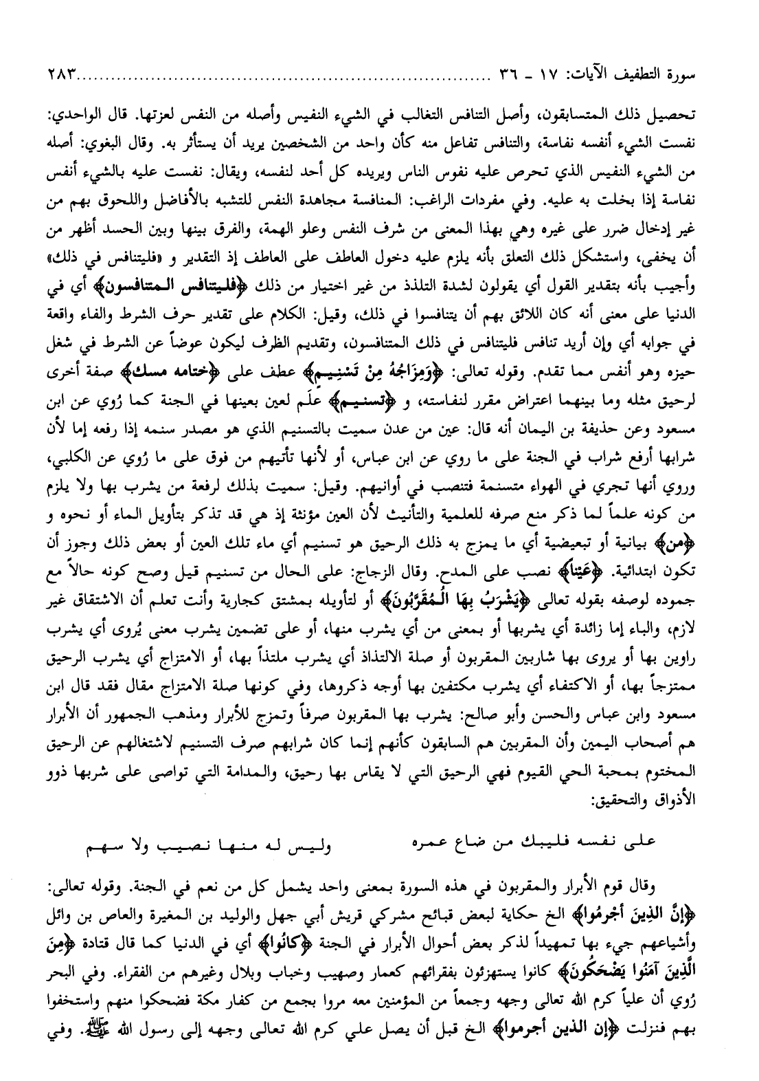 نفست الشيء أنفسه نفاسة، والتنافس تفاعل منه كأن واحد من الشخصين يريد أن يستأثر به. وقال البغوي: أصله من الشيء النفيس الذي تحرص عليه نفوس الناس ويريده كل أحد لنفسه، ويقال: نفست عليه بالشيء أنفس نفاسة إذا بخلت به عليه. وفي مفردات الراغب: المنافسة مجاهدة النفس للتشبه بالأفاضل واللحوق بهم من غير إدخال ضرر على غيره وهي بهذا المعنى من شرف النفس وعلو الهمة، والفرق بينها وبين الحسد أظهر من أن يخفى، واستشكل ذلك التعلق بأنه يلزم عليه دخول العاطف على العاطف إذ التقدير و «فليتنافس في ذلك» وأجيب بأنه بتقدير القول أي يقولون لشدة التلذذ من غير اختيار من ذلك فَلْيَتَنافَسِ الْمُتَنافِسُونَ أي في الدنيا على معنى أنه كان اللائق بهم أن يتنافسوا في ذلك، وقيل: الكلام على تقدير حرف الشرط والفاء واقعة في جوابه أي وإن أريد تنافس فليتنافس في ذلك المتنافسون، وتقديم الظرف ليكون عوضا عن الشرط في شغل حيزه وهو أنفس مما تقدم. وقوله تعالى: وَمِزاجُهُ مِنْ تَسْنِيمٍ عطف على خِتامُهُ مِسْكٌ صفة أخرى لرحيق مثله وما بينهما اعتراض مقرر لنفاسته، وتَسْنِيمٍ علم لعين بعينها في الجنة كما روي عن ابن مسعود وعن حذيفة بن اليمان أنه قال: عين من عدن سميت بالتسنيم الذي هو مصدر سنمه إذا رفعه إما لأن شرابها أرفع شراب في الجنة على ما روي عن ابن عباس، أو لأنها تأتيهم من فوق على ما روي عن الكلبي، وروي أنها تجري في الهواء متسنمة فتنصب في أوانيهم. وقيل: سميت بذلك لرفعة من يشرب بها ولا يلزم من كونه علما لما ذكر منع صرفه للعلمية والتأنيث لأن العين مؤنثة إذ هي قد تذكر بتأويل الماء أو نحوه ومِنْ بيانية أو تبعيضية أي ما يمزج به ذلك الرحيق هو تسنيم أي ماء تلك العين أو بعض ذلك وجوز أن تكون ابتدائية. عَيْناً نصب على المدح. وقال الزجاج: على الحال من تسنيم قيل وصح كونه حالا مع جموده لوصفه بقوله تعالى يَشْرَبُ بِهَا الْمُقَرَّبُونَ أو لتأويله بمشتق كجارية وأنت تعلم أن الاشتقاق غير لازم، والباء إما زائدة أي يشربها أو بمعنى من أي يشرب منها، أو على تضمين يشرب معنى يروى أي يشرب راوين بها أو يروى بها شاربين المقربون أو صلة الالتذاذ أي يشرب ملتذا بها، أو الامتزاج أي يشرب الرحيق ممتزجا بها، أو الاكتفاء أي يشرب مكتفين بها أوجه ذكروها، وفي كونها صلة الامتزاج مقال فقد قال ابن مسعود وابن عباس والحسن وأبو صالح: يشرب بها المقربون صرفا وتمزج للأبرار ومذهب الجمهور أن الأبرار هم أصحاب اليمين وأن المقربين هم السابقون كأنهم إنما كان شرابهم صرف التسنيم لاشتغالهم عن الرحيق المختوم بمحبة الحي القيوم فهي الرحيق التي لا يقاس بها رحيق، والمدامة التي تواصى على شربها ذو والأذواق والتحقيق: