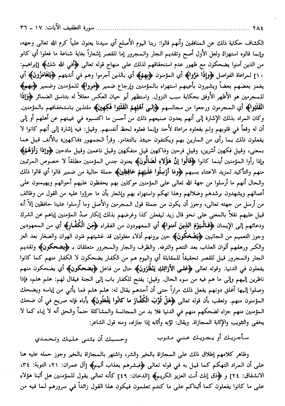 وكان المراد بذلك الإشارة إلى أنهم يعدون صنيعهم ذلك من أحسن ما اكتسبوه في غيبتهم عن أهلهم أو إلى أن له وقعا في قلوبهم ولم يفعلوه مراعاة لأحد وإنما فعلوه لحظ أنفسهم. وقيل: فيه إشارة إلى أنهم كانوا لا يفعلون ذلك بما رأى من المارين بهم ويكتفون حينئذ بالتغامز. وقرأ الجمهور «فاكهين» بالألف قيل هما بمعنى، وقيل فكهين أشرين، وقيل فرحين وفاكهين قيل متفكهين وقيل ناعمين وقيل مادحين وَإِذا رَأَوْهُمْ وإذا رأوا المؤمنين أينما كانوا قالُوا إِنَّ هؤُلاءِ لَضالُّونَ يعنون جنس المؤمنين مطلقا لا خصوص المرئيين منهم والتأكيد لمزيد الاعتناء بسبهم وَما أُرْسِلُوا عَلَيْهِمْ حافِظِينَ جملة حالية من ضمير قالوا أي قالوا ذلك والحال أنهم ما أرسلوا من جهة الله تعالى على المؤمنين موكلين بهم يحفظون عليهم أحوالهم ويهيمنون على أعمالهم ويشهدون برشدهم وضلالهم وهذا تهكم واستهزاء بهم وإشعار بأن ما جرؤوا عليه من القول من وظائف من أرسل من جهته تعالى، وجوز أن يكون من جملة قول المجرمين والأصل وما أرسلوا علينا حافظين إلّا أنه قيل عليهم نقلا بالمعنى على نحو قال زيد ليفعلن كذا وغرضهم بذلك إنكار صدّ المؤمنين إياهم عن الشرك ودعائهم إلى الإيمان فَالْيَوْمَ الَّذِينَ آمَنُوا أي المعهودون من الفقراء مِنَ الْكُفَّارِ أي من المعهودين وجوز التعميم من الجانبين يَضْحَكُونَ حين يرونهم أذلاء مغلولين قد غشيتهم فنون الهوان والصغار بعد العز والكبر ورهقهم ألوان العذاب بعد التنعم والترفه. والظرف والجار والمجرور متعلقان ب يَضْحَكُونَ وتقديم الجار والمجرور قيل للقصر تحقيقا للمقابلة أي واليوم هم من الكفار يضحكون لا الكفار منهم كما كانوا يفعلون في الدنيا. وقوله تعالى عَلَى الْأَرائِكِ يَنْظُرُونَ حال من فاعل يَضْحَكُونَ أي يضحكون منهم ناظرين إليهم وإلى ما هم فيه من سوء الحال. وقيل: يفتح للكفار باب إلى الجنة فيقال لهم: هلم هلم، فإذا وصلوا إليها أغلق دونهم يفعل ذلك مرارا حتى أن أحدهم يقال له: هلم هلم فما يأتي من إياسه ويضحك المؤمنون منهم. وتعقب بأن قوله تعالى هَلْ ثُوِّبَ الْكُفَّارُ ما كانُوا يَفْعَلُونَ يأباه فإنه صريح في أن ضحك المؤمنين منهم جزاء لضحكهم منهم في الدنيا فلا بد من المجانسة والمشاكلة حتما والحق أنه لا إباء كما لا يخفى والتثويب والإثابة المجازاة. ويقال: ثوّبه وأثابه إذا جازاه، ومنه قول الشاعر: