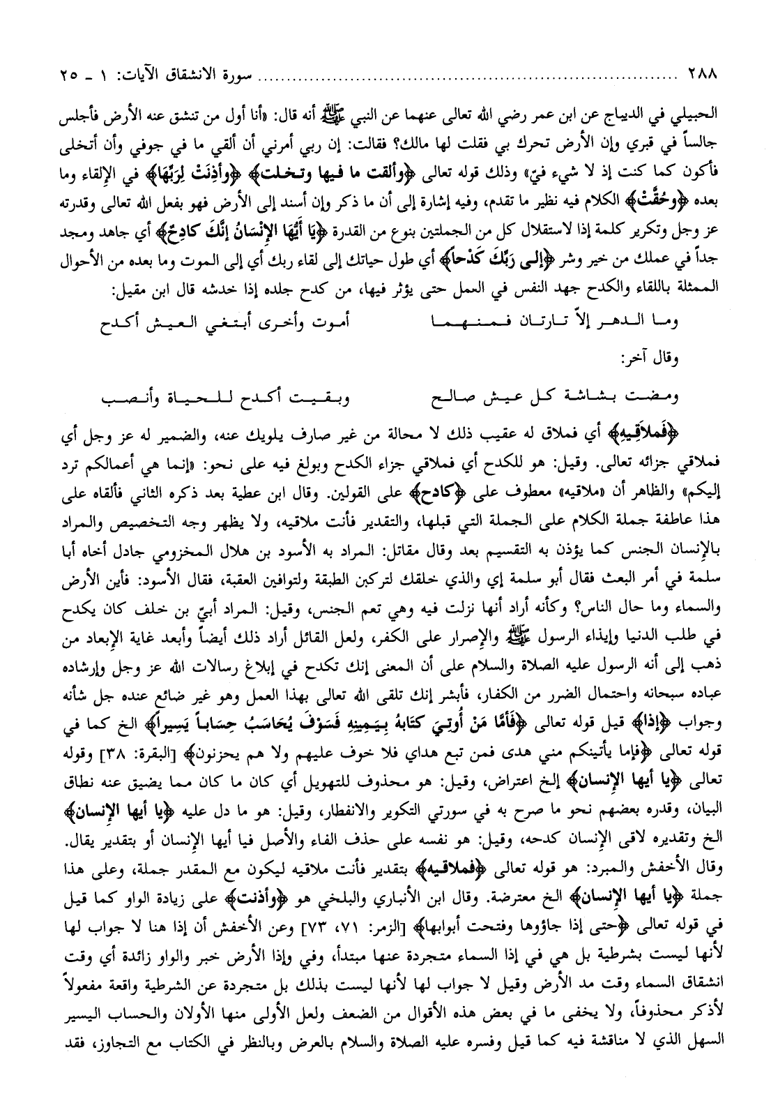 وذلك قوله تعالى وَأَلْقَتْ ما فِيها وَتَخَلَّتْ وَأَذِنَتْ لِرَبِّها في الإلقاء وما بعده وَحُقَّتْ الكلام فيه نظير ما تقدم، وفيه إشارة إلى أن ما ذكر وإن أسند إلى الأرض فهو بفعل الله تعالى وقدرته عز وجل وتكرير كلمة إذا لاستقلال كل من الجملتين بنوع من القدرة يا أَيُّهَا الْإِنْسانُ إِنَّكَ كادِحٌ أي جاهد ومجد جدا في عملك من خير وشر إِلى رَبِّكَ كَدْحاً أي طول حياتك إلى لقاء ربك أي إلى الموت وما بعده من الأحوال الممثلة باللقاء والكدح جهد النفس في العمل حتى يؤثر فيها، من كدح جلده إذا خدشه قال ابن مقيل: