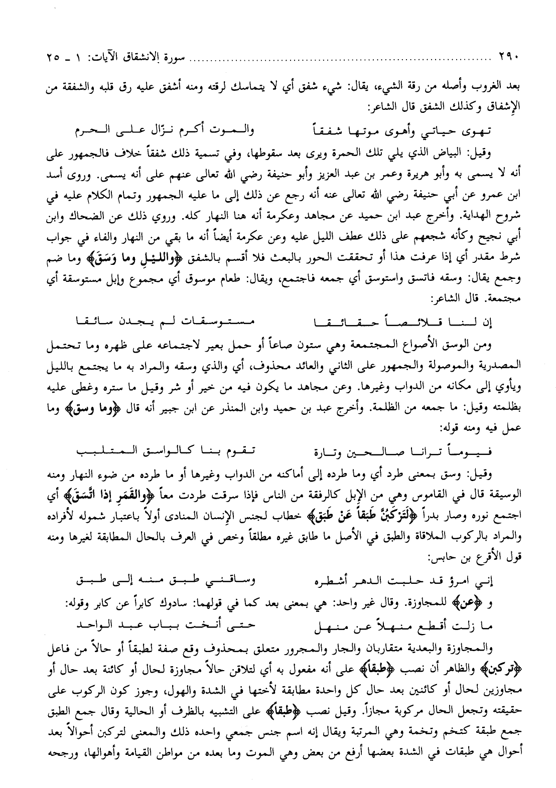 وقيل: وسق بمعنى طرد أي وما طرده إلى أماكنه من الدواب وغيرها أو ما طرده من ضوء النهار ومنه الوسيقة قال في القاموس وهي من الإبل كالرفقة من الناس فإذا سرقت طردت معا وَالْقَمَرِ إِذَا اتَّسَقَ أي اجتمع نوره وصار بدرا لَتَرْكَبُنَّ طَبَقاً عَنْ طَبَقٍ خطاب لجنس الإنسان المنادى أولا باعتبار شموله لأفراده والمراد بالركوب الملاقاة والطبق في الأصل ما طابق غيره مطلقا وخص في العرف بالحال المطابقة لغيرها ومنه قول الأقرع بن حابس: