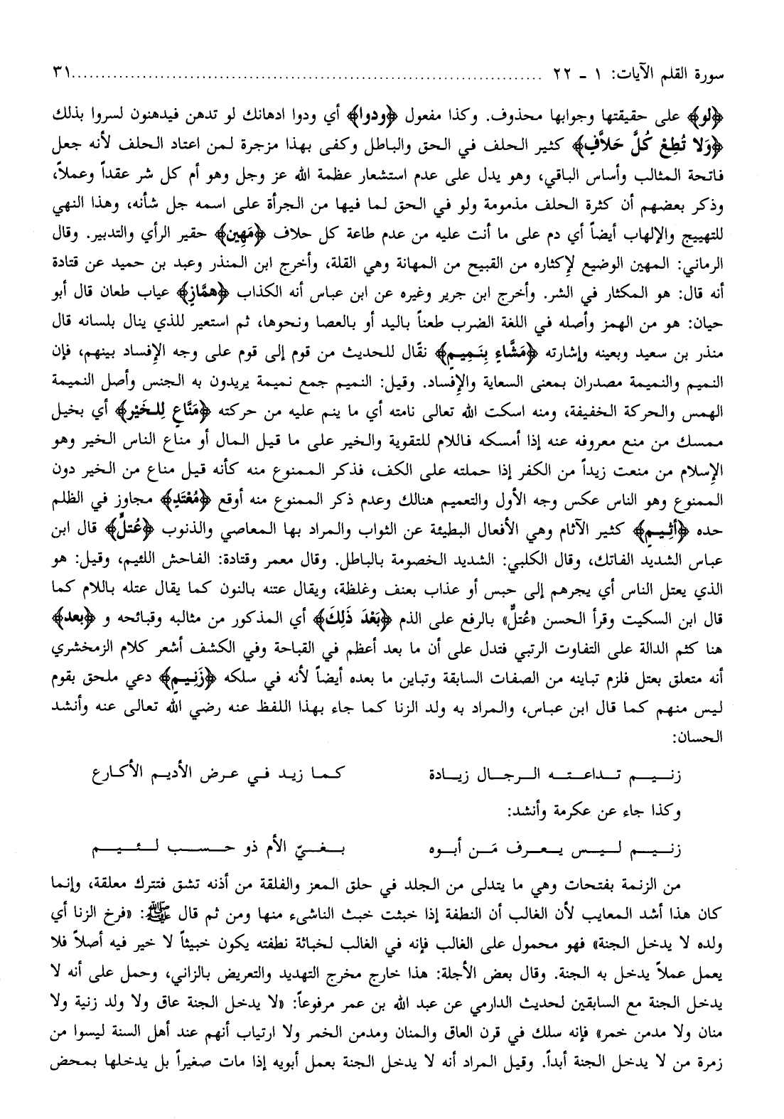 لَوْ على حقيقتها وجوابها محذوف. وكذا مفعول وَدُّوا أي ودوا ادهانك لو تدهن فيدهنون لسروا بذلك وَلا تُطِعْ كُلَّ حَلَّافٍ كثير الحلف في الحق والباطل وكفى بهذا مزجرة لمن اعتاد الحلف لأنه جعل فاتحة المثالب وأساس الباقي، وهو يدل على عدم استشعار عظمة الله عز وجل وهو أم كل شر عقدا وعملا، وذكر بعضهم أن كثرة الحلف مذمومة ولو في الحق لما فيها من الجرأة على اسمه جل شأنه، وهذا النهي للتهييج والإلهاب أيضا أي دم على ما أنت عليه من عدم طاعة كل حلاف مَهِينٍ حقير الرأي والتدبير. وقال الرماني: المهين الوضيع لإكثاره من القبيح من المهانة وهي القلة، وأخرج ابن المنذر وعبد بن حميد عن قتادة أنه قال: هو المكثار في الشر. وأخرج ابن جرير وغيره عن ابن عباس أنه الكذاب هَمَّازٍ عياب طعان قال أبو حيان: هو من الهمز وأصله في اللغة الضرب طعنا باليد أو بالعصا ونحوها، ثم استعير للذي ينال بلسانه قال منذر بن سعيد وبعينه وإشارته مَشَّاءٍ بِنَمِيمٍ نقّال للحديث من قوم إلى قوم على وجه الإفساد بينهم، فإن النميم والنميمة مصدران بمعنى السعاية والإفساد. وقيل: النميم جمع نميمة يريدون به الجنس وأصل النميمة الهمس والحركة الخفيفة، ومنه اسكت الله تعالى نامته أي ما ينم عليه من حركته مَنَّاعٍ لِلْخَيْرِ أي بخيل ممسك من منع معروفه عنه إذا أمسكه فاللام للتقوية والخير على ما قيل المال أو مناع الناس الخير وهو الإسلام من منعت زيدا من الكفر إذا حملته على الكف، فذكر الممنوع منه كأنه قيل مناع من الخير دون الممنوع وهو الناس عكس وجه الأول والتعميم هنالك وعدم ذكر الممنوع منه أوقع مُعْتَدٍ مجاوز في الظلم حده أَثِيمٍ كثير الآثام وهي الأفعال البطيئة عن الثواب والمراد بها المعاصي والذنوب عُتُلٍّ قال ابن عباس الشديد الفاتك، وقال الكلبي: الشديد الخصومة بالباطل. وقال معمر وقتادة: الفاحش اللئيم، وقيل: هو الذي يعتل الناس أي يجرهم إلى حبس أو عذاب بعنف وغلظة، ويقال عتنه بالنون كما يقال عتله باللام كما قال ابن السكيت وقرأ الحسن «عتلّ» بالرفع على