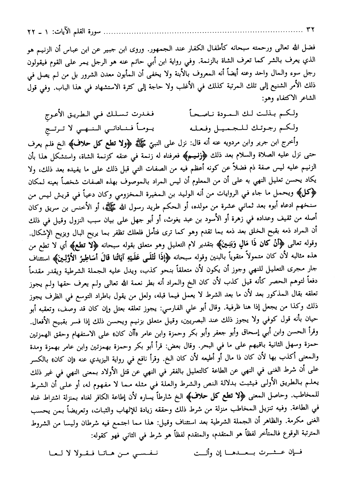 وأخرج ابن جرير وابن مردويه عنه أنه قال: نزل على النبيّ صلّى الله عليه وسلم وَلا تُطِعْ كُلَّ حَلَّافٍ إلخ فلم يعرف حتى نزل عليه الصلاة والسلام بعد ذلك زَنِيمٍ فعرفناه له زنمة في عنقه كزنمة الشاة، واستشكل هذا بأن الزنيم عليه ليس صفة ذم فضلا عن كونه أعظم فيه من الصفات التي قبل ذلك على ما يفيده بعد ذلك، ولا يكاد يحسن تعليل النهي به على أن من المعلوم أن ليس المراد بالموصوف بهذه الصفات شخصا بعينه لمكان كُلَّ ويحمل ما جاء في الروايات من أنه الوليد بن المغيرة المخزومي وكان دعيا في قريش ليس من سنخهم ادعاه أبوه بعد ثماني عشرة من مولده، أو الحكم طريد رسول الله صلّى الله عليه وسلم، أو الأخنس بن سريق وكان أصله من ثقيف وعداده في زهرة أو الأسود بن عبد يغوث، أو أبو جهل على بيان سبب النزول وقيل في ذلك أن المراد ذمه بقبح الخلق بعد ذمه بما تقدم وهو كما ترى فتأمل فلعلك تظفر بما يريح البال ويزيح الإشكال.