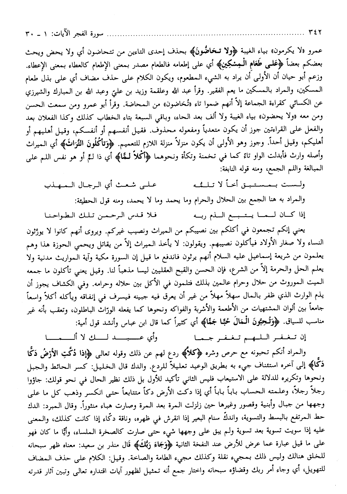 عمرو «لا يكرمون» بياء الغيبة وَلا تَحَاضُّونَ بحذف إحدى التاءين من تتحاضون أي ولا يحض ويحث بعضكم بعضا عَلى طَعامِ الْمِسْكِينِ أي على إطعامه فالطعام مصدر بمعنى الإطعام كالعطاء بمعنى الإعطاء.
