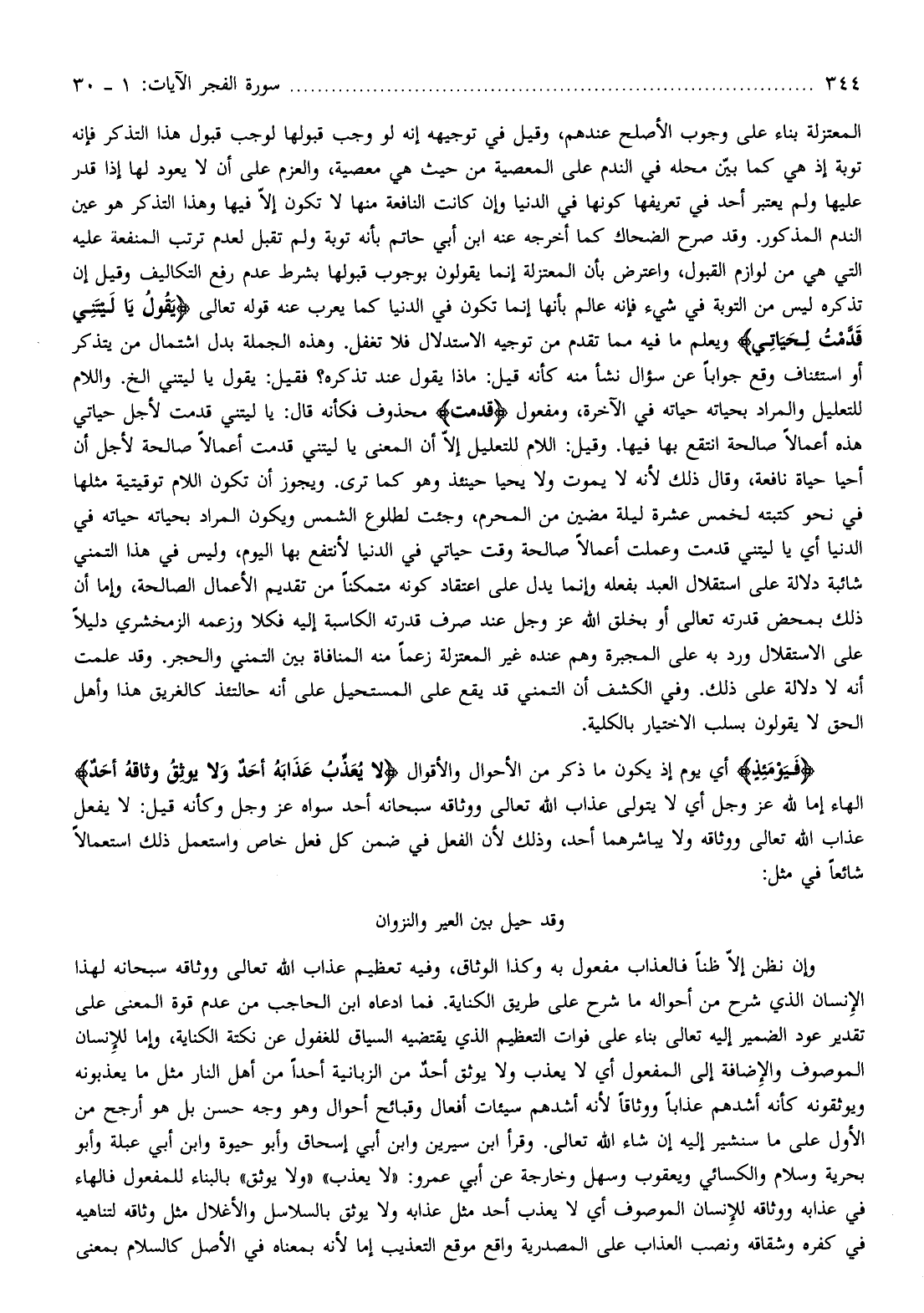المعتزلة بناء على وجوب الأصلح عندهم، وقيل في توجيهه إنه لو وجب قبولها لوجب قبول هذا التذكر فإنه توبة إذ هي كما بيّن محله في الندم على المعصية من حيث هي معصية، والعزم على أن لا يعود لها إذا قدر عليها ولم يعتبر أحد في تعريفها كونها في الدنيا وإن كانت النافعة منها لا تكون إلّا فيها وهذا التذكر هو عين الندم المذكور. وقد صرح الضحاك كما أخرجه عنه ابن أبي حاتم بأنه توبة ولم تقبل لعدم ترتب المنفعة عليه التي هي من لوازم القبول، واعترض بأن المعتزلة إنما يقولون بوجوب قبولها بشرط عدم رفع التكاليف وقيل إن تذكره ليس من التوبة في شيء فإنه عالم بأنها إنما تكون في الدنيا كما يعرب عنه قوله تعالى يَقُولُ يا لَيْتَنِي قَدَّمْتُ لِحَياتِي ويعلم ما فيه مما تقدم من توجيه الاستدلال فلا تغفل. وهذه الجملة بدل اشتمال من يتذكر أو استئناف وقع جوابا عن سؤال نشأ منه كأنه قيل: ماذا يقول عند تذكره؟ فقيل: يقول يا ليتني إلخ. واللام للتعليل والمراد بحياته حياته في الآخرة، ومفعول قَدَّمْتُ محذوف فكأنه قال: يا ليتني قدمت لأجل حياتي هذه أعمالا صالحة انتقع بها فيها. وقيل: اللام للتعليل إلّا أن المعنى يا ليتني قدمت أعمالا صالحة لأجل أن أحيا حياة نافعة، وقال ذلك لأنه لا يموت ولا يحيا حينئذ وهو كما ترى. ويجوز أن تكون اللام توقيتية مثلها في نحو كتبته لخمس عشرة ليلة مضين من المحرم، وجئت لطلوع الشمس ويكون المراد بحياته حياته في الدنيا أي يا ليتني قدمت وعملت أعمالا صالحة وقت حياتي في الدنيا لأنتفع بها اليوم، وليس في هذا التمني شائبة دلالة على استقلال العبد بفعله وإنما يدل على اعتقاد كونه متمكنا من تقديم الأعمال الصالحة، وإما أن ذلك بمحض قدرته تعالى أو بخلق الله عز وجل عند صرف قدرته الكاسبة إليه فكلا وزعمه الزمخشري دليلا على الاستقلال ورد به على المجبرة وهم عنده غير المعتزلة زعما منه المنافاة بين التمني والحجر. وقد علمت أنه لا دلالة على ذلك. وفي الكشف أن التمني قد يقع على المستحيل على أنه حالتئذ كالغريق هذا وأهل الحق لا يقولون بسلب الاختيار بالكلية.