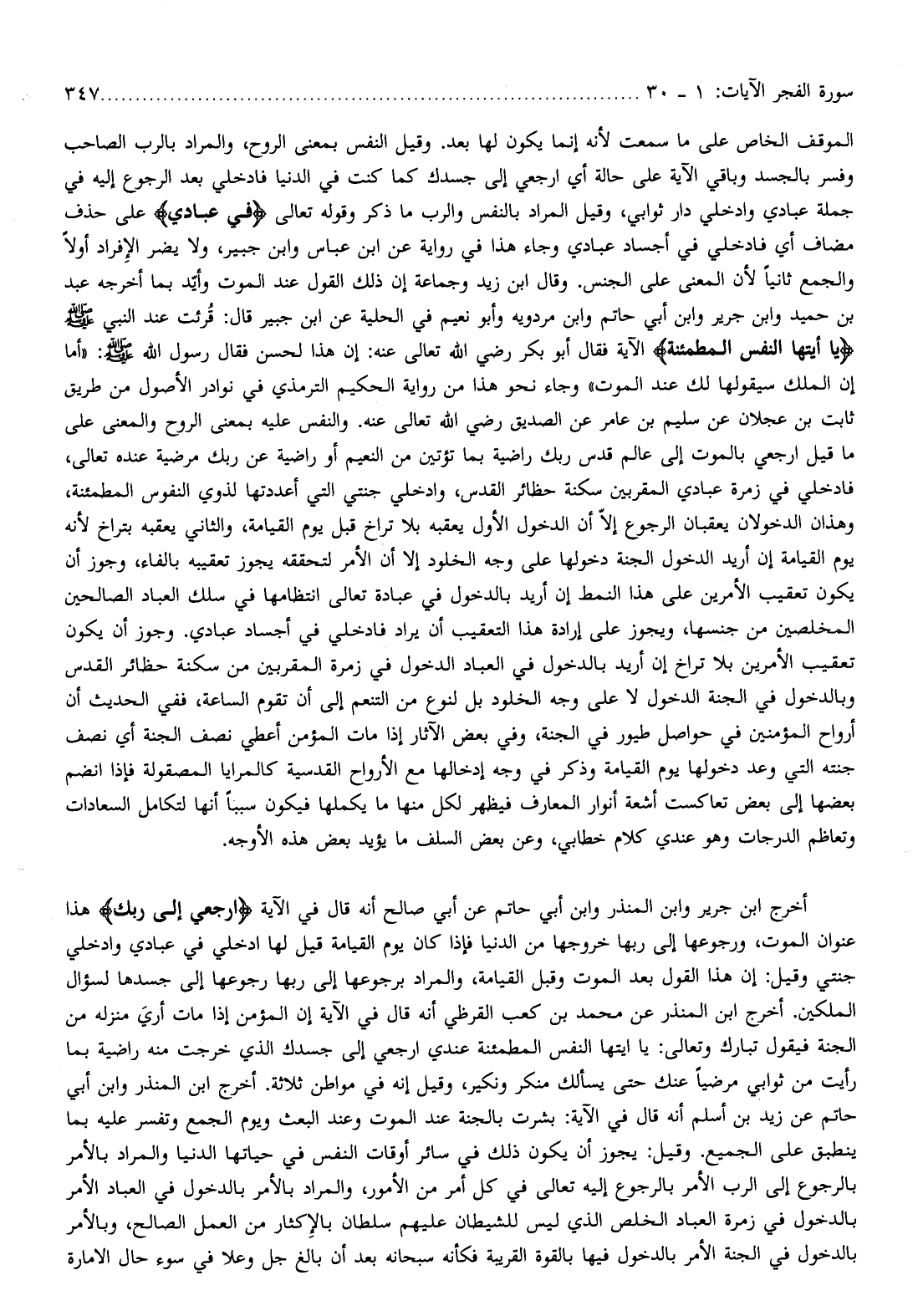 أخرج ابن جرير وابن المنذر وابن أبي حاتم عن أبي صالح أنه قال في الآية ارْجِعِي إِلى رَبِّكِ هذا عنوان الموت، ورجوعها إلى ربها خروجها من الدنيا فإذا كان يوم القيامة قيل لها ادخلي في عبادي وادخلي جنتي وقيل: إن هذا القول بعد الموت وقبل القيامة، والمراد برجوعها إلى ربها رجوعها إلى جسدها لسؤال الملكين. أخرج ابن المنذر عن محمد بن كعب القرظي أنه قال في الآية إن المؤمن إذا مات أري منزله من الجنة فيقول تبارك وتعالى: يا أيتها النفس المطمئنة عندي ارجعي إلى جسدك الذي خرجت منه راضية بما رأيت من ثوابي مرضيا عنك حتى يسألك منكر ونكير، وقيل إنه في مواطن ثلاثة. أخرج ابن المنذر وابن أبي حاتم عن زيد بن أسلم أنه قال في الآية: بشرت بالجنة عند الموت وعند البعث ويوم الجمع وتفسر عليه بما ينطبق على الجميع. وقيل: يجوز أن يكون ذلك في سائر أوقات النفس في حياتها الدنيا والمراد بالأمر بالرجوع إلى الرب الأمر بالرجوع إليه تعالى في كل أمر من الأمور، والمراد بالأمر بالدخول في العباد الأمر بالدخول في زمرة العباد الخلص الذي ليس للشيطان عليهم سلطان بالإكثار من العمل الصالح، وبالأمر بالدخول في الجنة الأمر بالدخول فيها بالقوة القريبة فكأنه سبحانه بعد أن بالغ جل وعلا في سوء حال الامارة