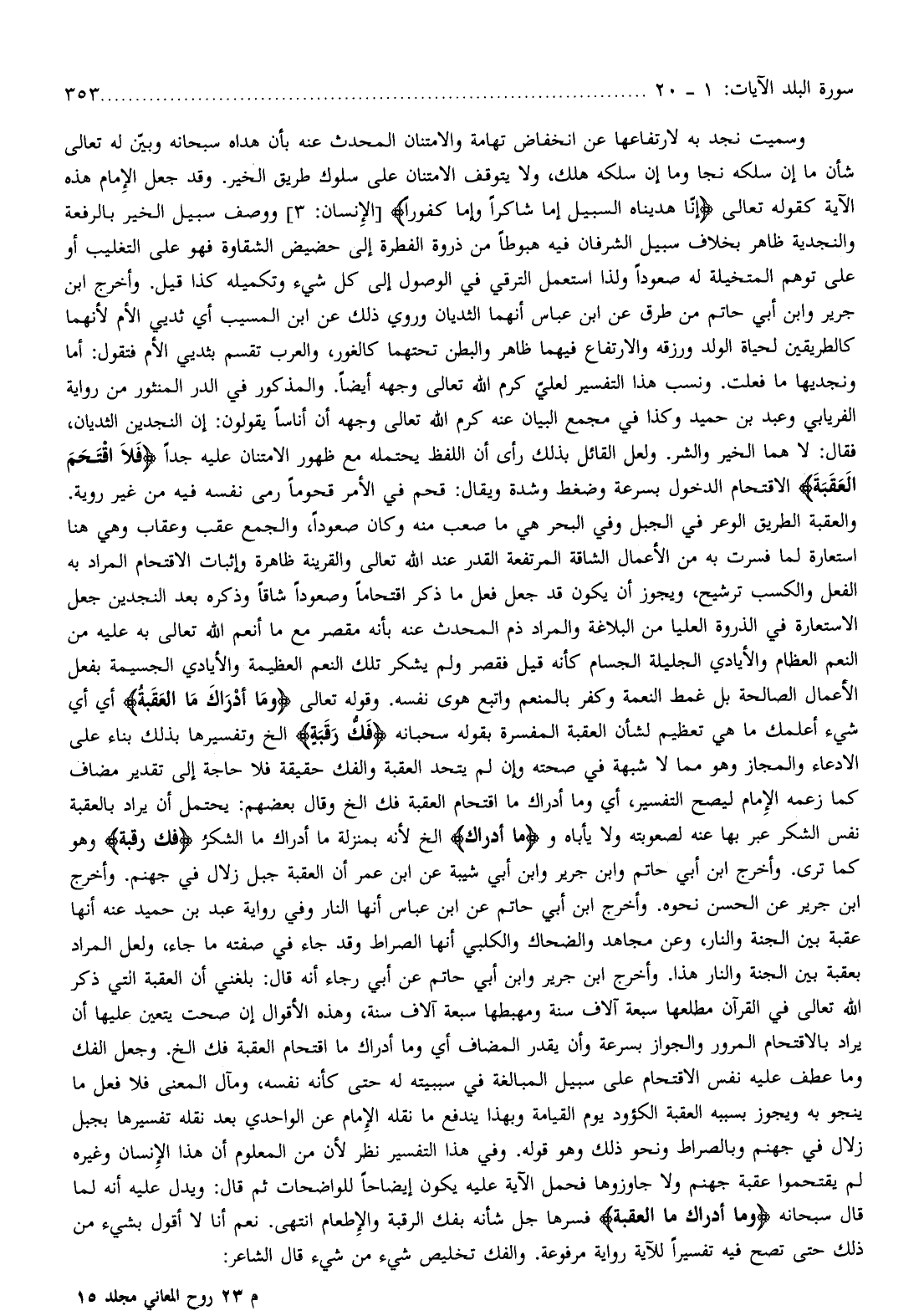 والعقبة الطريق الوعر في الجبل وفي البحر هي ما صعب منه وكان صعودا، والجمع عقب وعقاب وهي هنا استعارة لما فسرت به من الأعمال الشاقة المرتفعة القدر عند الله تعالى والقرينة ظاهرة وإثبات الاقتحام المراد به الفعل والكسب ترشيح، ويجوز أن يكون قد جعل فعل ما ذكر اقتحاما وصعودا شاقا وذكره بعد النجدين جعل الاستعارة في الذروة العليا من البلاغة والمراد ذم المحدث عنه بأنه مقصر مع ما أنعم الله تعالى به عليه من النعم العظام والأيادي الجليلة الجسام كأنه قيل فقصر ولم يشكر تلك النعم العظيمة والأيادي الجسيمة بفعل الأعمال الصالحة بل غمط النعمة وكفر بالمنعم واتبع هوى نفسه. وقوله تعالى وَما أَدْراكَ مَا الْعَقَبَةُ أي أي شيء أعلمك ما هي تعظيم لشأن العقبة المفسرة بقوله سبحانه فَكُّ رَقَبَةٍ إلخ وتفسيرها بذلك بناء على الادعاء والمجاز وهو مما لا شبهة في صحته وإن لم يتحد العقبة والفك حقيقة فلا حاجة إلى تقدير مضاف كما زعمه الإمام ليصح التفسير، أي وما أدراك ما اقتحام العقبة فك إلخ وقال بعضهم: يحتمل أن يراد بالعقبة نفس الشكر عبر بها عنه لصعوبته ولا يأباه وما أَدْراكَ إلخ لأنه بمنزلة ما أدراك ما الشكر فَكُّ رَقَبَةٍ وهو كما ترى. وأخرج ابن أبي حاتم وابن جرير وابن أبي شيبة عن ابن عمر أن العقبة جبل زلال في جهنم. وأخرج ابن جرير عن الحسن نحوه. وأخرج ابن أبي حاتم عن ابن عباس أنها النار وفي رواية عبد بن حميد عنه أنها عقبة بين الجنة والنار، وعن مجاهد والضحاك والكلبي أنها الصراط وقد جاء في صفته ما جاء، ولعل المراد بعقبة بين الجنة والنار هذا. وأخرج ابن جرير وابن أبي حاتم عن أبي رجاء أنه قال: بلغني أن العقبة التي ذكر الله تعالى في القرآن مطلعها سبعة آلاف سنة ومهبطها سبعة آلاف سنة، وهذه الأقوال إن صحت يتعين عليها أن يراد بالاقتحام المرور والجواز بسرعة وأن يقدر المضاف أي وما أدراك ما اقتحام العقبة فك إلخ. وجعل الفك وما عطف عليه نفس الاقتحام على سبيل المبالغة في سببيته له حتى كأنه نفسه، ومآل المعنى فلا فعل ما ينجو به ويجوز بسببه العقبة الكؤود يوم القيامة وبهذا يندفع ما نقله الإمام عن الواحدي بعد نقله تفسيرها بجبل زلال في جهنم وبالصراط ونحو ذلك وهو قوله. وفي هذا التفسير نظر لأن من المعلوم أن هذا الإنسان وغيره لم يقتحموا عقبة جهنم ولا جاوزوها فحمل الآية عليه يكون إيضاحا للواضحات ثم قال: ويدل عليه أنه لما قال سبحانه وَما أَدْراكَ مَا الْعَقَبَةُ فسرها جل شأنه بفك الرقبة والإطعام انتهى. نعم أنا لا أقول بشيء من ذلك حتى تصح فيه تفسيرا للآية رواية مرفوعة. والفك تخليص شيء من شيء قال الشاعر: