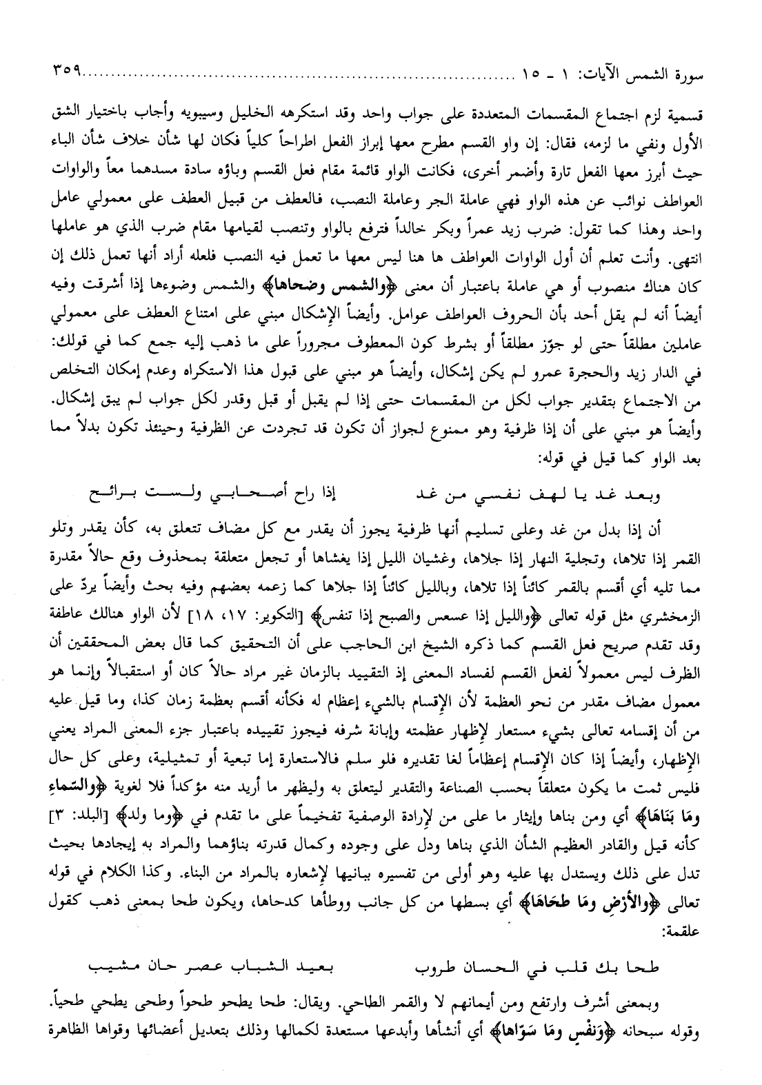 قسمية لزم اجتماع المقسمات المتعددة على جواب واحد وقد استكرهه الخليل وسيبويه وأجاب باختيار الشق الأول ونفي ما لزمه، فقال: إن واو القسم مطرح معها إبراز الفعل اطراحا كليا فكان لها شأن خلاف شأن الباء حيث أبرز معها الفعل تارة وأضمر أخرى، فكانت الواو قائمة مقام فعل القسم وباؤه سادة مسدهما معا والواوات العواطف نوائب عن هذه الواو فهي عاملة الجر وعاملة النصب، فالعطف من قبيل العطف على معمولي عامل واحد وهذا كما تقول: ضرب زيد عمرا وبكر خالدا فترفع بالواو وتنصب لقيامها مقام ضرب الذي هو عاملها انتهى. وأنت تعلم أن أول الواوات العواطف هاهنا ليس معها ما تعمل فيه النصب فلعله أراد أنها تعمل ذلك إن كان هناك منصوب أو هي عاملة باعتبار أن معنى وَالشَّمْسِ وَضُحاها والشمس وضوءها إذا أشرقت وفيه أيضا أنه لم يقل أحد بأن الحروف العواطف عوامل. وأيضا الإشكال مبني على امتناع العطف على معمولي عاملين مطلقا حتى لو جوّز مطلقا أو بشرط كون المعطوف مجرورا على ما ذهب إليه جمع كما في قولك: