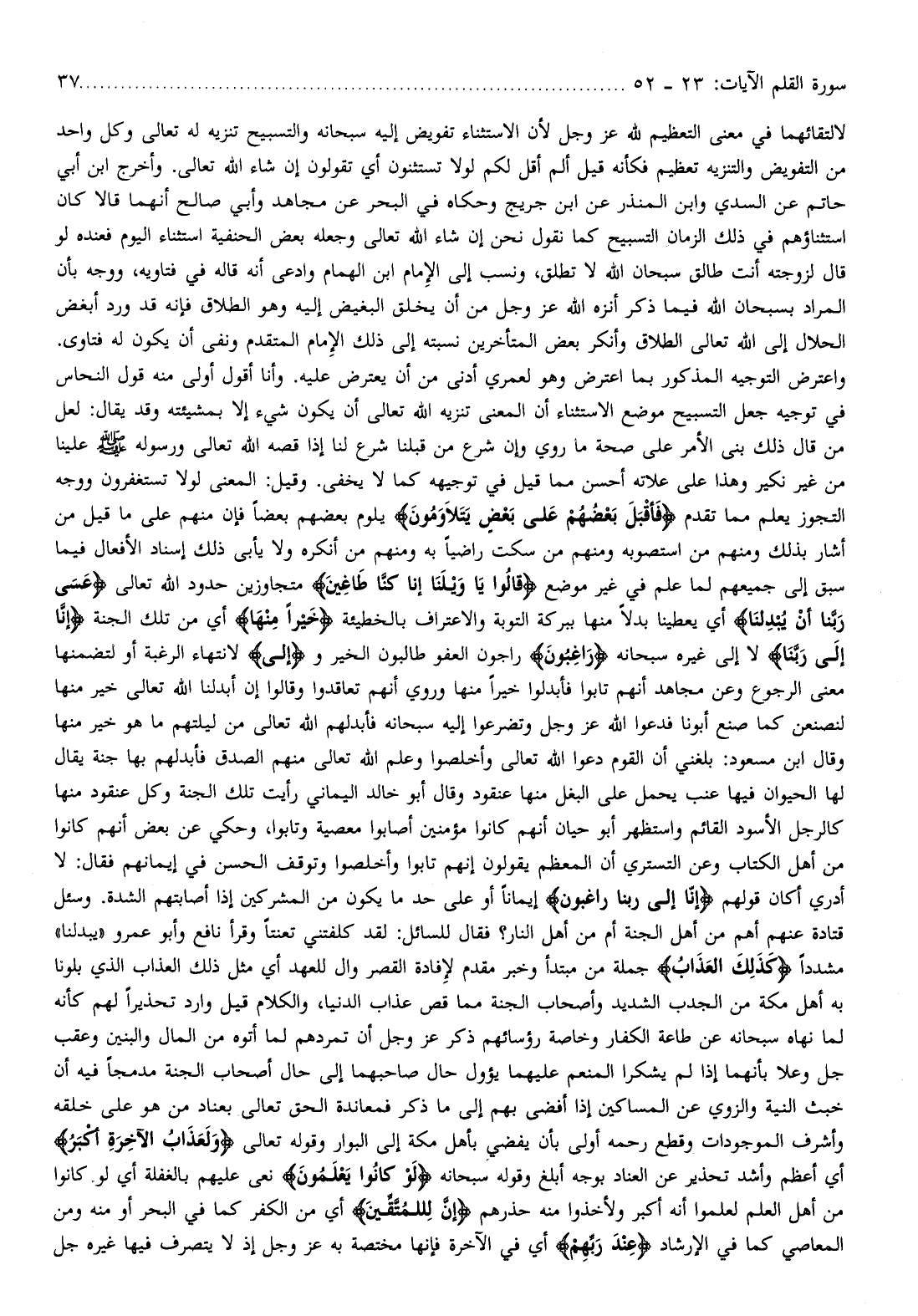 واعترض التوجيه المذكور بما اعترض وهو لعمري أدنى من أن يعترض عليه. وأنا أقول أولى منه قول النحاس في توجيه جعل التسبيح موضع الاستثناء أن المعنى تنزيه الله تعالى أن يكون شيء إلا بمشيئته وقد يقال: لعل من قال ذلك بنى الأمر على صحة ما روي وإن شرع من قبلنا شرع لنا إذا قصه الله تعالى ورسوله صلّى الله عليه وسلم علينا من غير نكير وهذا على علاته أحسن مما قيل في توجيهه كما لا يخفى. وقيل: المعنى لولا تستغفرون ووجه التجوز يعلم مما تقدم فَأَقْبَلَ بَعْضُهُمْ عَلى بَعْضٍ يَتَلاوَمُونَ يلوم بعضهم بعضا فإن منهم على ما قيل من أشار بذلك ومنهم من استصوبه ومنهم من سكت راضيا به ومنهم من أنكره ولا يأبى ذلك إسناد الأفعال فيما سبق إلى جميعهم لما علم في غير موضع قالُوا يا وَيْلَنا إِنَّا كُنَّا طاغِينَ متجاوزين حدود الله تعالى عَسى رَبُّنا أَنْ يُبْدِلَنا أي يعطينا بدلا منها ببركة التوبة والاعتراف بالخطيئة خَيْراً مِنْها أي من تلك الجنة إِنَّا إِلى رَبِّنا لا إلى غيره سبحانه راغِبُونَ راجون العفو طالبون الخير وإِلى لانتهاء الرغبة أو لتضمنها معنى الرجوع وعن مجاهد أنهم تابوا فأبدلوا خيرا منها وروي أنهم تعاقدوا وقالوا إن أبدلنا الله تعالى خير منها لنصنعن كما صنع أبونا فدعوا الله عز وجل وتضرعوا إليه سبحانه فأبدلهم الله تعالى من ليلتهم ما هو خير منها وقال ابن مسعود: بلغني أن القوم دعوا الله تعالى وأخلصوا وعلم الله تعالى منهم الصدق فأبدلهم بها جنة يقال لها الحيوان فيها عنب يحمل على البغل منها عنقود وقال أبو خالد اليماني رأيت تلك الجنة وكل عنقود منها كالرجل الأسود القائم واستظهر أبو حيان أنهم كانوا مؤمنين أصابوا معصية وتابوا، وحكي عن بعض أنهم كانوا من أهل الكتاب وعن التستري أن المعظم يقولون إنهم تابوا وأخلصوا وتوقف الحسن في إيمانهم فقال: لا أدري أكان قولهم إِنَّا إِلى رَبِّنا راغِبُونَ إيمانا أو على حد ما يكون من المشركين إذا أصابتهم الشدة. وسئل قتادة عنهم أهم من أهل الجنة أم من أهل النار؟ فقال للسائل: لقد كلفتني تعنتا وقرأ نافع وأبو عمرو «يبدلنا» مشددا كَذلِكَ الْعَذابُ جملة من مبتدأ وخبر مقدم لإفادة القصر وال للعهد أي مثل ذلك العذاب الذي بلونا به أهل مكة من الجدب الشديد وأصحاب الجنة مما قص عذاب الدنيا، والكلام قيل وارد تحذيرا لهم كأنه لما نهاه سبحانه عن طاعة الكفار وخاصة رؤسائهم ذكر عز وجل أن تمردهم لما أتوه من المال والبنين وعقب جل وعلا بأنهما إذا لم يشكرا المنعم عليهما يؤول حال صاحبهما إلى حال أصحاب الجنة مدمجا فيه أن خبث النية والزوي عن المساكين إذا أفضى بهم إلى ما ذكر فمعاندة الحق تعالى بعناد من هو على خلقه وأشرف الموجودات وقطع رحمه أولى بأن يفضي بأهل مكة إلى البوار وقوله تعالى وَلَعَذابُ الْآخِرَةِ أَكْبَرُ أي أعظم وأشد تحذير عن العناد بوجه أبلغ وقوله سبحانه لَوْ كانُوا يَعْلَمُونَ نعى عليهم بالغفلة أي لو كانوا من أهل العلم لعلموا أنه أكبر ولأخذوا منه حذرهم إِنَّ لِلْمُتَّقِينَ أي من الكفر كما في البحر أو منه ومن المعاصي كما في الإرشاد عِنْدَ رَبِّهِمْ أي في الآخرة فإنها مختصة به عز وجل إذ لا يتصرف فيها غيره جل