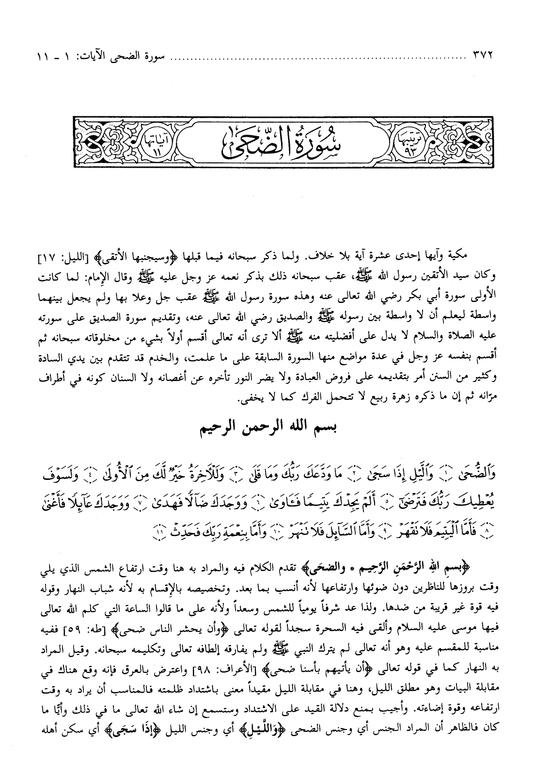 بِسْمِ اللَّهِ الرَّحْمنِ الرَّحِيمِ وَالضُّحى تقدم الكلام فيه والمراد به هنا وقت ارتفاع الشمس الذي يلي وقت بروزها للناظرين دون ضوئها وارتفاعها لأنه أنسب بما بعد. وتخصيصه بالإقسام به لأنه شباب النهار وقوله فيه قوة غير قريبة من ضدها. ولذا عد شرفا يوميا للشمس وسعدا ولأنه على ما قالوا الساعة التي كلم الله تعالى فيها موسى عليه السلام وألقى فيه السحرة سجدا لقوله تعالى وَأَنْ يُحْشَرَ النَّاسُ ضُحًى [طه: 59] ففيه مناسبة للمقسم عليه وهو أنه تعالى لم يترك النبي صلّى الله عليه وسلم ولم يفارقه إلطافه تعالى وتكليمه سبحانه. وقيل المراد به النهار كما في قوله تعالى أَنْ يَأْتِيَهُمْ بَأْسُنا ضُحًى [الأعراف: 98] واعتراض بالعرق فإنه وقع هناك في مقابلة البيات وهو مطلق الليل، وهنا في مقابلة الليل مقيدا معنى باشتداد ظلمته فالمناسب أن يراد به وقت ارتفاعه وقوة إضاءته. وأجيب بمنع دلالة القيد على الاشتداد وستسمع إن شاء الله تعالى ما في ذلك وأيّا ما كان فالظاهر أن المراد الجنس أي وجنس الضحى وَاللَّيْلِ أي وجنس الليل إِذا سَجى أي سكن أهله