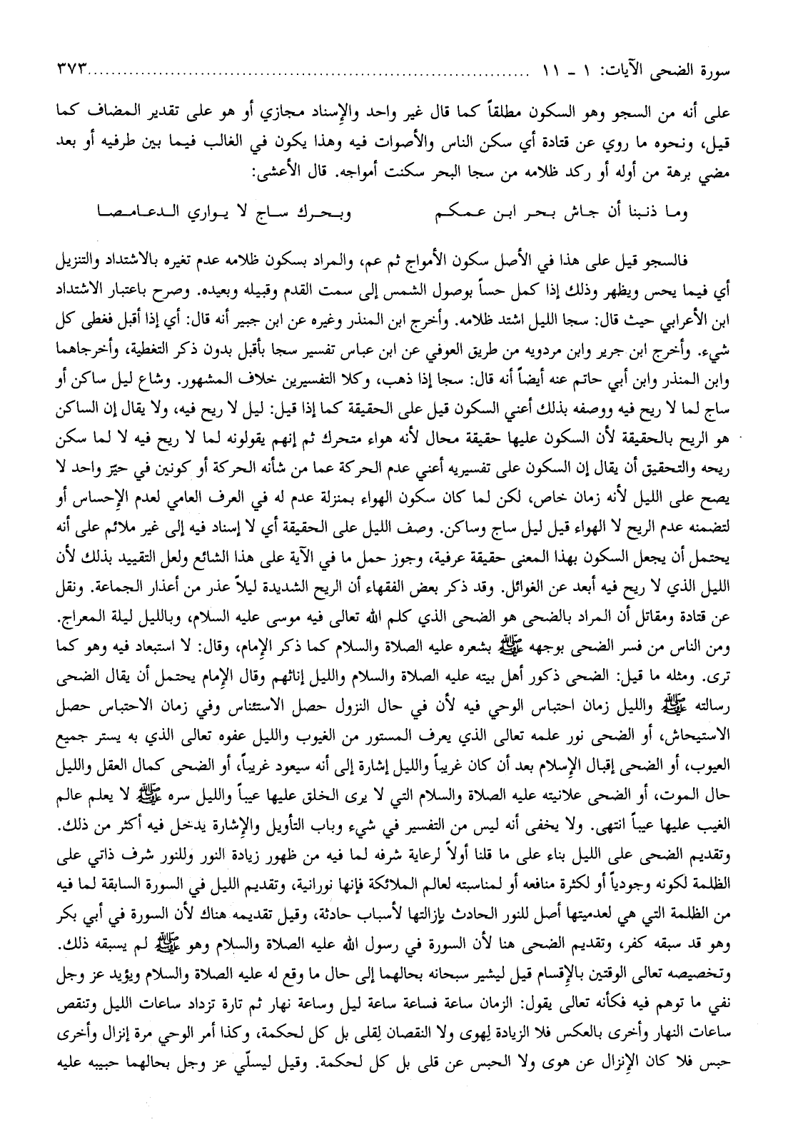 فالسجو قيل على هذا في الأصل سكون الأمواج ثم عم، والمراد بسكون ظلامه عدم تغيره بالاشتداد والتنزيل أي فيما يحس ويظهر وذلك إذا كمل حسا بوصول الشمس إلى سمت القدم وقبيله وبعيده. وصرح باعتبار الاشتداد ابن الأعرابي حيث قال: سجا الليل اشتد ظلامه. وأخرج ابن المنذر وغيره عن ابن جبير أنه قال: أي إذا أقبل فغطى كل شيء. وأخرج ابن جرير وابن مردويه من طريق العوفي عن ابن عباس تفسير سجا بأقبل بدون ذكر التغطية، وأخرجاهما وابن المنذر وابن أبي حاتم عنه أيضا أنه قال: سجا إذا ذهب، وكلا التفسيرين خلاف المشهور. وشاع ليل ساكن أو ساج لما لا ريح فيه ووصفه بذلك أعني السكون قيل على الحقيقة كما إذا قيل: ليل لا ريح فيه، ولا يقال إن الساكن هو الريح بالحقيقة لأن السكون عليها حقيقة محال لأنه هواء متحرك ثم إنهم يقولونه لما لا ريح فيه لا لما سكن ريحه والتحقيق أن يقال إن السكون على تفسيريه أعني عدم الحركة عما من شأنه الحركة أو كونين في حيّز واحد لا يصح على الليل لأنه زمان خاص، لكن لما كان سكون الهواء بمنزلة عدم له في العرف العامي لعدم الإحساس أو لتضمنه عدم الريح لا الهواء قيل ليل ساج وساكن. وصف الليل على الحقيقة أي لا إسناد فيه إلى غير ملائم على أنه يحتمل أن يجعل السكون بهذا المعنى حقيقة عرفية، وجوز حمل ما في الآية على هذا الشائع ولعل التقييد بذلك لأن الليل الذي لا ريح فيه أبعد عن الغوائل. وقد ذكر بعض الفقهاء أن الريح الشديدة ليلا عذر من أعذار الجماعة. ونقل عن قتادة ومقاتل أن المراد بالضحى هو الضحى الذي كلم الله تعالى فيه موسى عليه السلام، وبالليل ليلة المعراج.