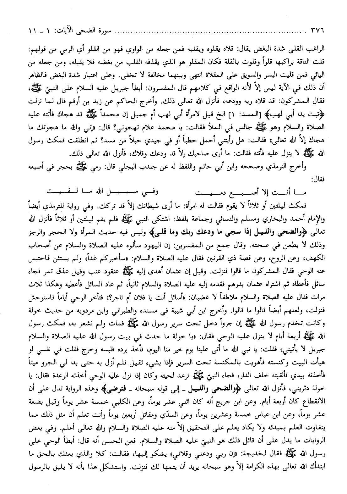 وفي رواية للترمذي أيضا والإمام أحمد والبخاري ومسلم والنسائي وجماعة بلفظ: اشتكى النبي صلّى الله عليه وسلم فلم يقم ليلتين أو ثلاثا فأنزل الله تعالى وَالضُّحى وَاللَّيْلِ إِذا سَجى ما وَدَّعَكَ رَبُّكَ وَما قَلى