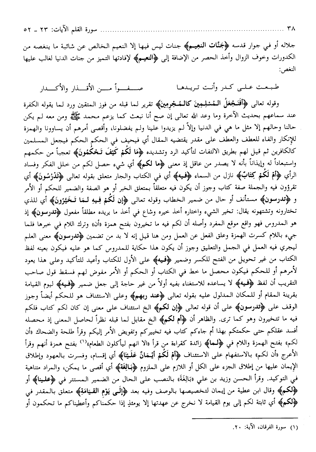وقوله تعالى أَفَنَجْعَلُ الْمُسْلِمِينَ كَالْمُجْرِمِينَ تقرير لما قبله من فوز المتقين ورد لما يقوله الكفرة عند سماعهم بحديث الآخرة وما وعد الله تعالى إن صح أنا نبعث كما يزعم محمد صلّى الله عليه وسلم ومن معه لم يكن حالنا وحالهم إلا مثل ما هي في الدنيا وإلّا لم يزيدوا علينا ولم يفضلونا، وأقصى أمرهم أن يساوونا والهمزة للإنكار والفاء للعطف والعطف على مقدر يقتضيه المقال أي فيحيف في الحكم الحكم فيجعل المسلمين كالكافرين ثم قيل لهم بطريق الالتفات لتأكيد الرد وتشديده ما لَكُمْ كَيْفَ تَحْكُمُونَ تعجبا من حكمهم واستبعادا له وإيذانا بأنه لا يصدر من عاقل إذ معنى ما لَكُمْ أي شيء حصل لكم من خلل الفكر وفساد الرأي أَمْ لَكُمْ كِتابٌ نازل من السماء فِيهِ أي في الكتاب والجار متعلق بقوله تعالى تَدْرُسُونَ أي تقرءون فيه والجملة صفة كتاب وجوز أن يكون فيه متعلقا بمتعلق الخبر أو هو الصفة والضمير للحكم أو الأمر وتَدْرُسُونَ مستأنف أو حال من ضمير الخطاب وقوله تعالى إِنَّ لَكُمْ فِيهِ لَما تَخَيَّرُونَ أي للذي تختارونه وتشتهونه يقال: تخير الشيء واختاره أخذ خيره وشاع في أخذ ما يريده مطلقا مفعول تَدْرُسُونَ إذ هو المدروس فهو واقع موقع المفرد وأصله أن لكم فيه ما تخيرون بفتح همزة «أن» وترك اللام في خبرها فلما جيء باللام كسرت الهمزة وعلق الفعل عن العمل ومن هنا قيل إنه لا بد من تضمين تَدْرُسُونَ معنى العلم ليجري فيه العمل في الجمل والتعليق وجوز أن يكون هذا حكاية للمدروس كما هو عليه فيكون بعينه لفظ الكتاب من غير تحويل من الفتح للكسر وضمير فِيهِ على الأول للكتاب وأعيد للتأكيد وعلى هذا يعود لأمرهم أو للحكم فيكون محصل ما خط في الكتاب أو الحكم أو الأمر مفوض لهم فسقط قول صاحب التقريب أن لفظ فِيهِ لا يساعده للاستغناء بفيه أولا من غير حاجة إلى جعل ضمير فِيهِ ليوم القيامة بقرينة المقام أو للمكان المدلول عليه بقوله تعالى عِنْدَ رَبِّهِمْ وعلى الاستئناف هو للحكم أيضا وجوز الوقف على تَدْرُسُونَ على أن قوله تعالى إِنَّ لَكُمْ إلخ استئناف على معنى إن كان لكم كتاب فلكم فيه ما تتخيرون وهو كما ترى. والظاهر أن أَمْ لَكُمْ إلخ مقابل لما قبله نظرا لحاصل المعنى إذ محصله أفسد عقلكم حتى حكمتكم بهذا أم جاءكم كتاب فيه تخييركم وتفويض الأمر إليكم وقرأ طلحة والضحاك «أن لكم» بفتح الهمزة واللام في لَما زائدة كقراءة من قرأ «الا انهم ليأكلون الطعام» (¬1) بفتح همزة أنهم وقرأ الأعرج «أن لكم» بالاستفهام على الاستئناف أَمْ لَكُمْ أَيْمانٌ عَلَيْنا أي إقسام، وفسرت بالعهود وإطلاق الإيمان عليها من إطلاق الجزء على الكل أو اللازم على الملزوم بالِغَةٌ أي أقصى ما يمكن، والمراد متناهية في التوكيد. وقرأ الحسن وزيد بن علي «بالغة» بالنصب على الحال من الضمير المستتر في عَلَيْنا أو لَكُمْ وقال ابن عطية من إيمان لتخصيصها بالوصف وفيه بعد إِلى يَوْمِ الْقِيامَةِ متعلق بالمقدر في لَكُمْ أي ثابتة لكم إلى يوم القيامة لا نخرج عن عهدتها إلا يومئذ إذا حكمناكم وأعطيناكم ما تحكمون أو