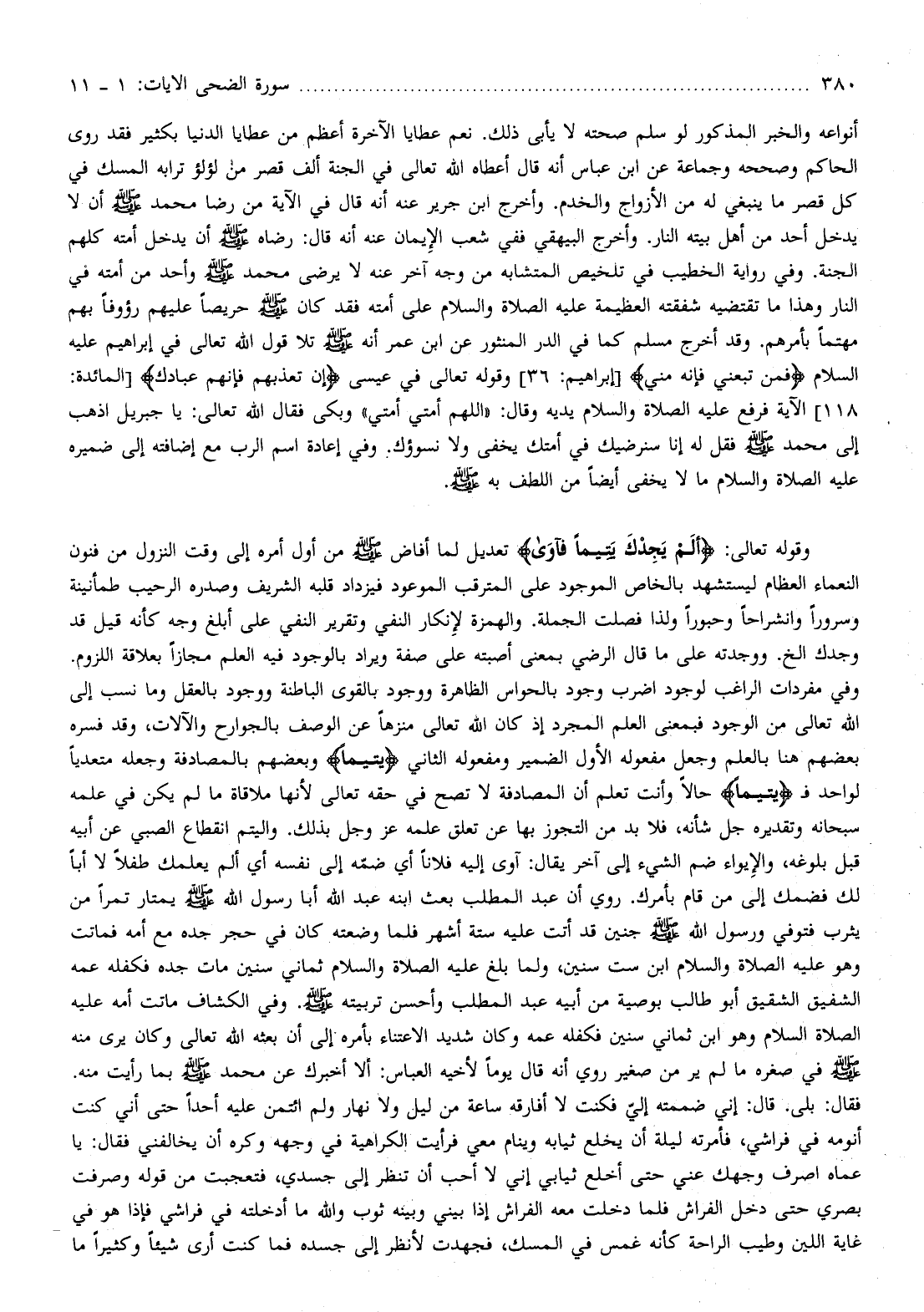 أنواعه والخبر المذكور لو سلم صحته لا يأبى ذلك. نعم عطايا الآخرة أعظم من عطايا الدنيا بكثير فقد روى الحاكم وصححه وجماعة عن ابن عباس أنه قال أعطاه الله تعالى في الجنة ألف قصر من لؤلؤ ترابه المسك في كل قصر ما ينبغي له من الأزواج والخدم. وأخرج ابن جرير عنه أنه قال في الآية من رضا محمد صلّى الله عليه وسلم أن لا يدخل أحد من أهل بيته النار. وأخرج البيهقي ففي شعب الإيمان عنه أنه قال: رضاه صلّى الله عليه وسلم أن يدخل أمته كلهم الجنة. وفي رواية الخطيب في تلخيص المتشابه من وجه آخر عنه لا يرضى محمد صلّى الله عليه وسلم وأحد من أمته في النار وهذا ما تقتضيه شفقته العظيمة عليه الصلاة والسلام على أمته فقد كان صلّى الله عليه وسلم حريصا عليهم رؤوفا بهم مهتما بأمرهم.